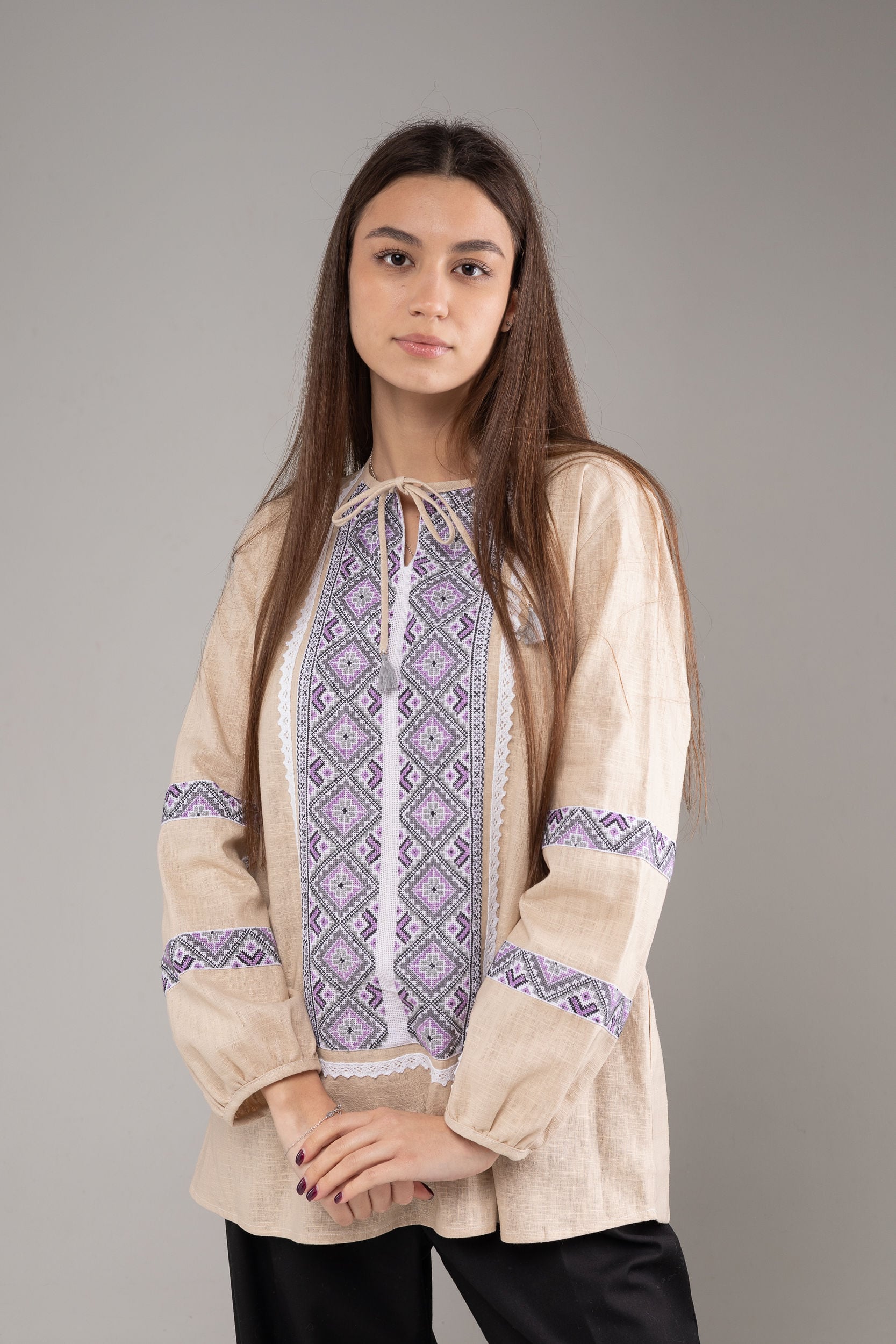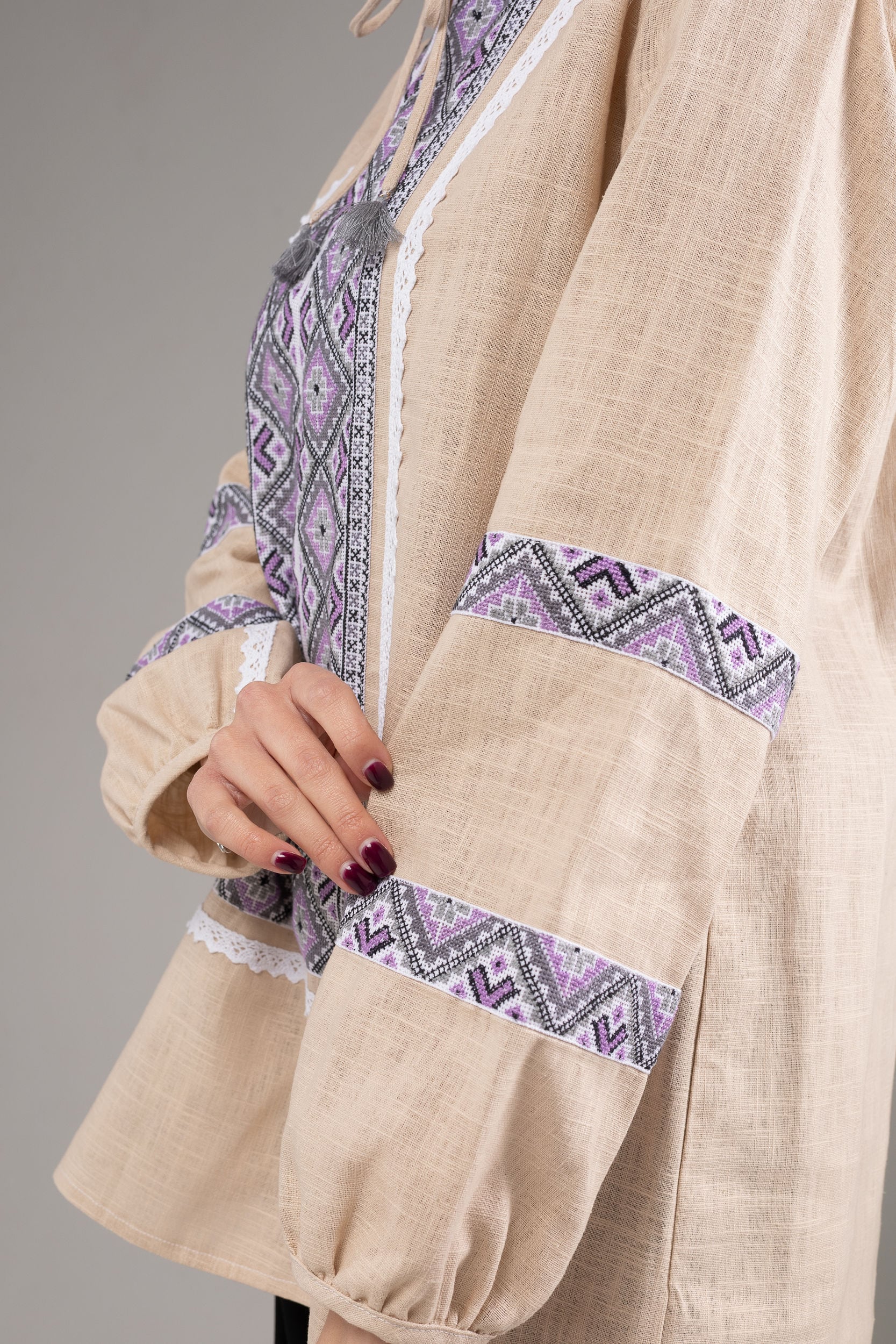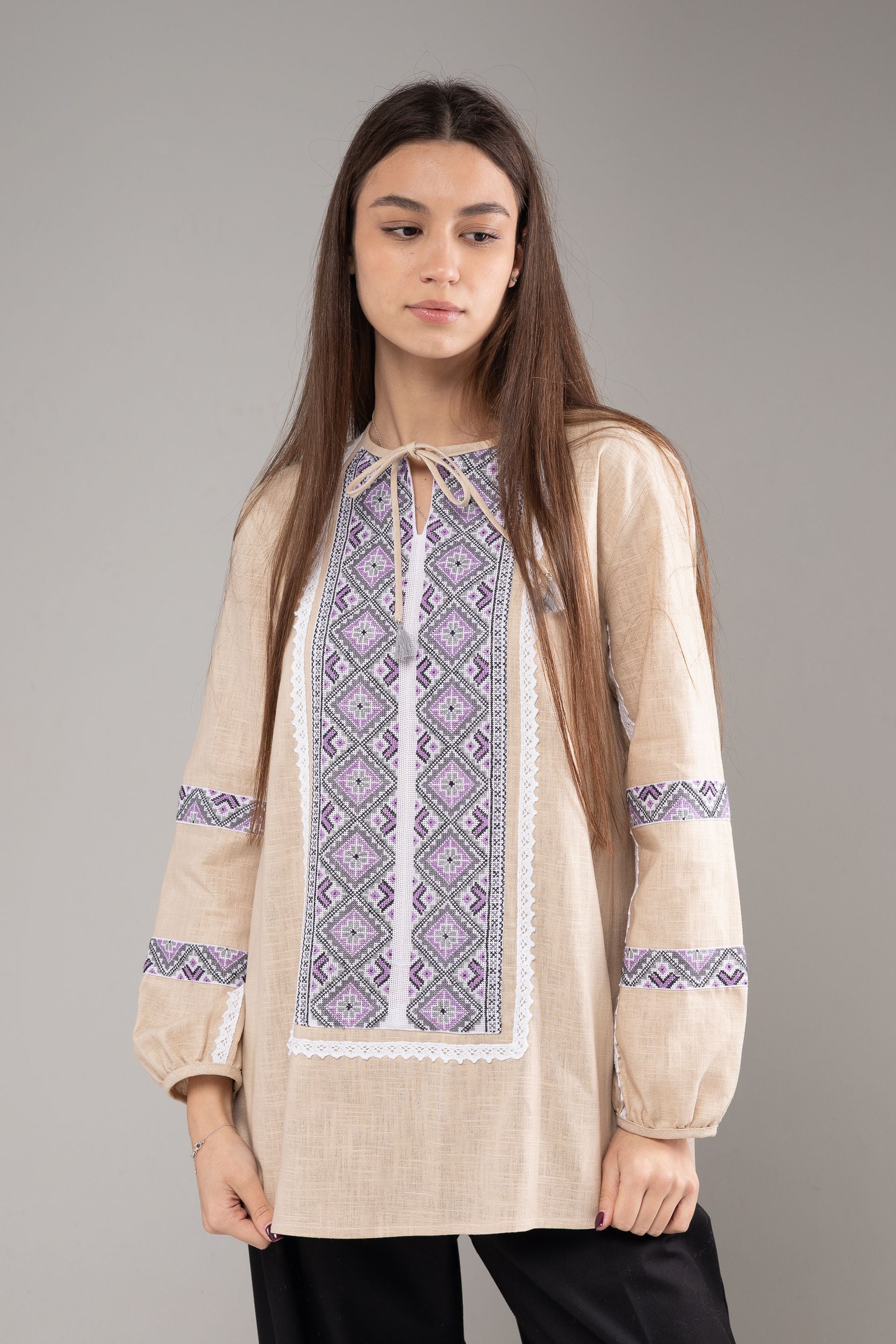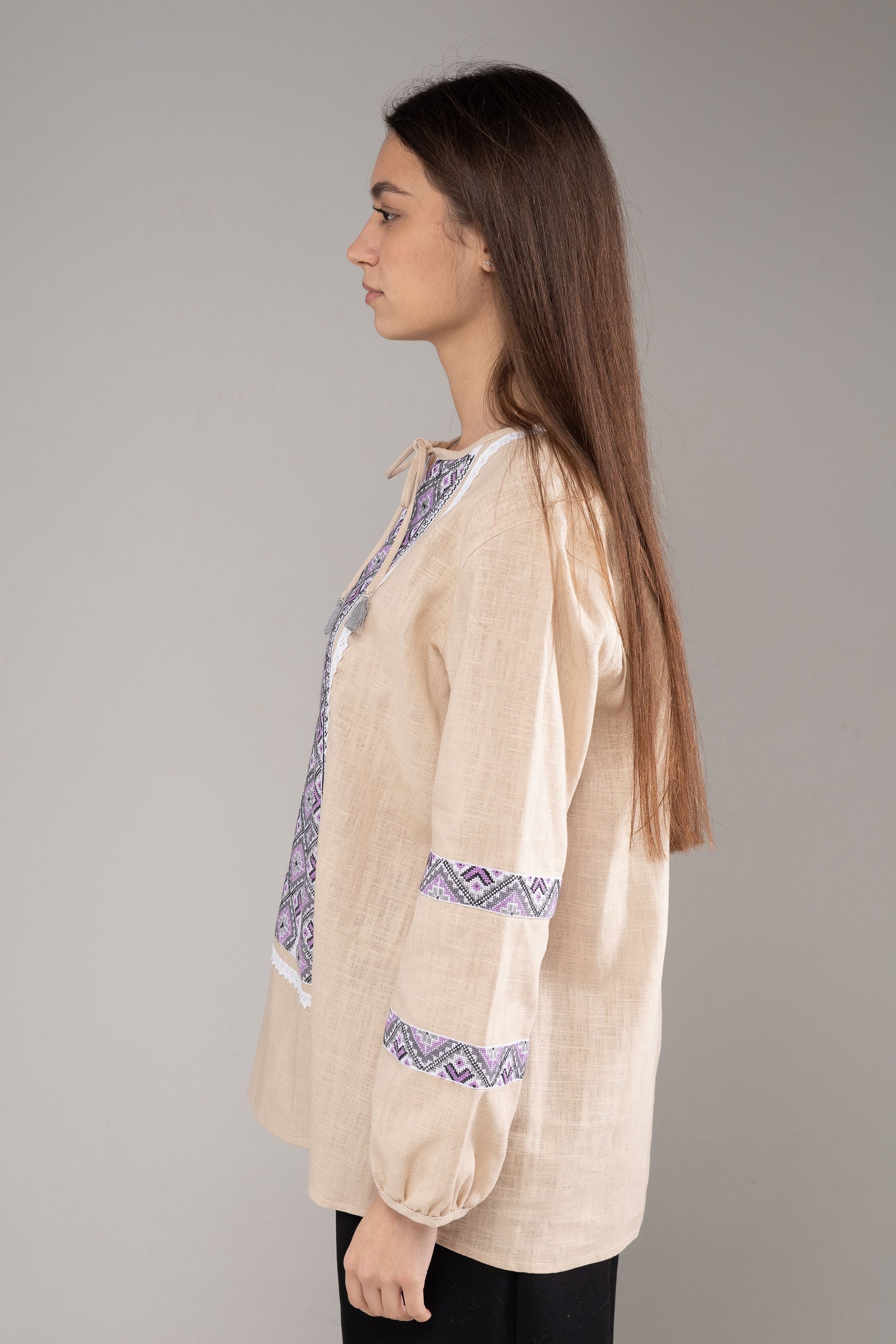 この作品は、ウクライナの伝統と美しさを象徴するヴィシヴァンカの刺繍を採用しています。過度な派手さを追求せず、日本の日常生活に自然に溶け込むデザインとなっております。しかし、それでいて洗練された高級感とカジュアルな雰囲気を両立させ、見る人を魅了する一着となっています。