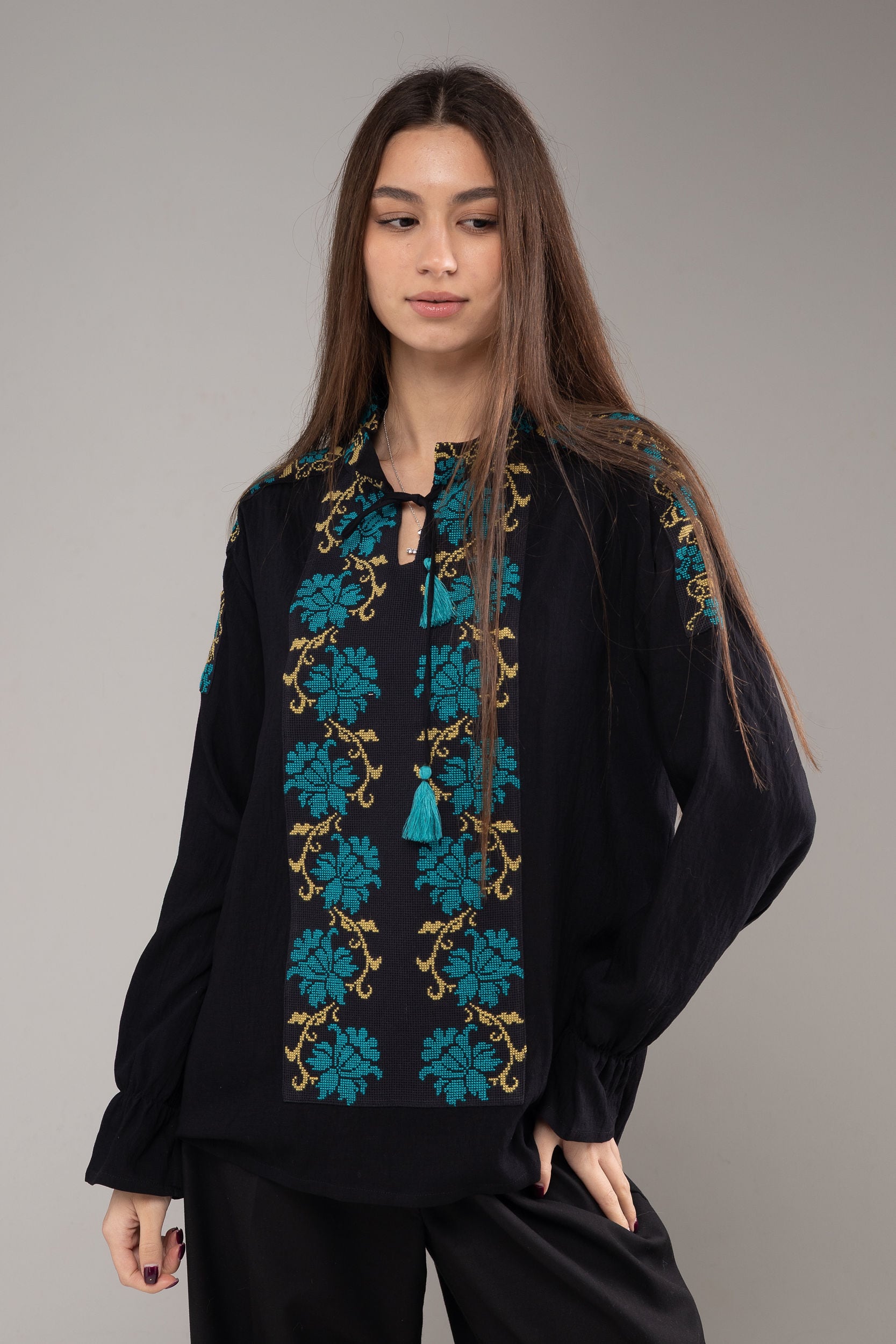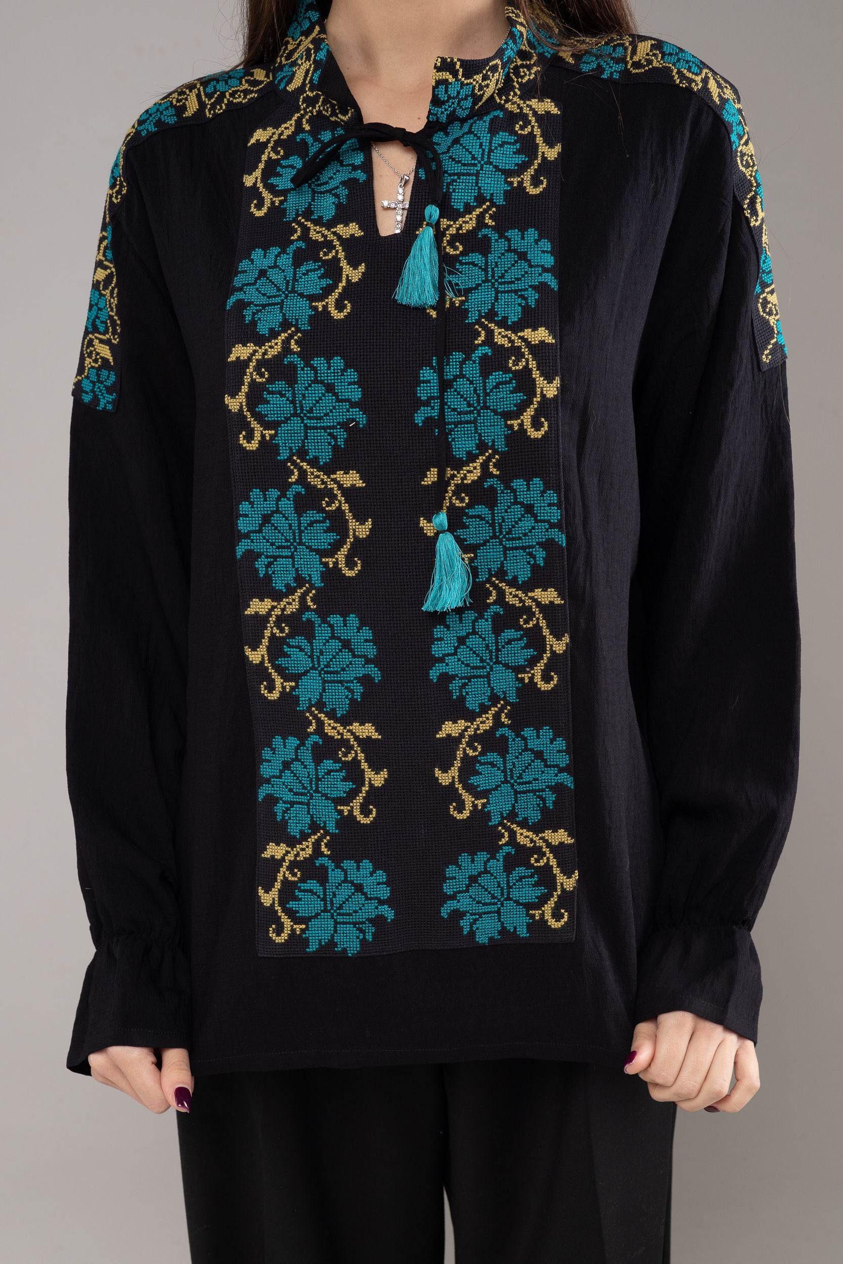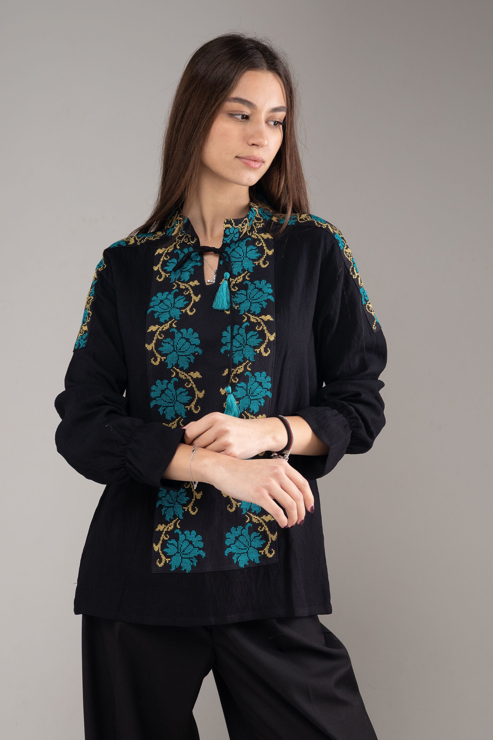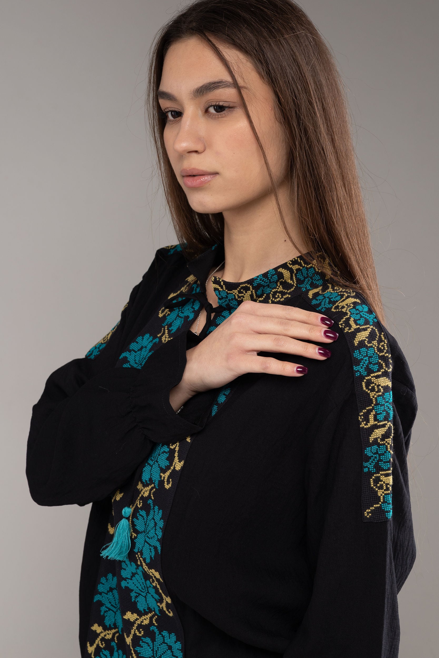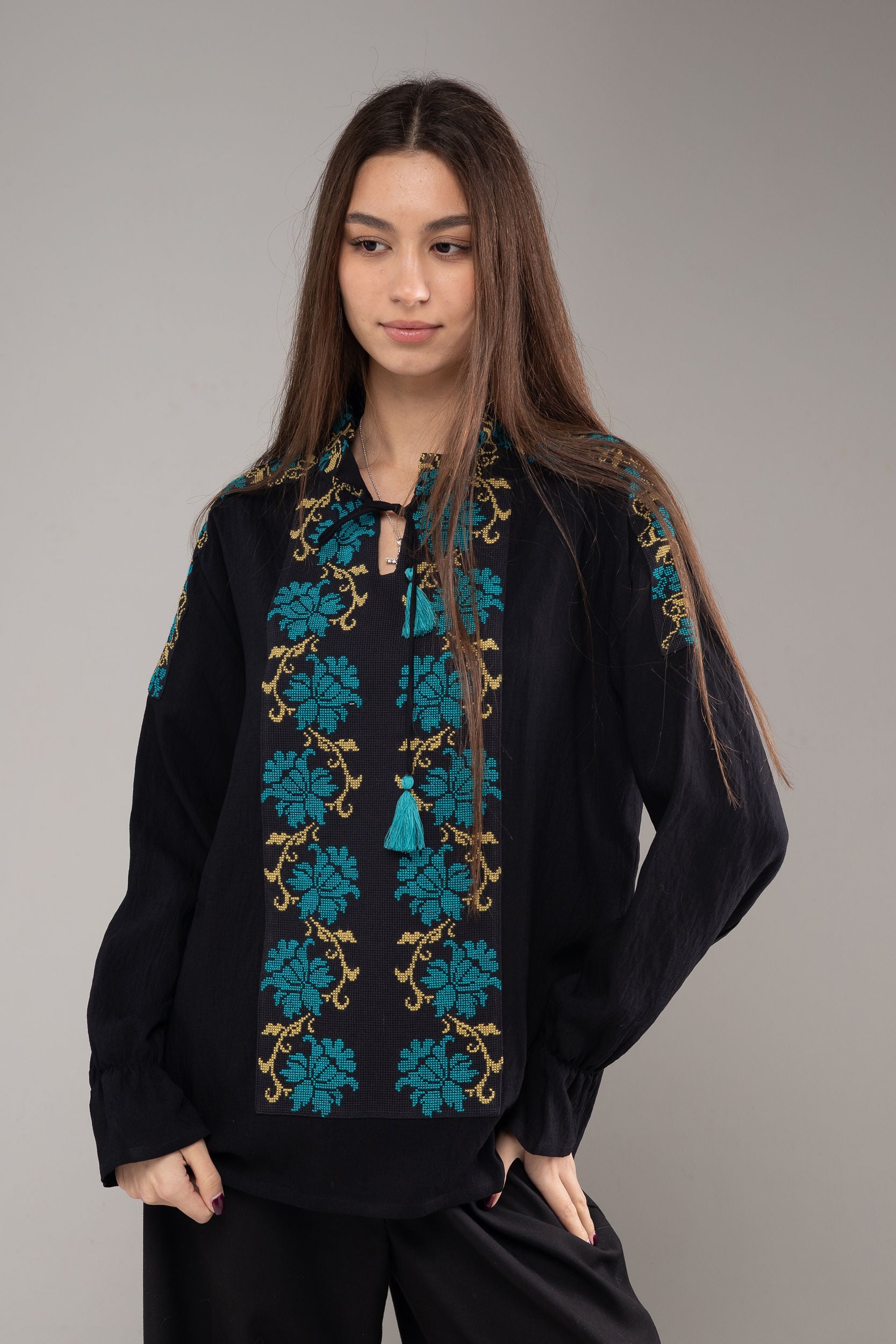 この作品は、ウクライナの伝統と美しさを象徴するヴィシヴァンカの刺繍を採用しています。過度な派手さを追求せず、日本の日常生活に自然に溶け込むデザインとなっております。しかし、それでいて洗練された高級感とカジュアルな雰囲気を両立させ、見る人を魅了する一着となっています。
