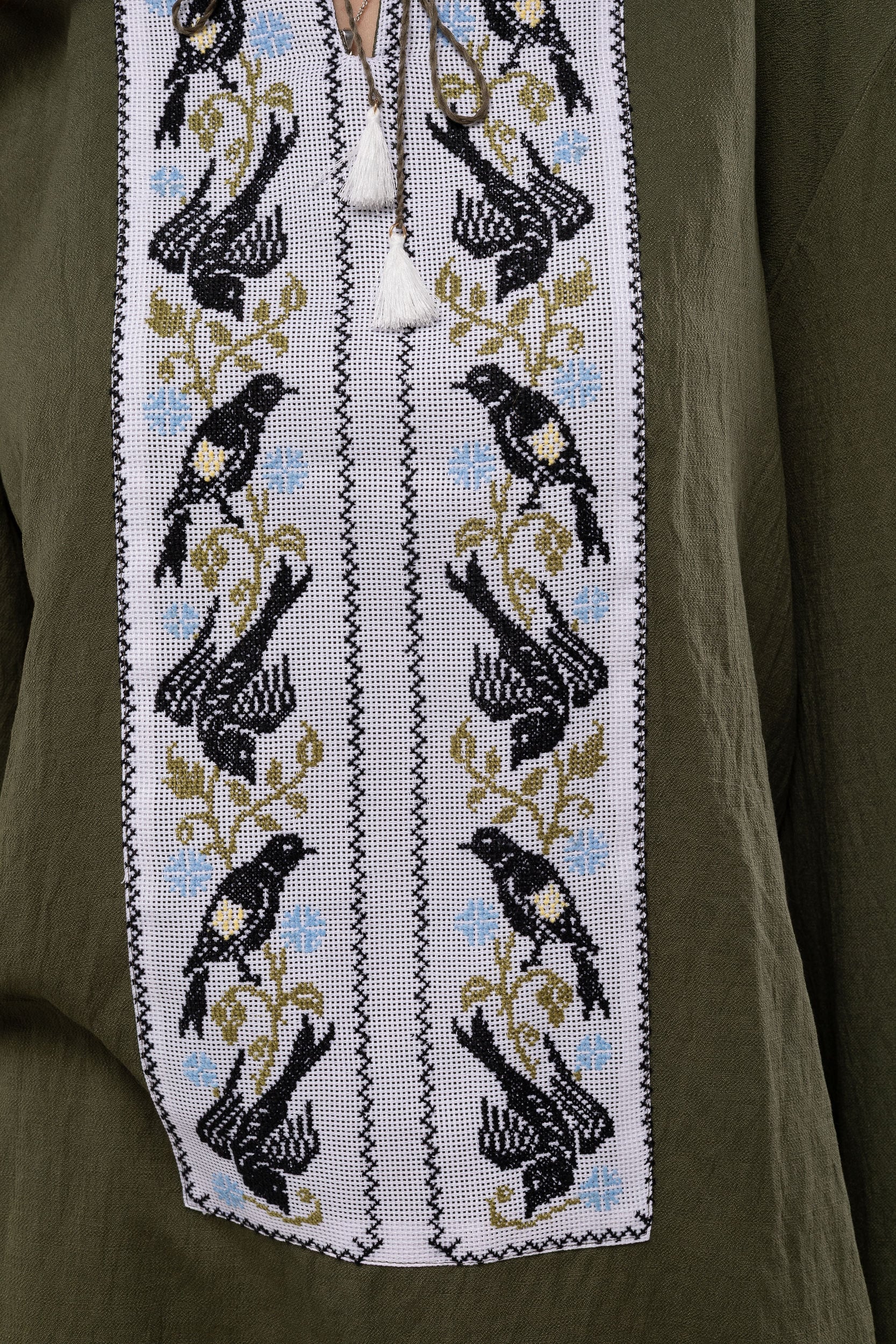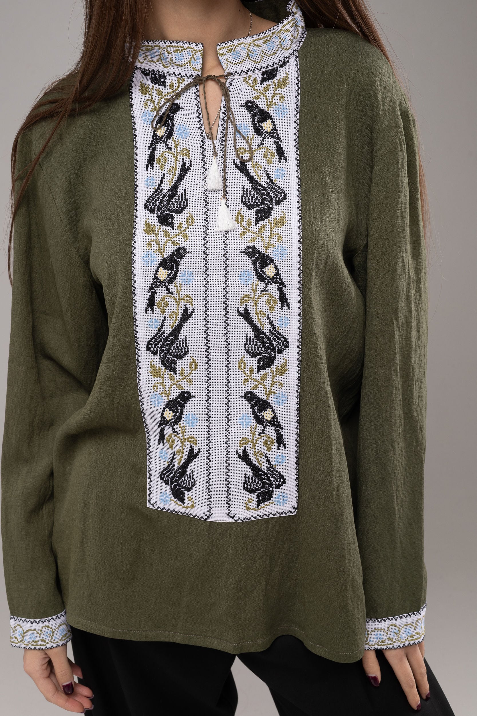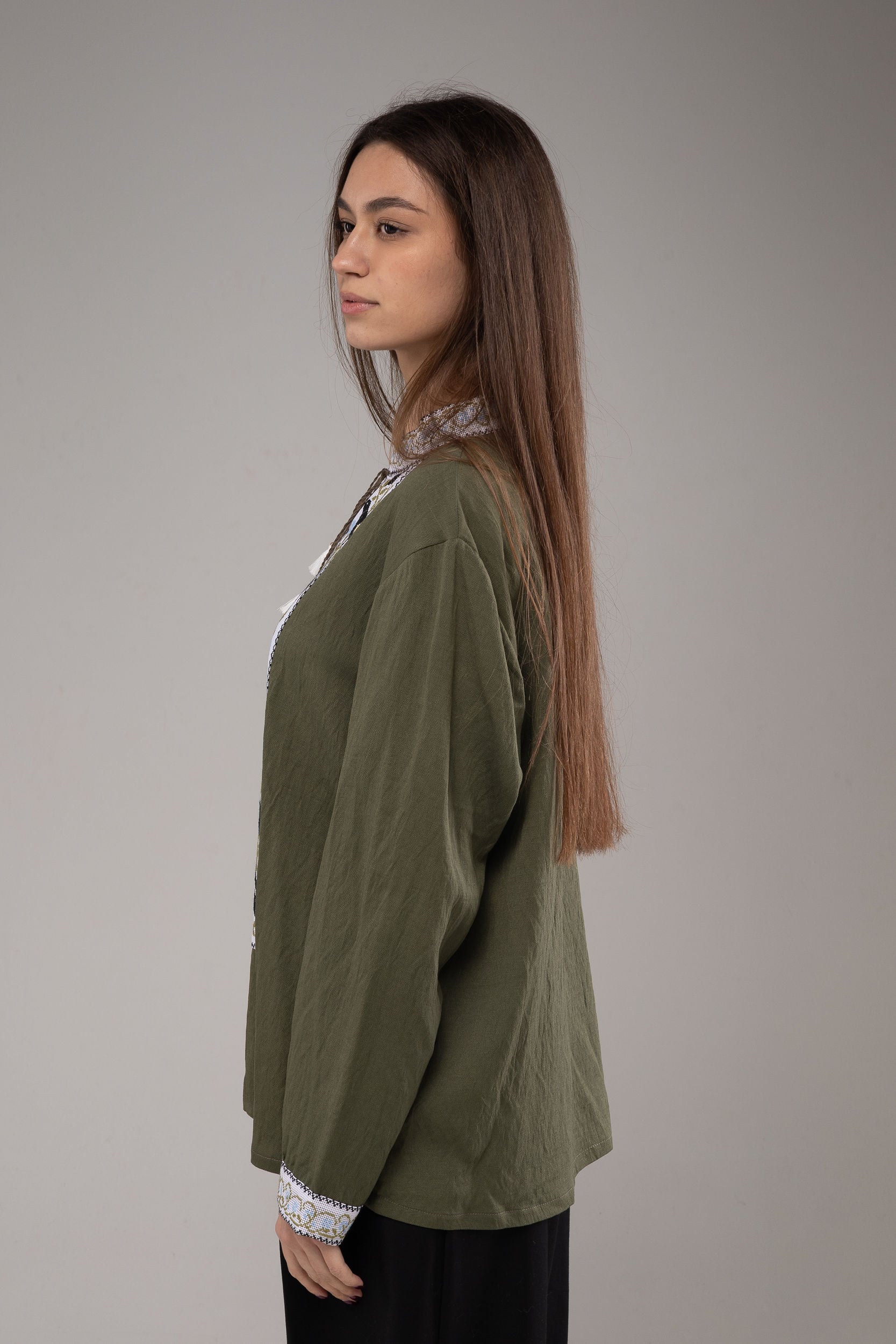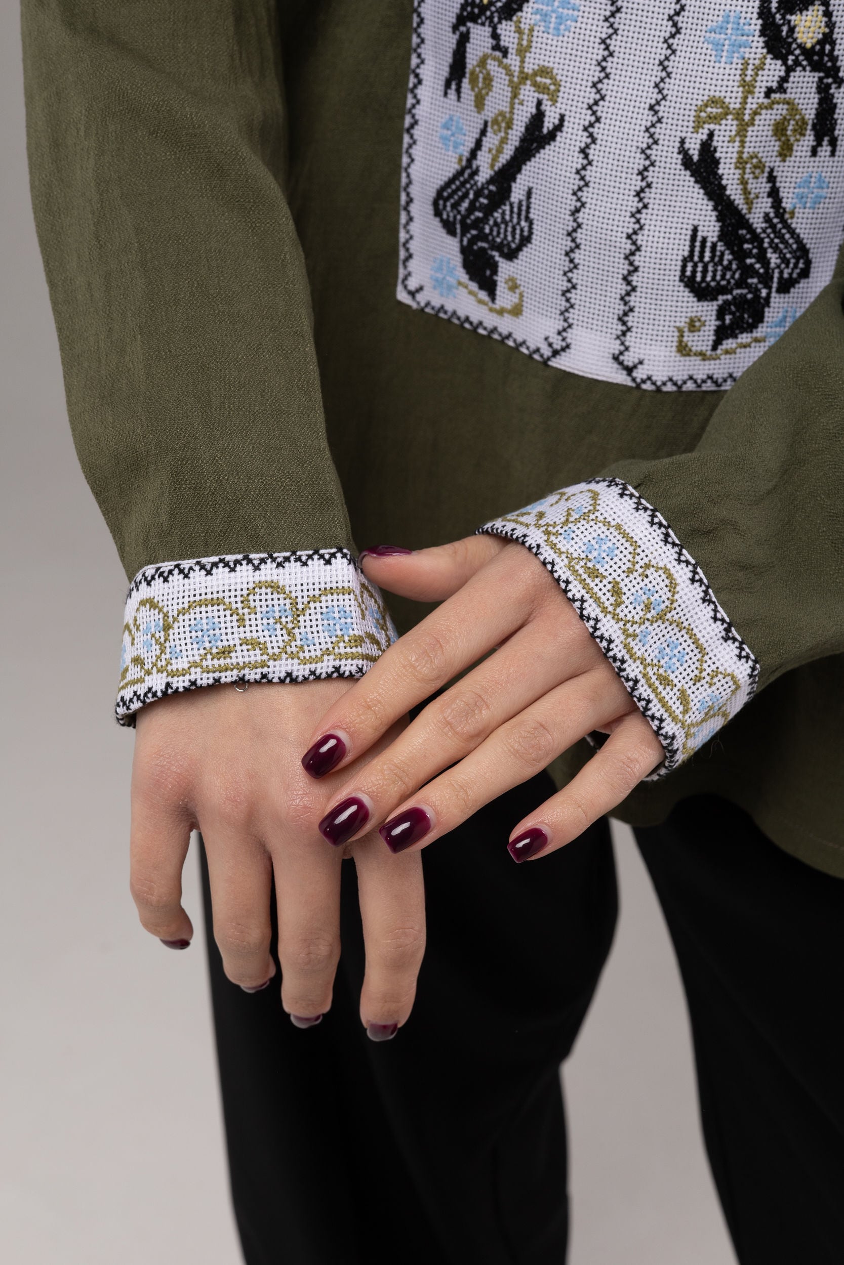 この作品は、ウクライナの伝統と美しさを象徴するヴィシヴァンカの刺繍を採用しています。過度な派手さを追求せず、日本の日常生活に自然に溶け込むデザインとなっております。しかし、それでいて洗練された高級感とカジュアルな雰囲気を両立させ、見る人を魅了する一着となっています。