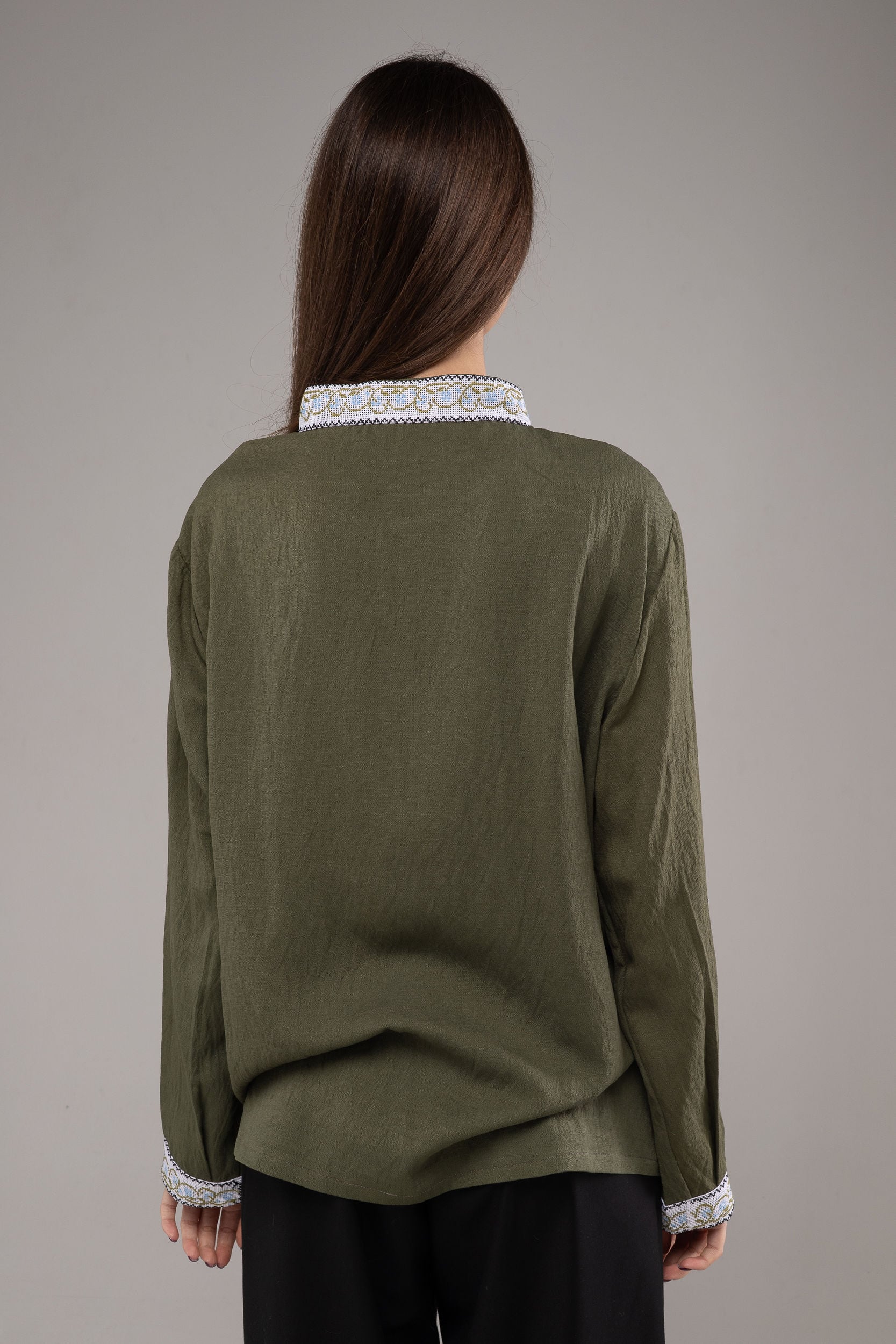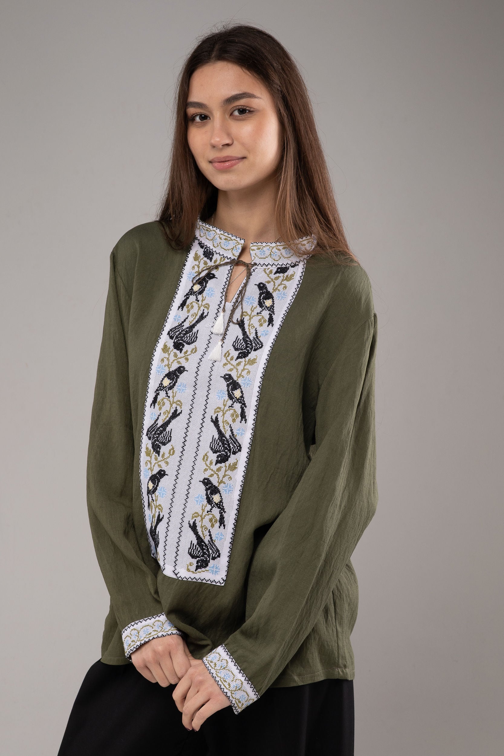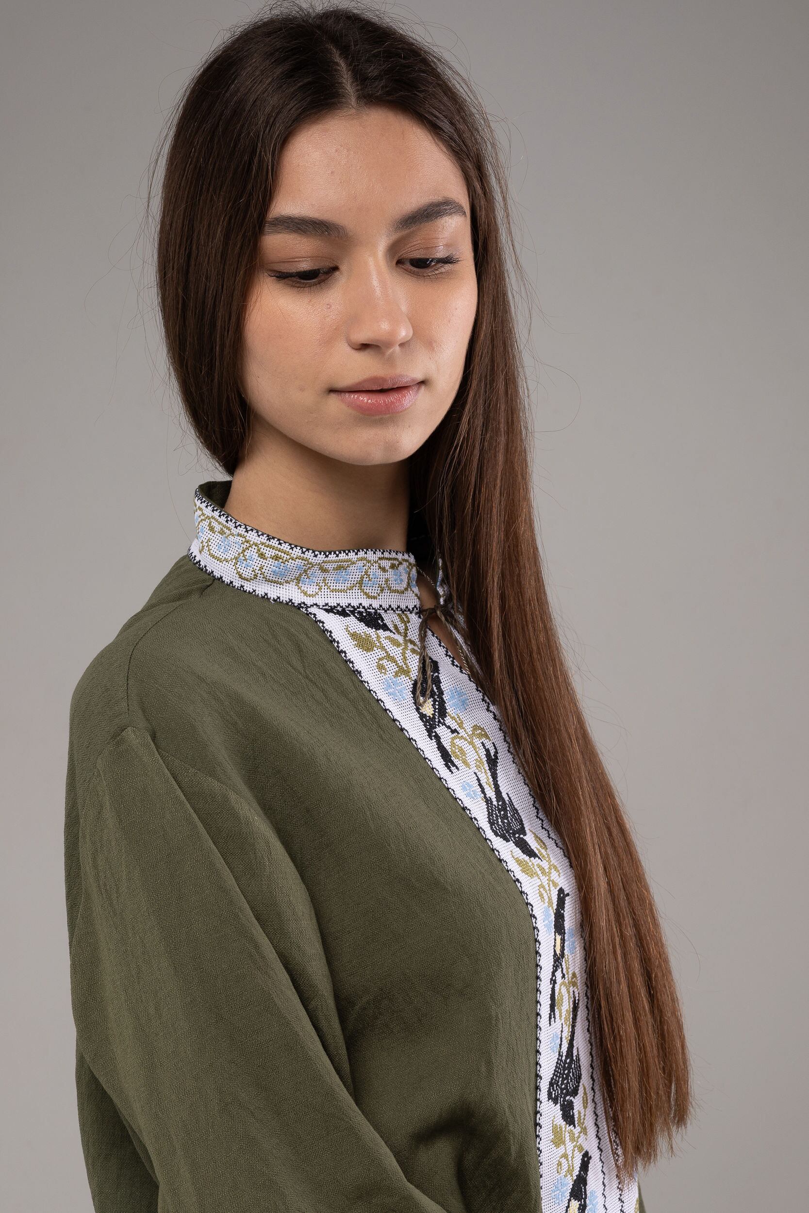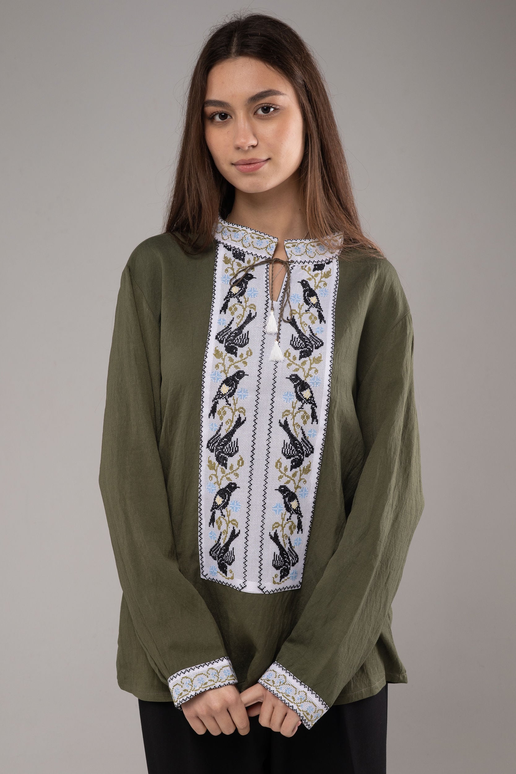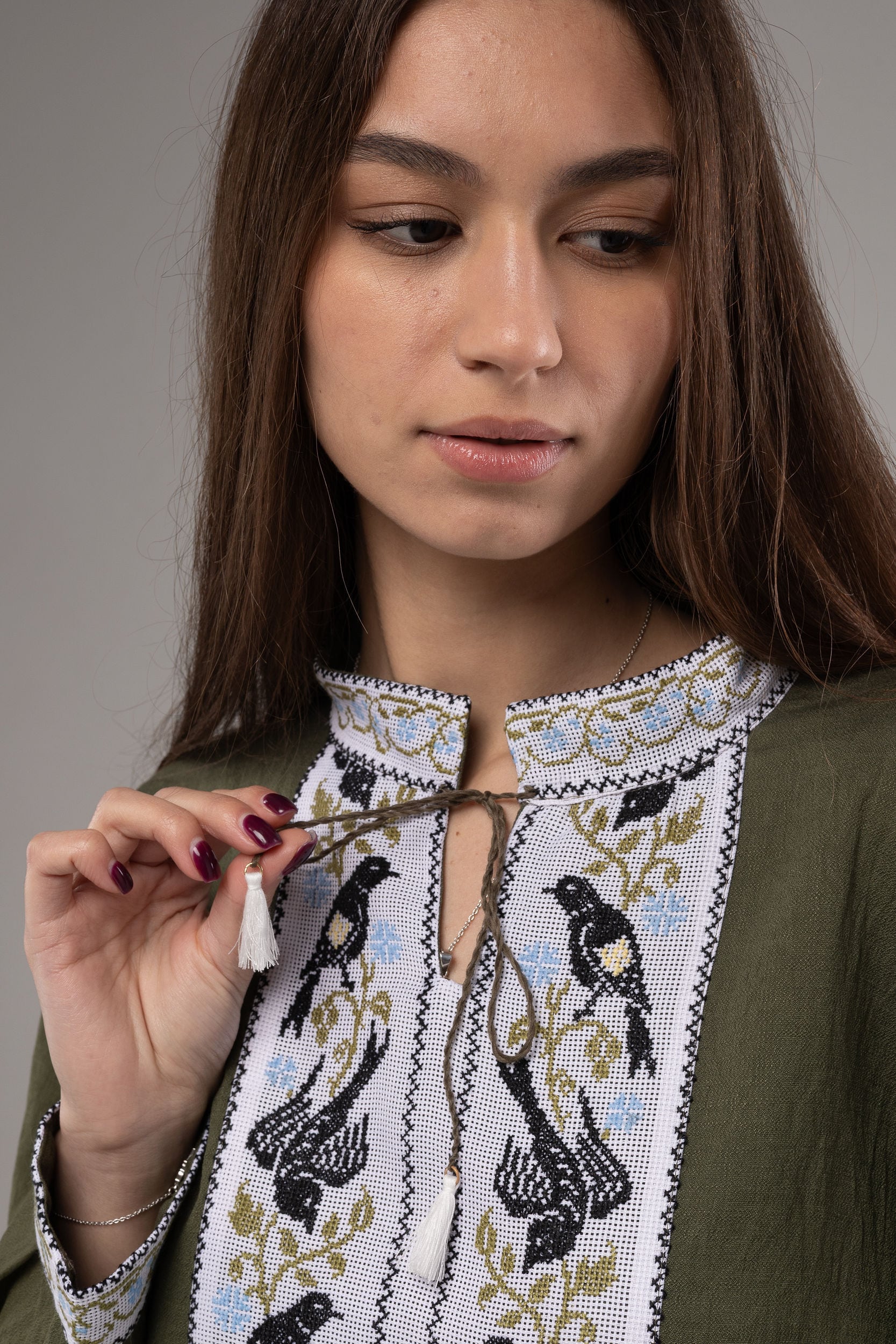 この作品は、ウクライナの伝統と美しさを象徴するヴィシヴァンカの刺繍を採用しています。過度な派手さを追求せず、日本の日常生活に自然に溶け込むデザインとなっております。しかし、それでいて洗練された高級感とカジュアルな雰囲気を両立させ、見る人を魅了する一着となっています。