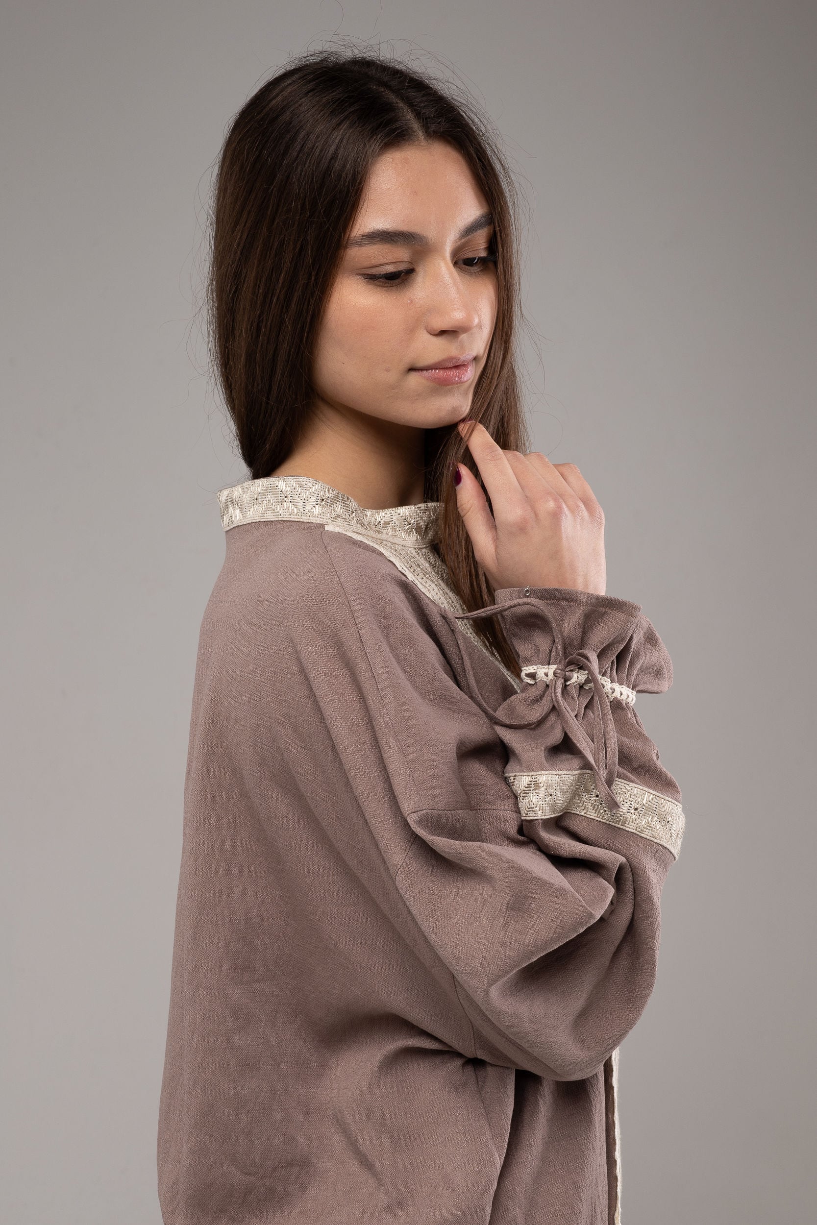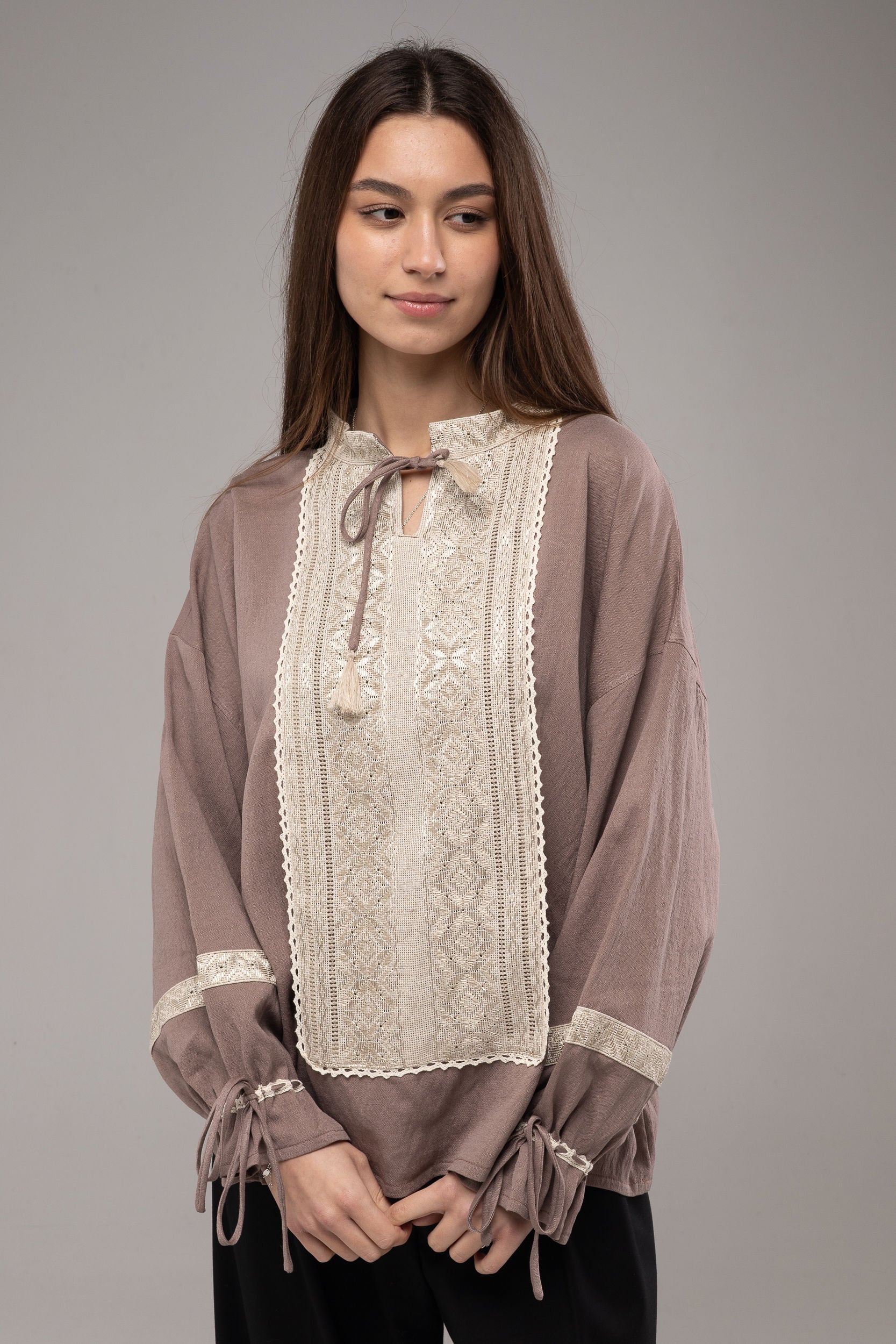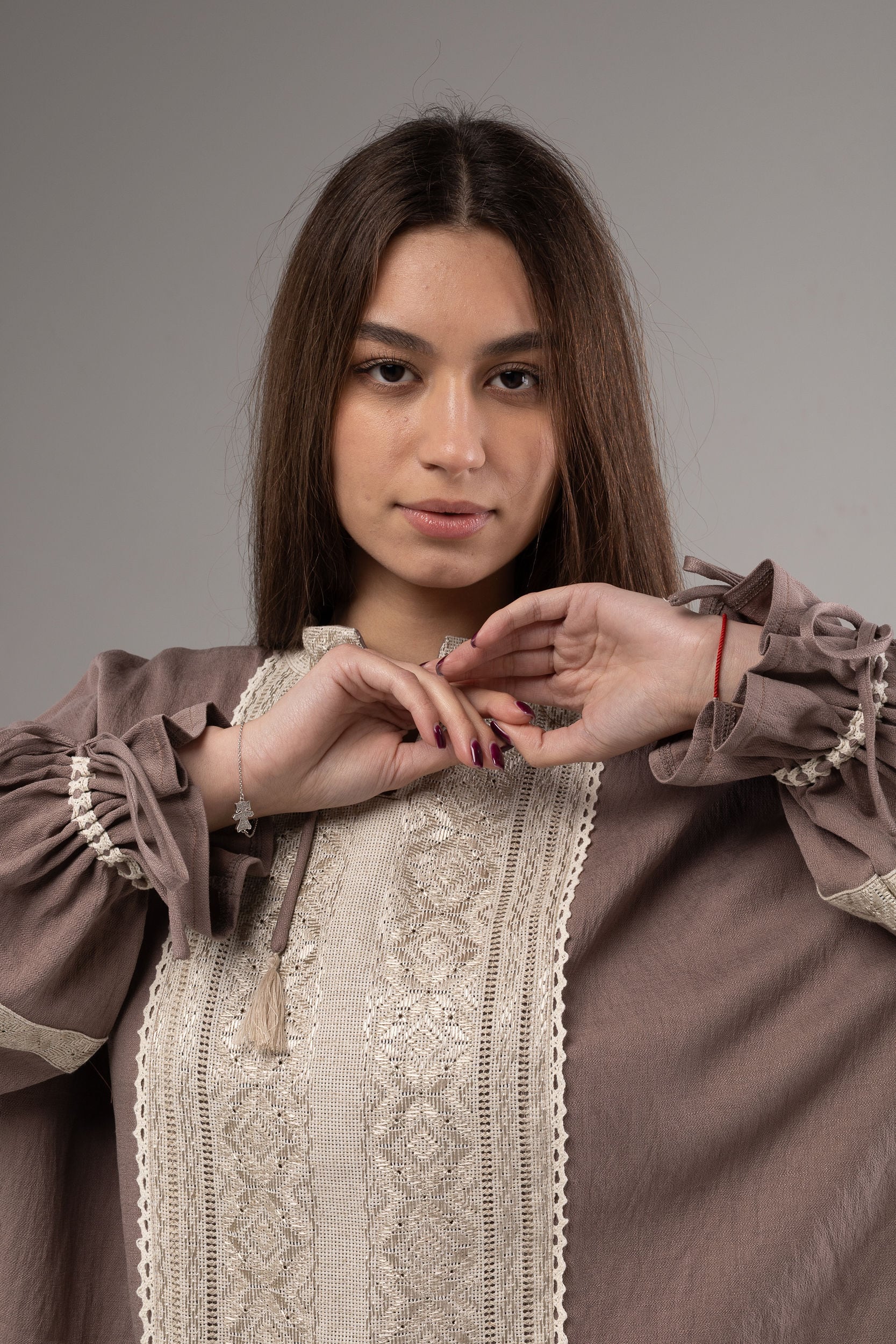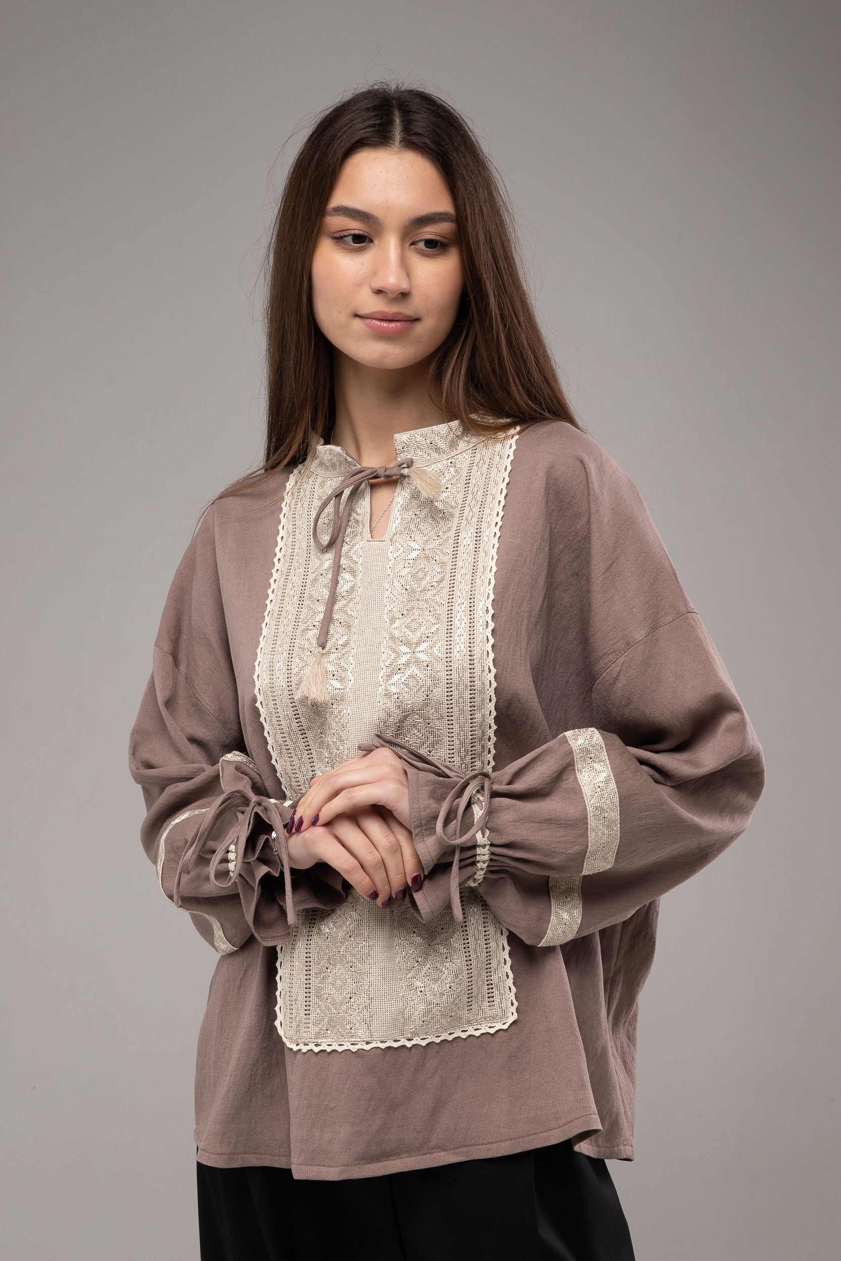 この作品は、ウクライナの伝統と美しさを象徴するヴィシヴァンカの刺繍を採用しています。過度な派手さを追求せず、日本の日常生活に自然に溶け込むデザインとなっております。しかし、それでいて洗練された高級感とカジュアルな雰囲気を両立させ、見る人を魅了する一着となっています。