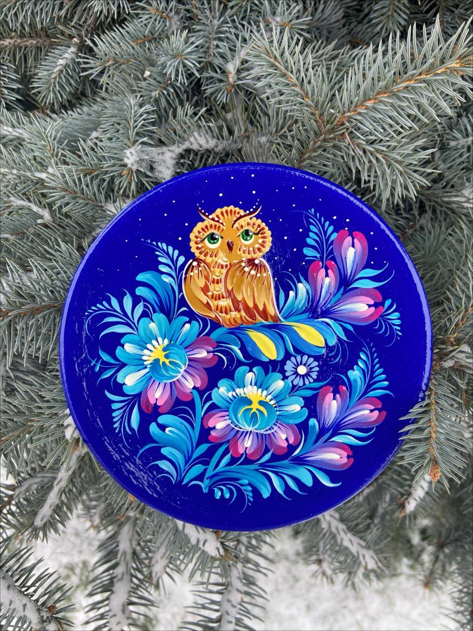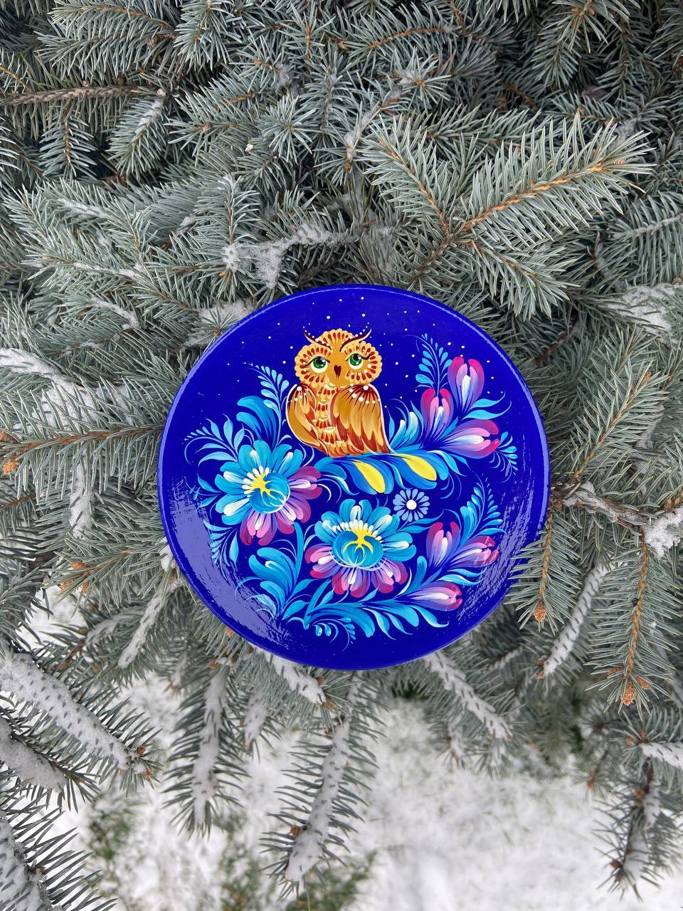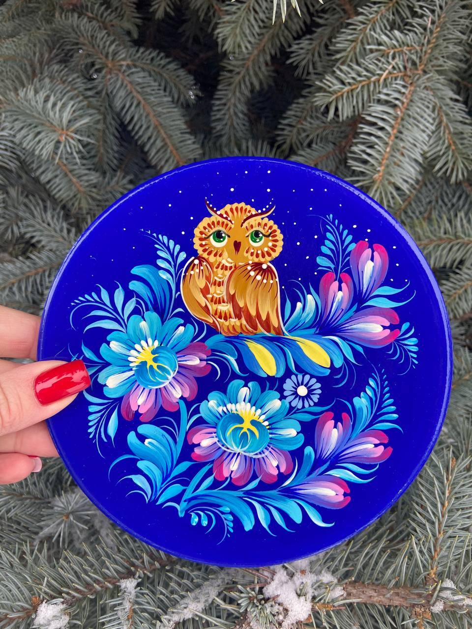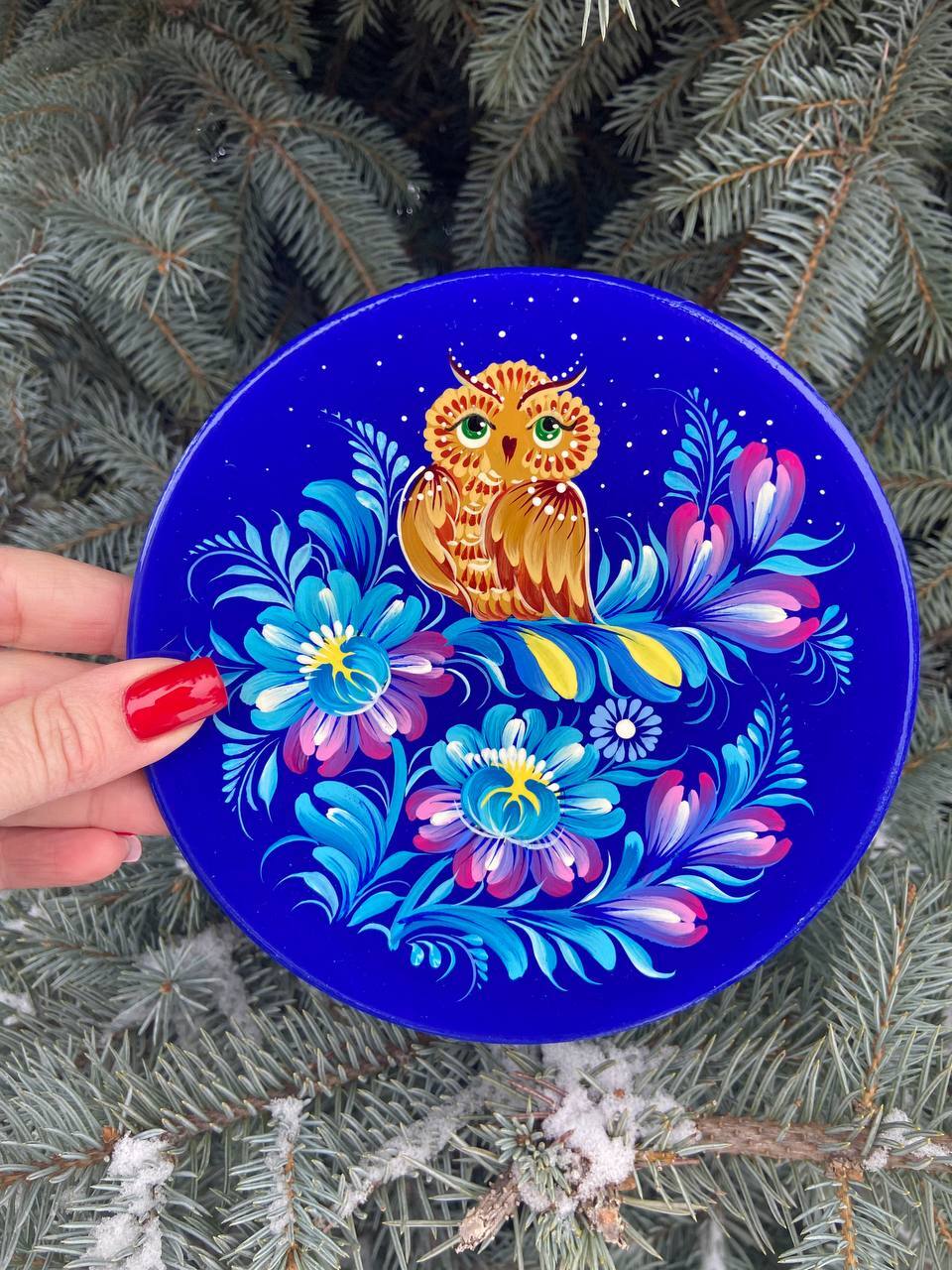 ペトリキウカ塗りのプレート 梟 (ティモシェンコ作)15cm