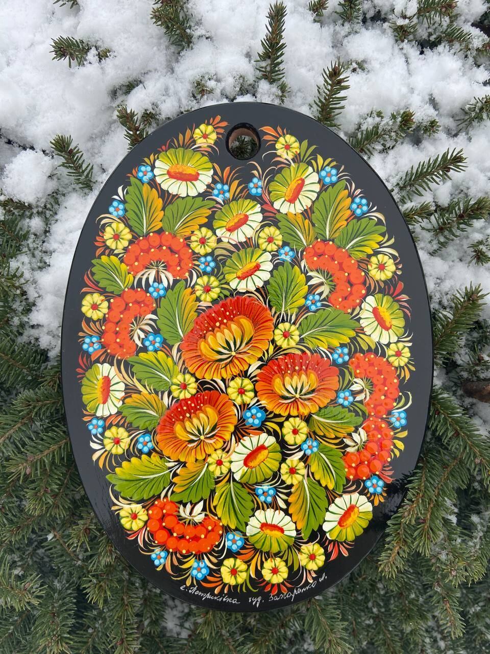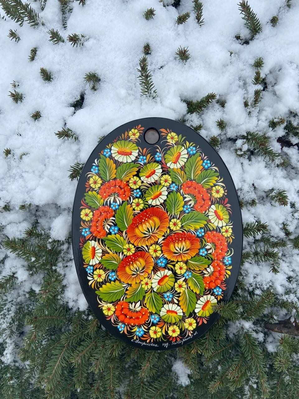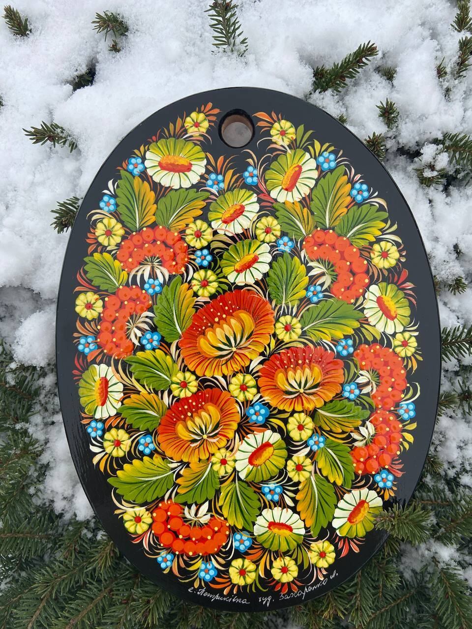 詳細:ペトリキフカ・ボードは、ウクライナの伝統的な芸術、ペトリキフカ塗りの精粋を表現する逸品です。この芸術は、ドニプロ近郊のペトリキフカ村にてユネスコ無形文化遺産登録の際にウクライナ国家認定職人として任命されたリュドミラ・ザハルチェンコによって描かれています。