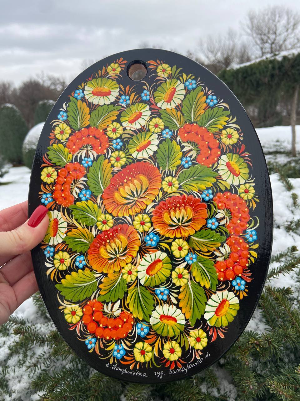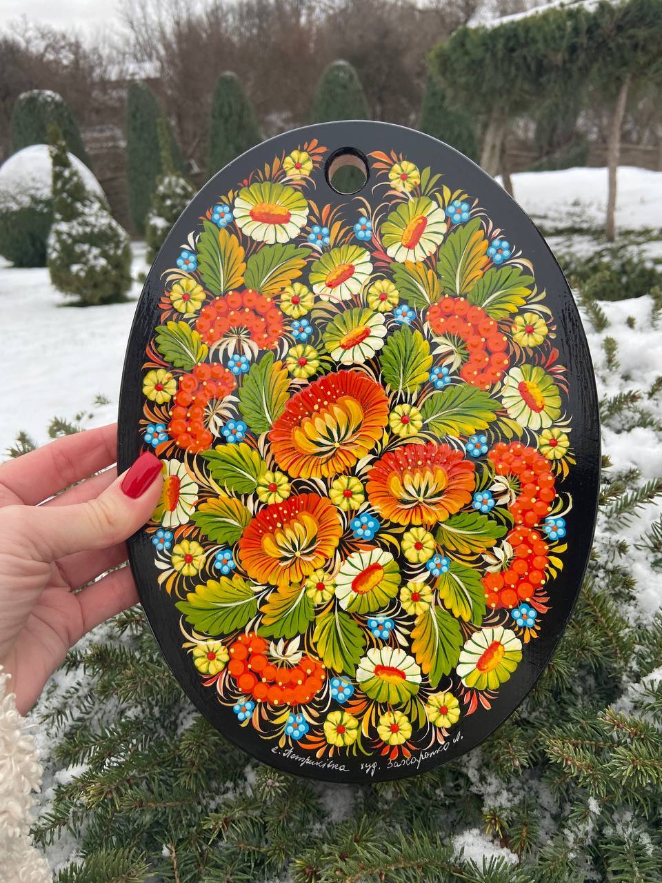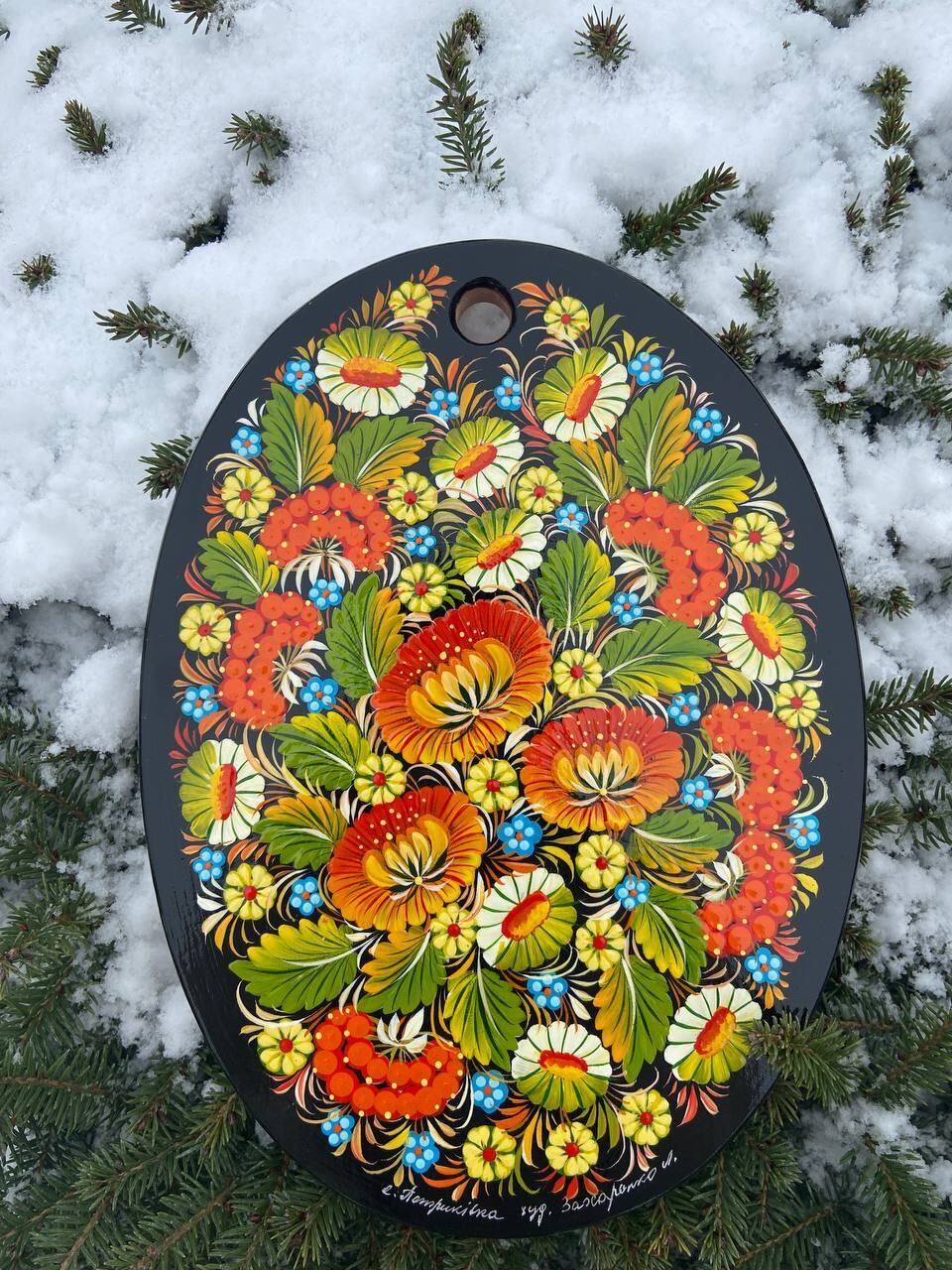詳細:ペトリキフカ・ボードは、ウクライナの伝統的な芸術、ペトリキフカ塗りの精粋を表現する逸品です。この芸術は、ドニプロ近郊のペトリキフカ村にてユネスコ無形文化遺産登録の際にウクライナ国家認定職人として任命されたリュドミラ・ザハルチェンコによって描かれています。