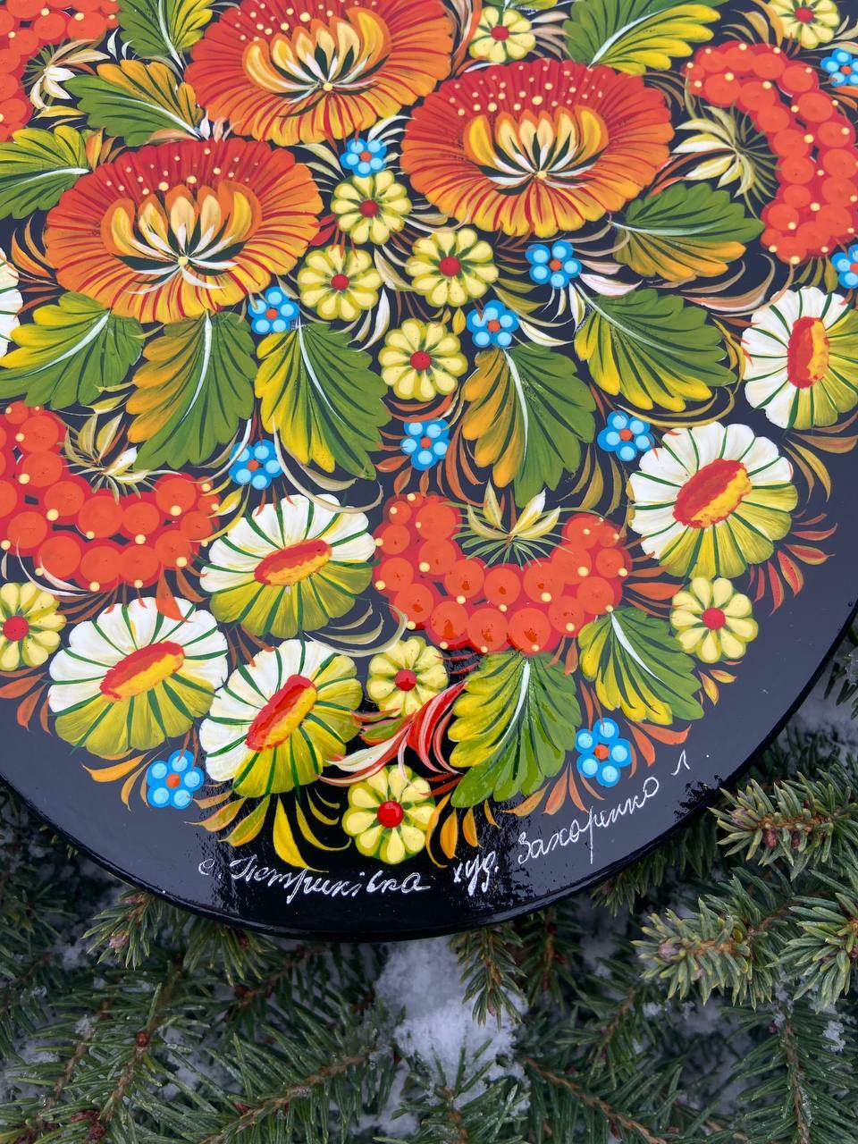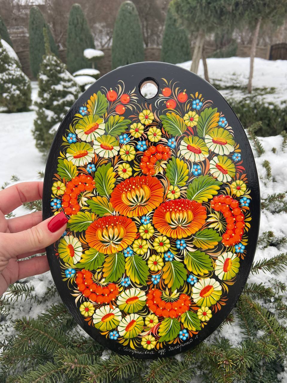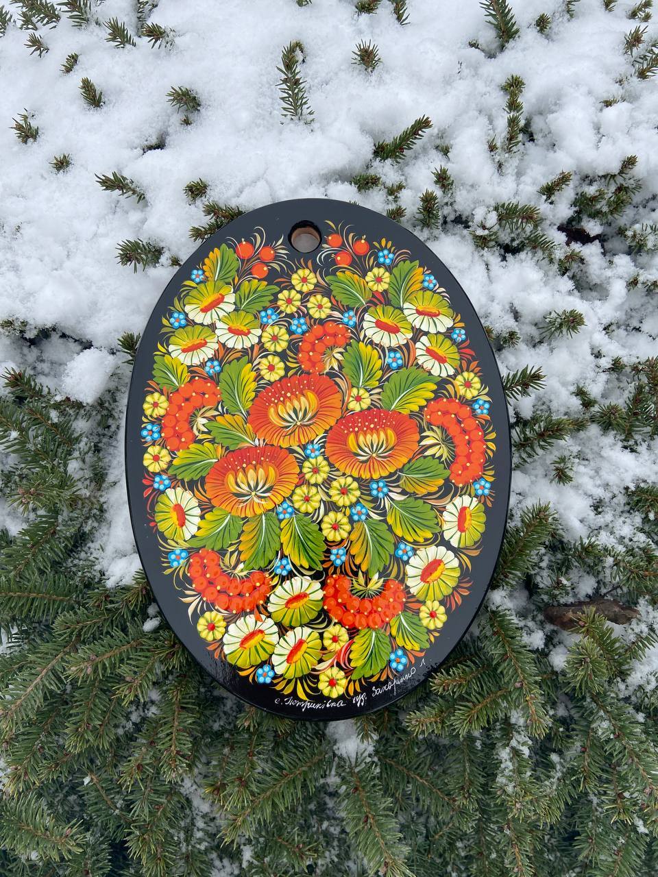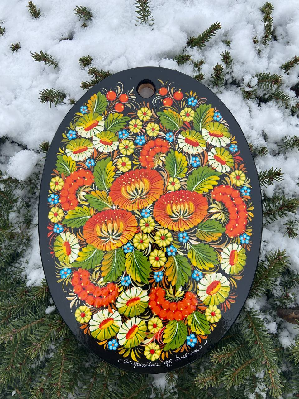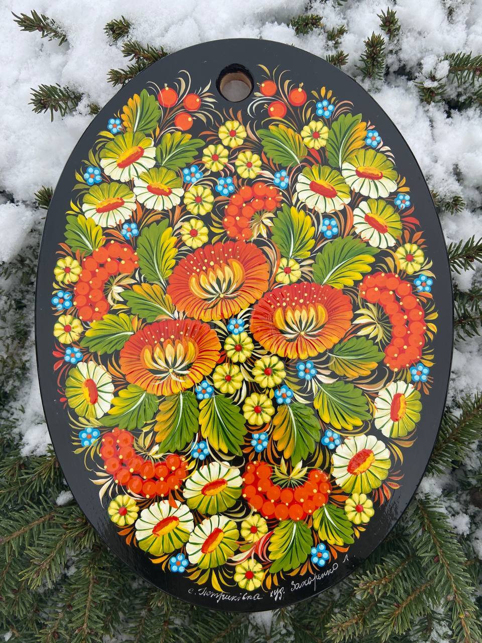 詳細:ペトリキフカ・ボードは、ウクライナの伝統的な芸術、ペトリキフカ塗りの精粋を表現する逸品です。この芸術は、ドニプロ近郊のペトリキフカ村にてユネスコ無形文化遺産登録の際にウクライナ国家認定職人として任命されたリュドミラ・ザハルチェンコによって描かれています。