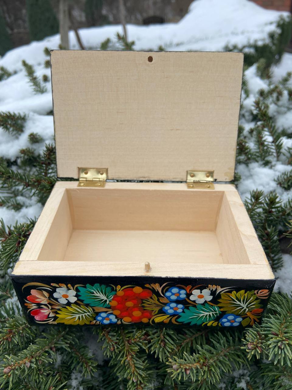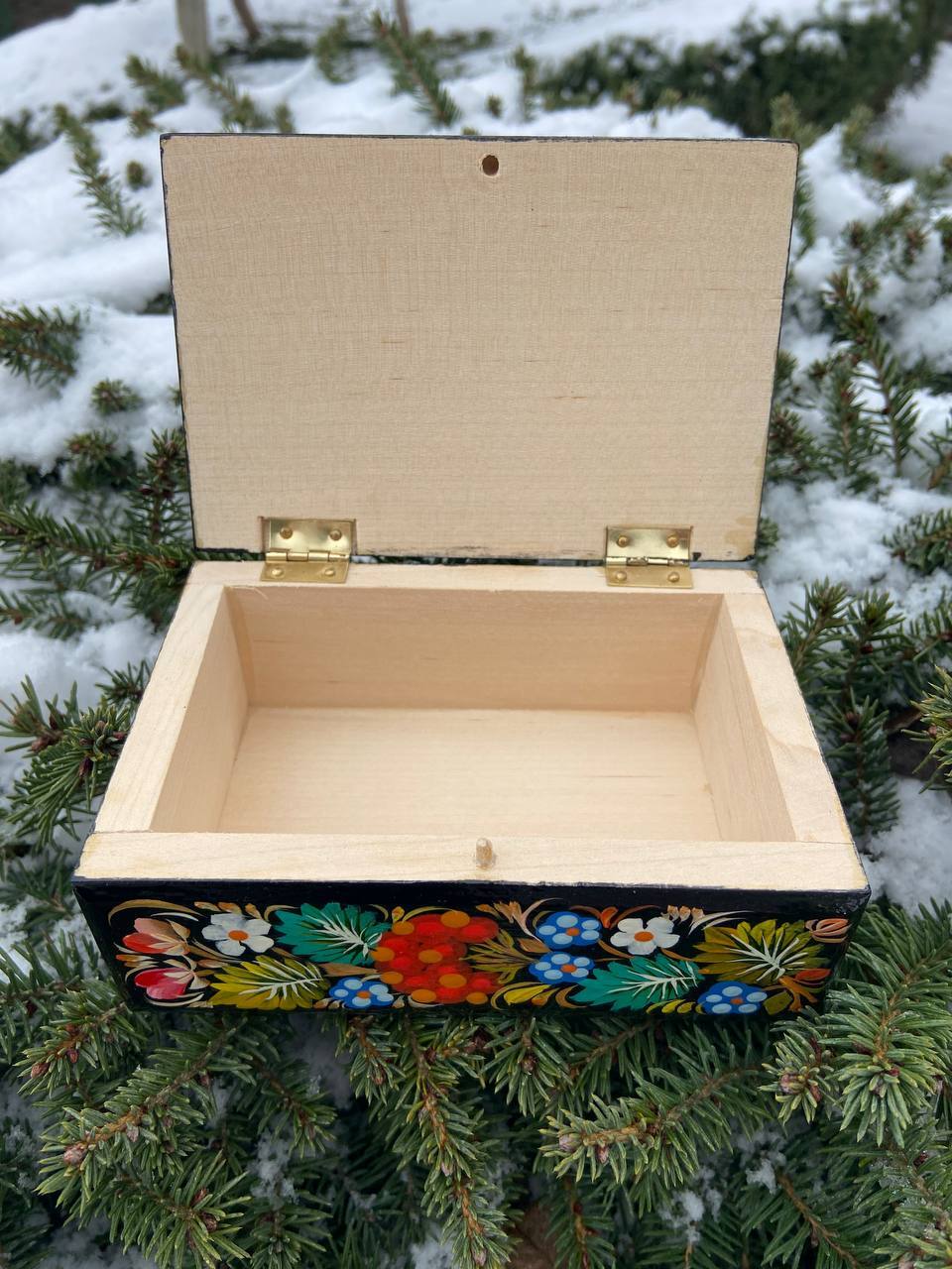 この美しいジュエリーボックスは、ペトリキフカ村のシナノキゾクの樹木から一から手作業で切り彫られ、細部にわたって丁寧に仕上げられています。シナノキの木材は、ウクライナでは御守りとしての意味を持ち、幸運と安全をもたらすと信じられています。