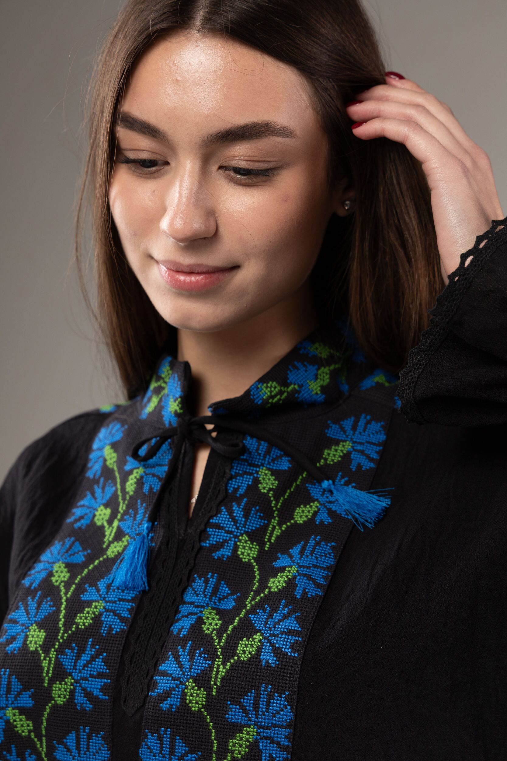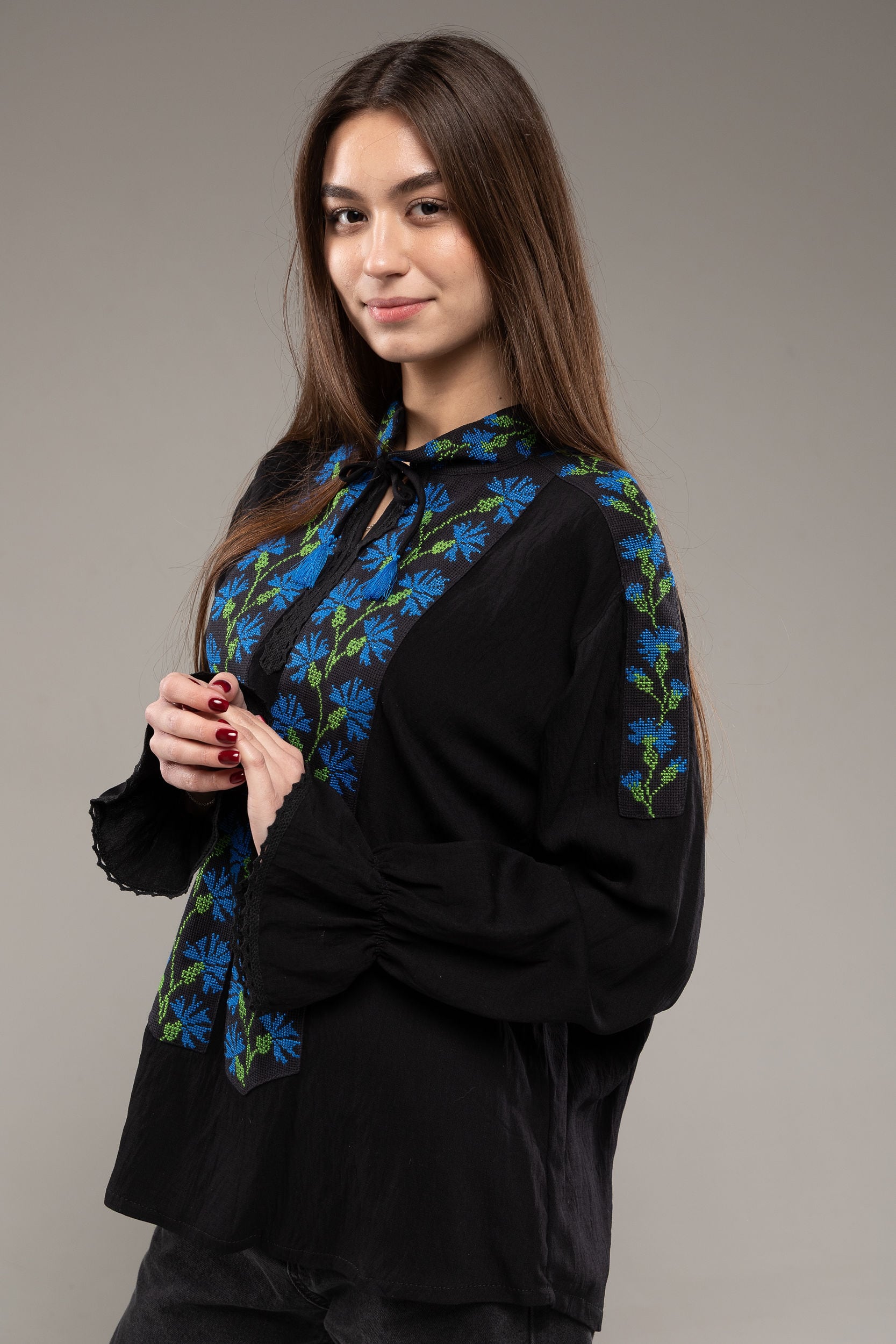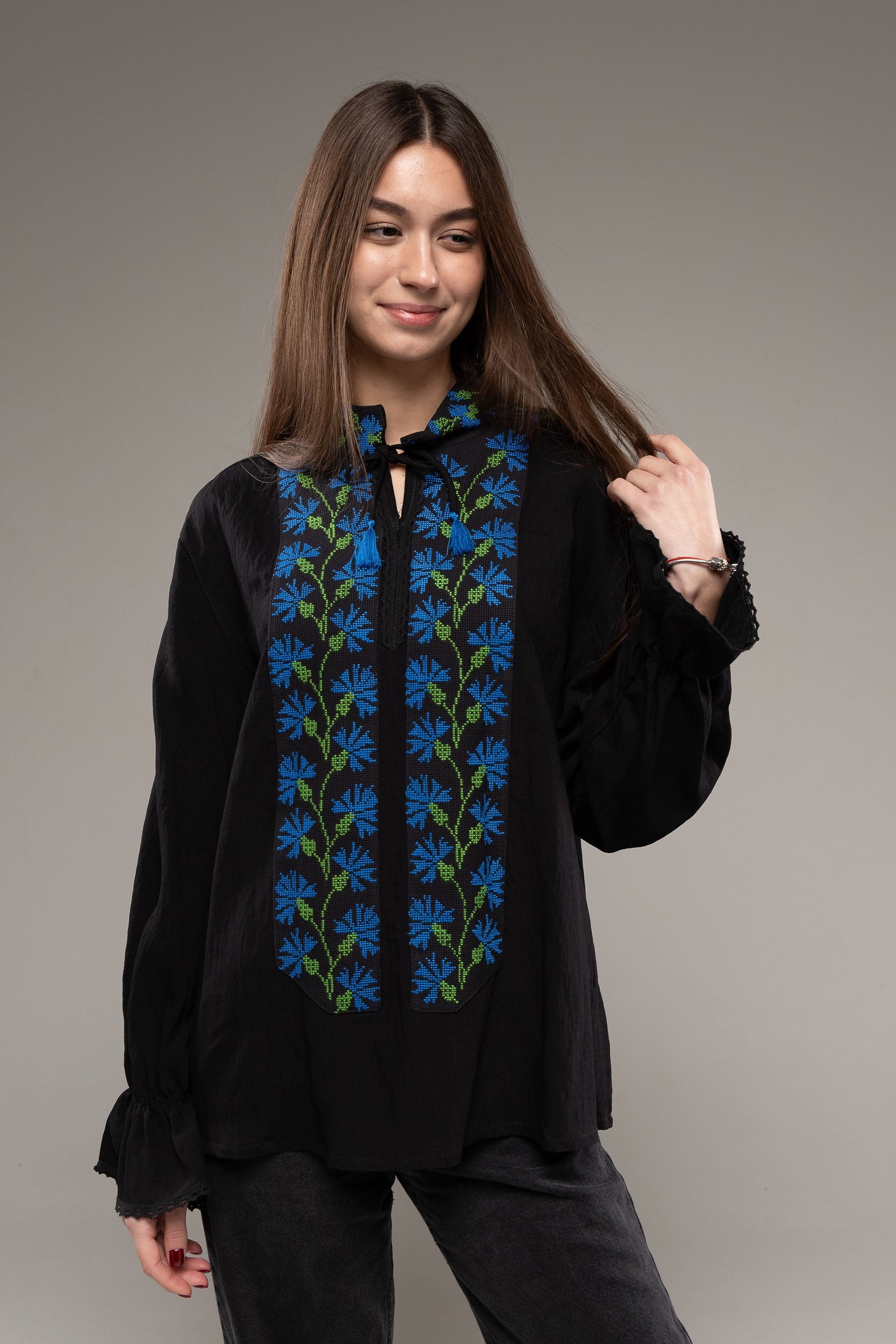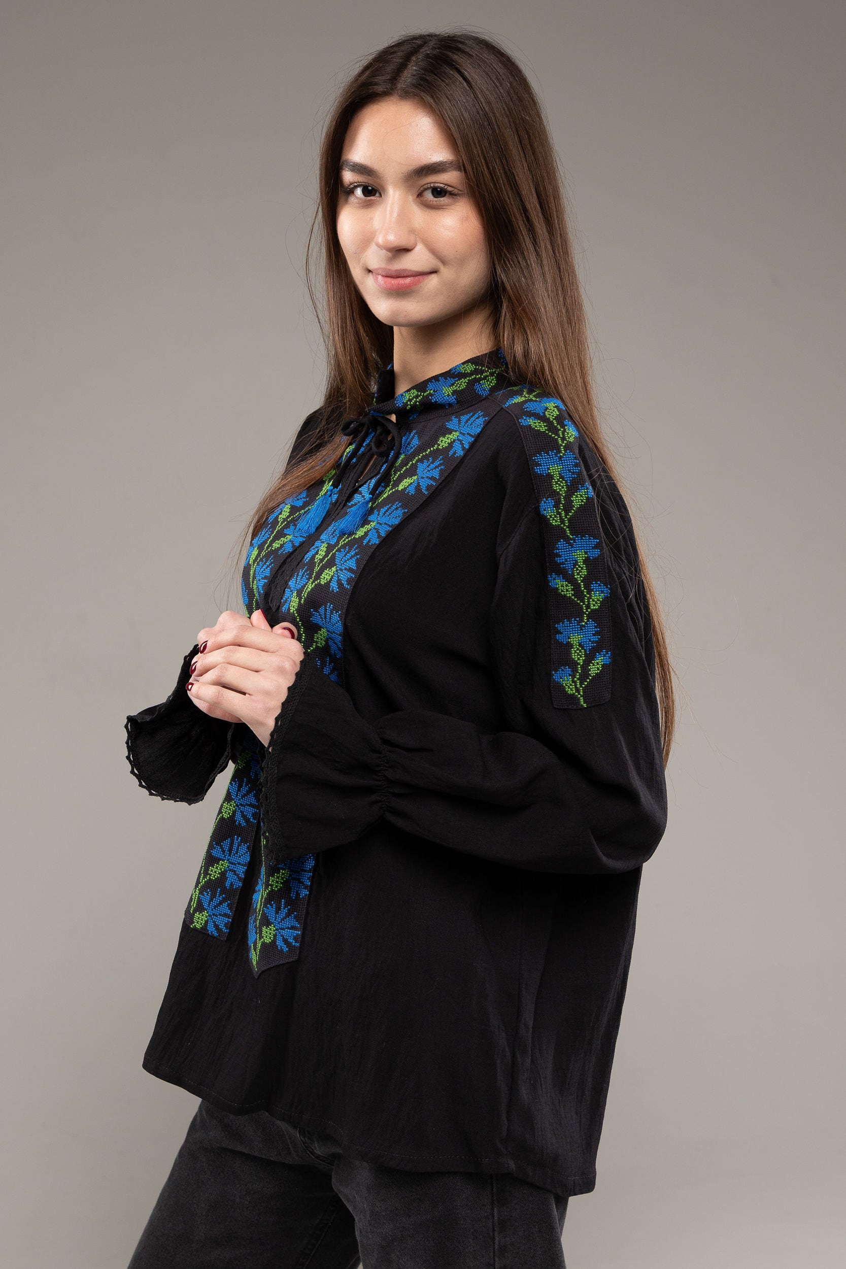 この作品は、ウクライナの伝統と美しさを象徴するヴィシヴァンカの刺繍を採用しています。過度な派手さを追求せず、日本の日常生活に自然に溶け込むデザインとなっております。しかし、それでいて洗練された高級感とカジュアルな雰囲気を両立させ、見る人を魅了する一着となっています。