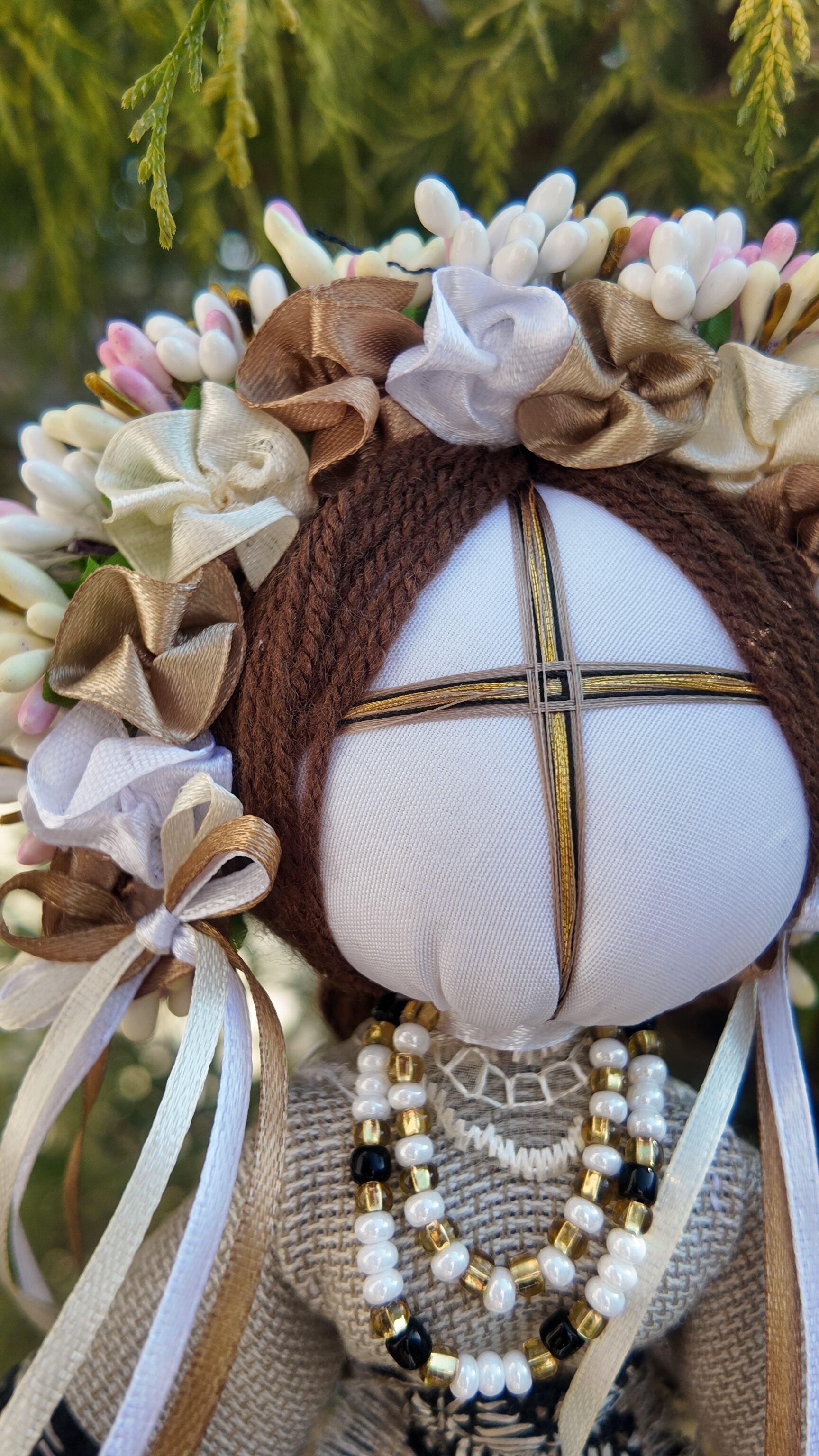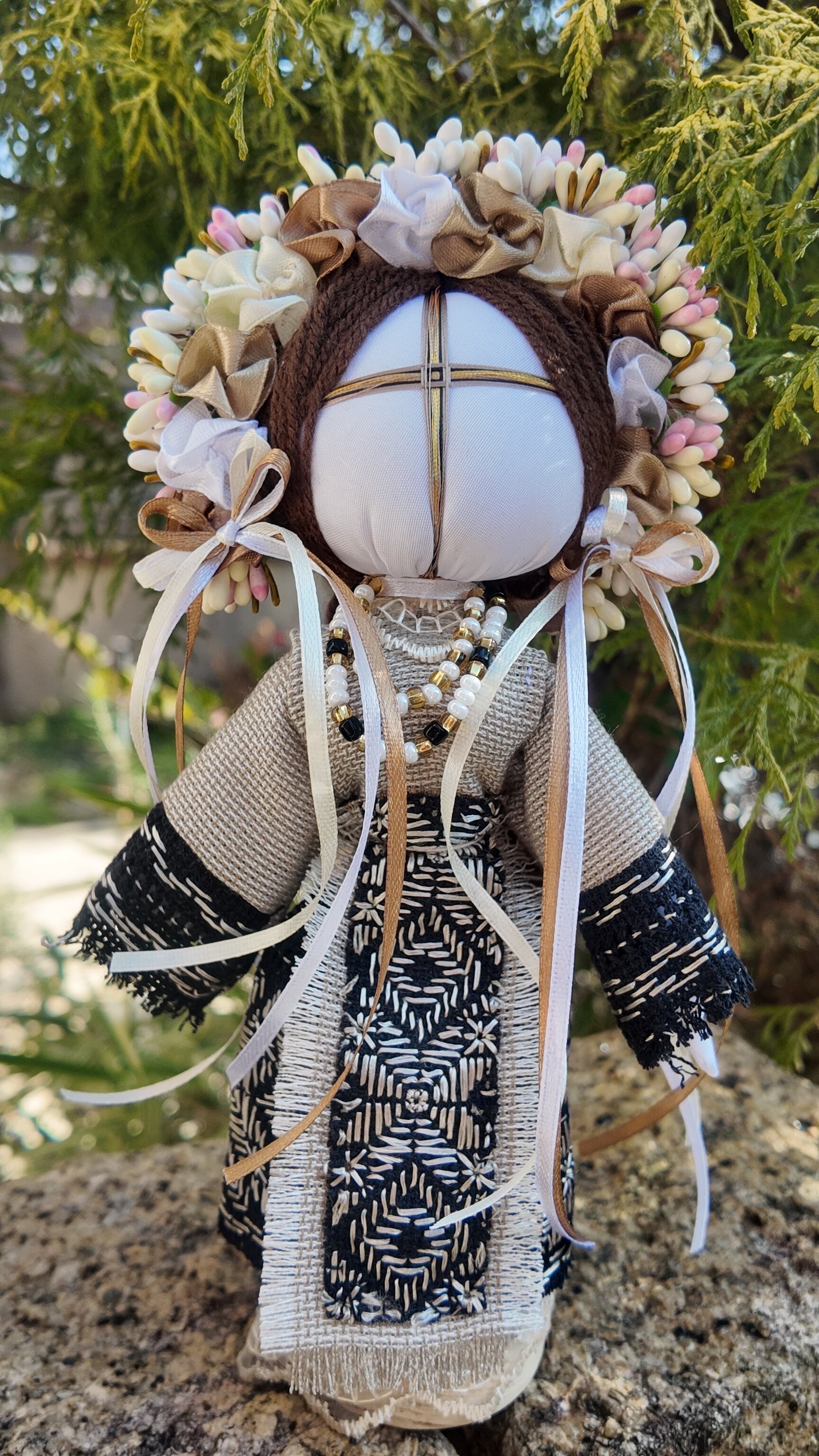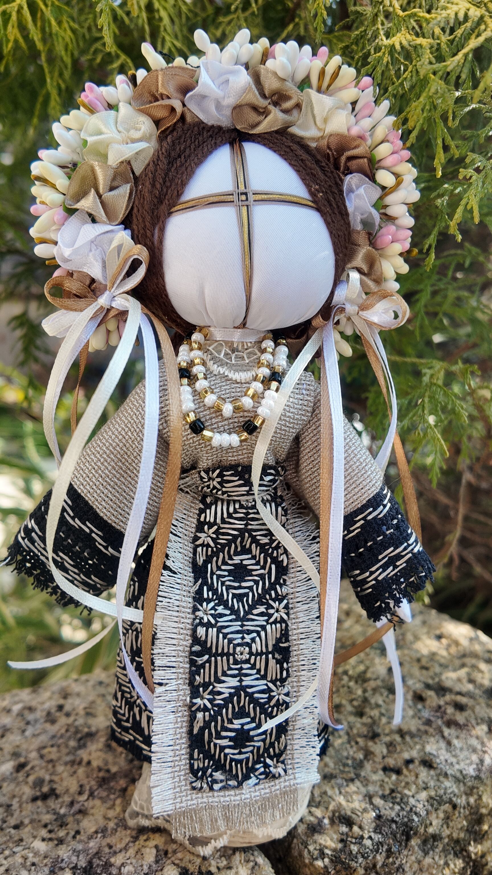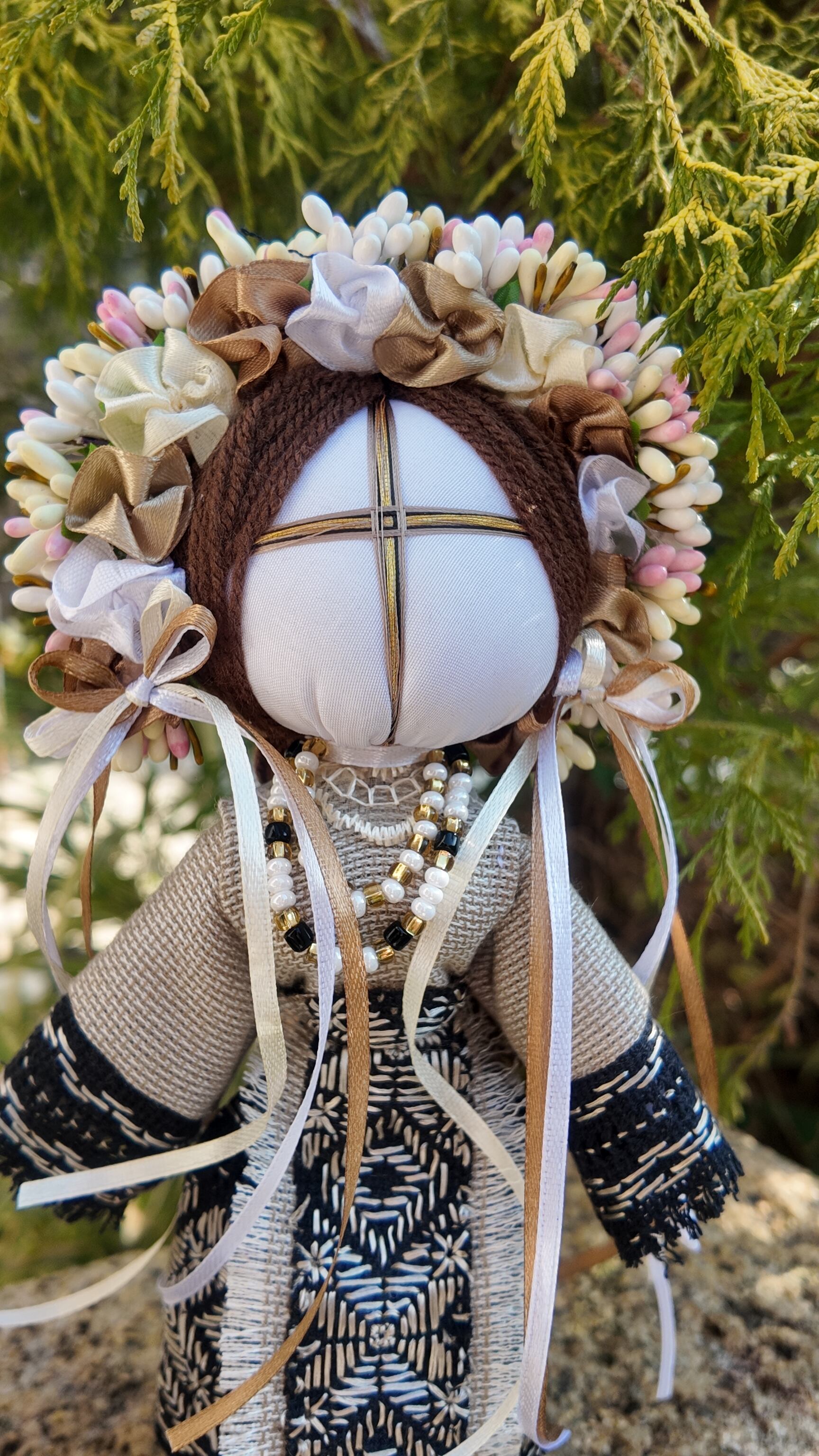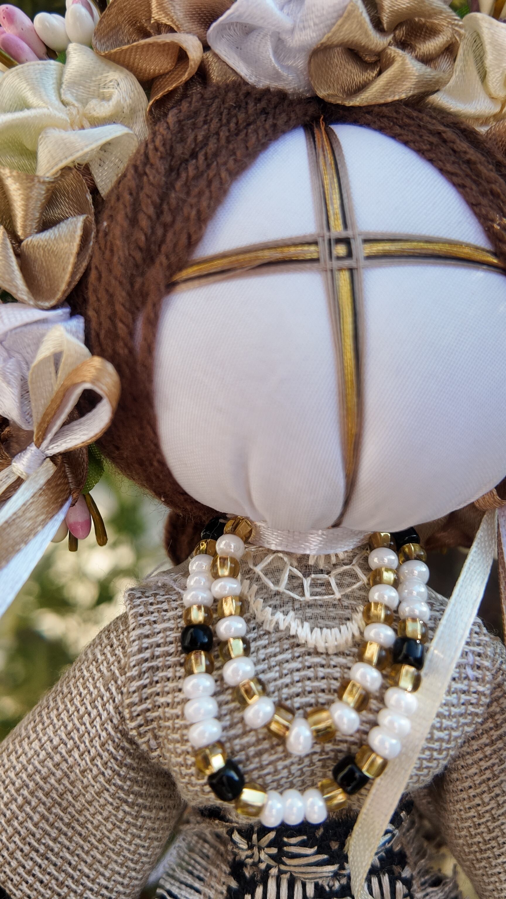 モタンカは「мотати(モターティ)」という動詞から名付けられ、針やハサミを使わずに布地を結んで作られる伝統的な人形です。これは、人形に目がないことにも繋がり、子供の魂が目を通して人形の中に入ることを防ぐための習慣です。