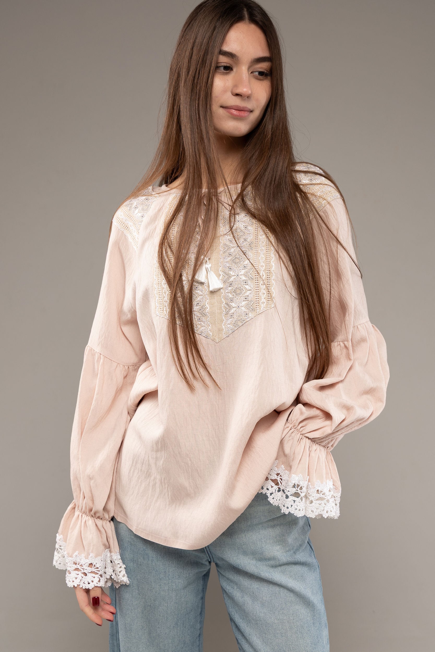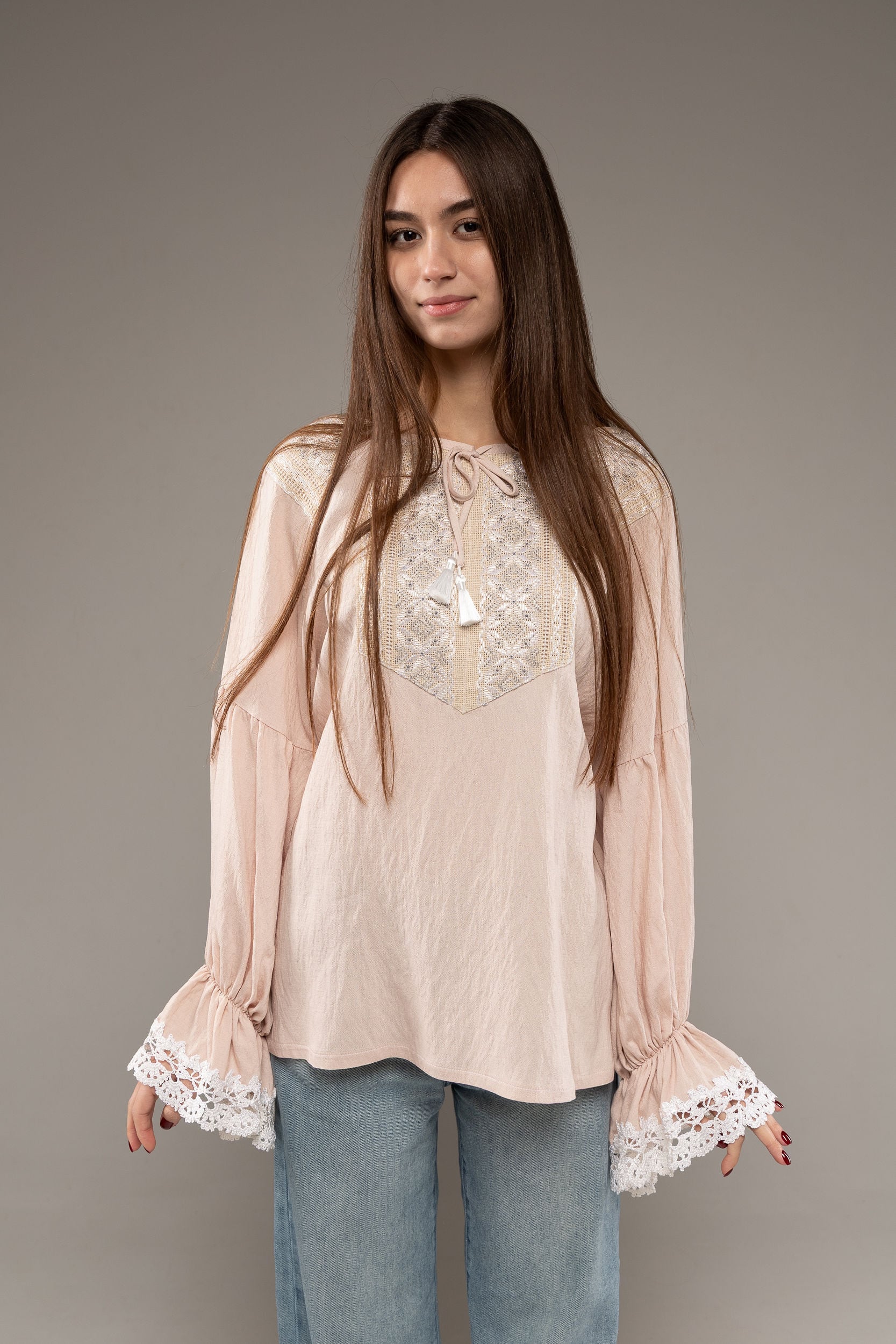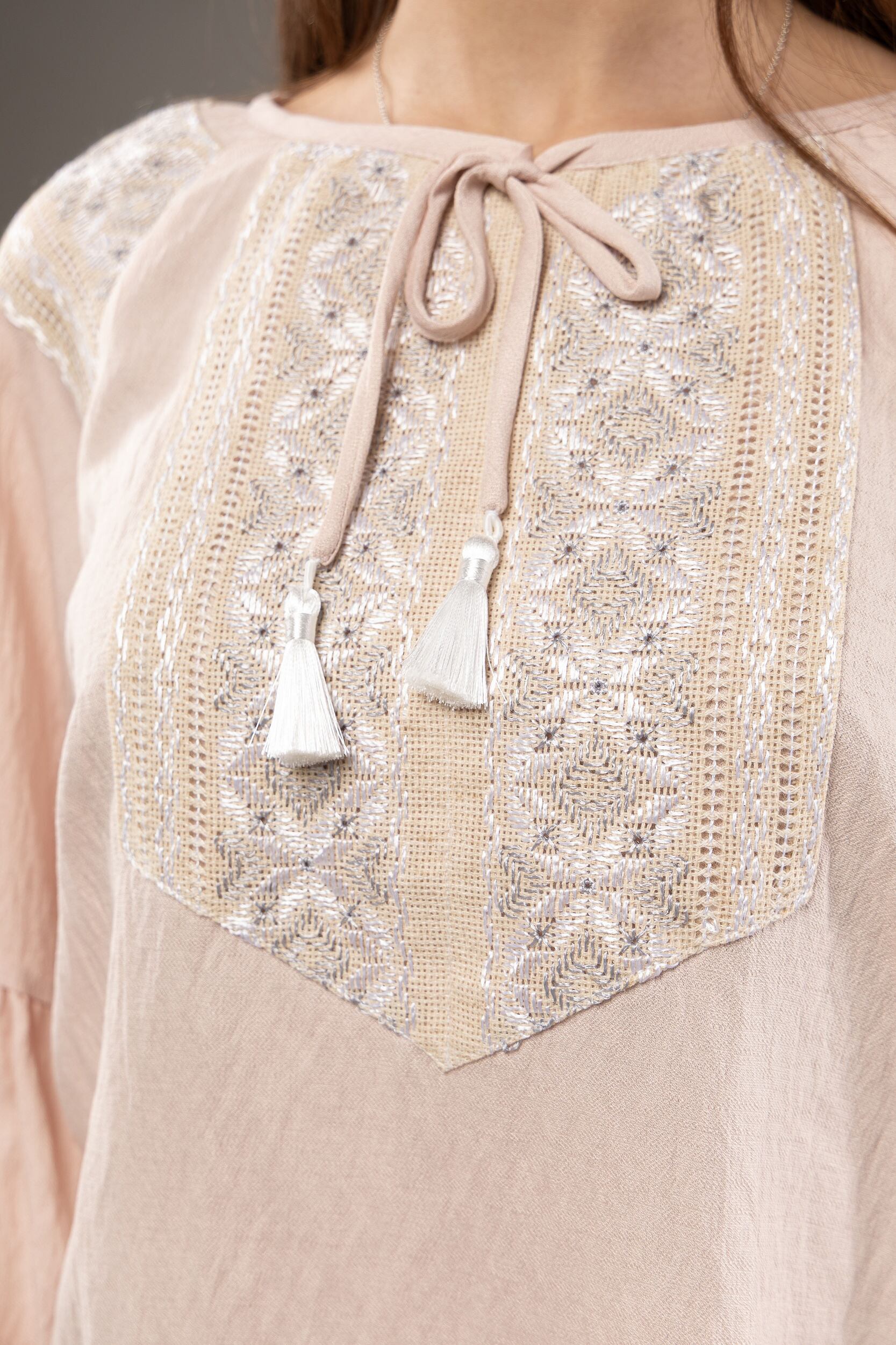 ウクライナ刺繍ヴィシヴァンカ シルク手刺繍 グラージュ・ニジンカ 麻 レディース・フリーサイズ