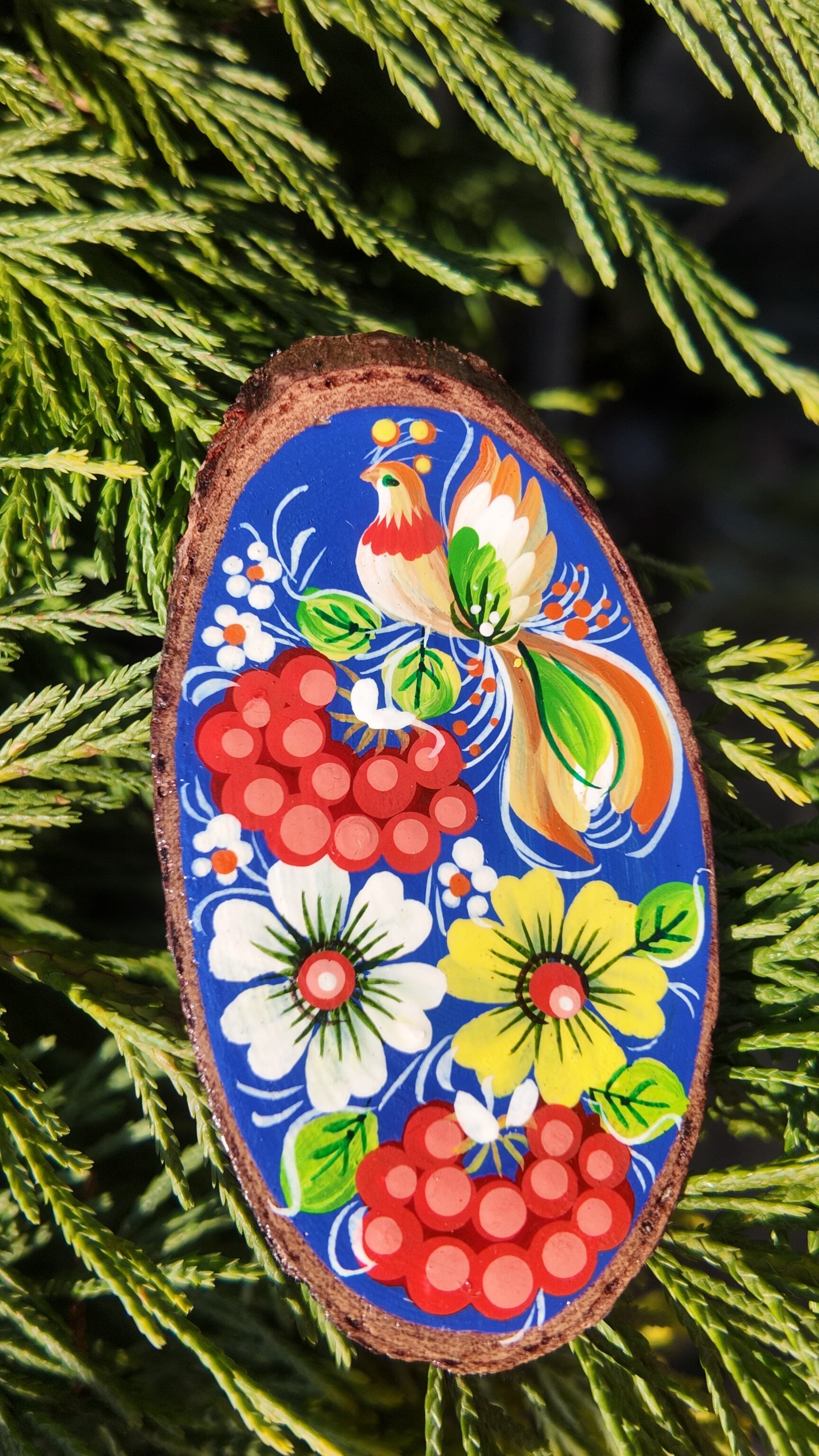 本作品は、ウクライナを代表する伝統絵画技法「ペトリキウカ塗り」によって制作されています。花や植物をモチーフとした優美な文様と、鮮やかで奥行きのある色彩が特徴で、長い歴史の中で受け継がれてきた民俗芸術のひとつです。
