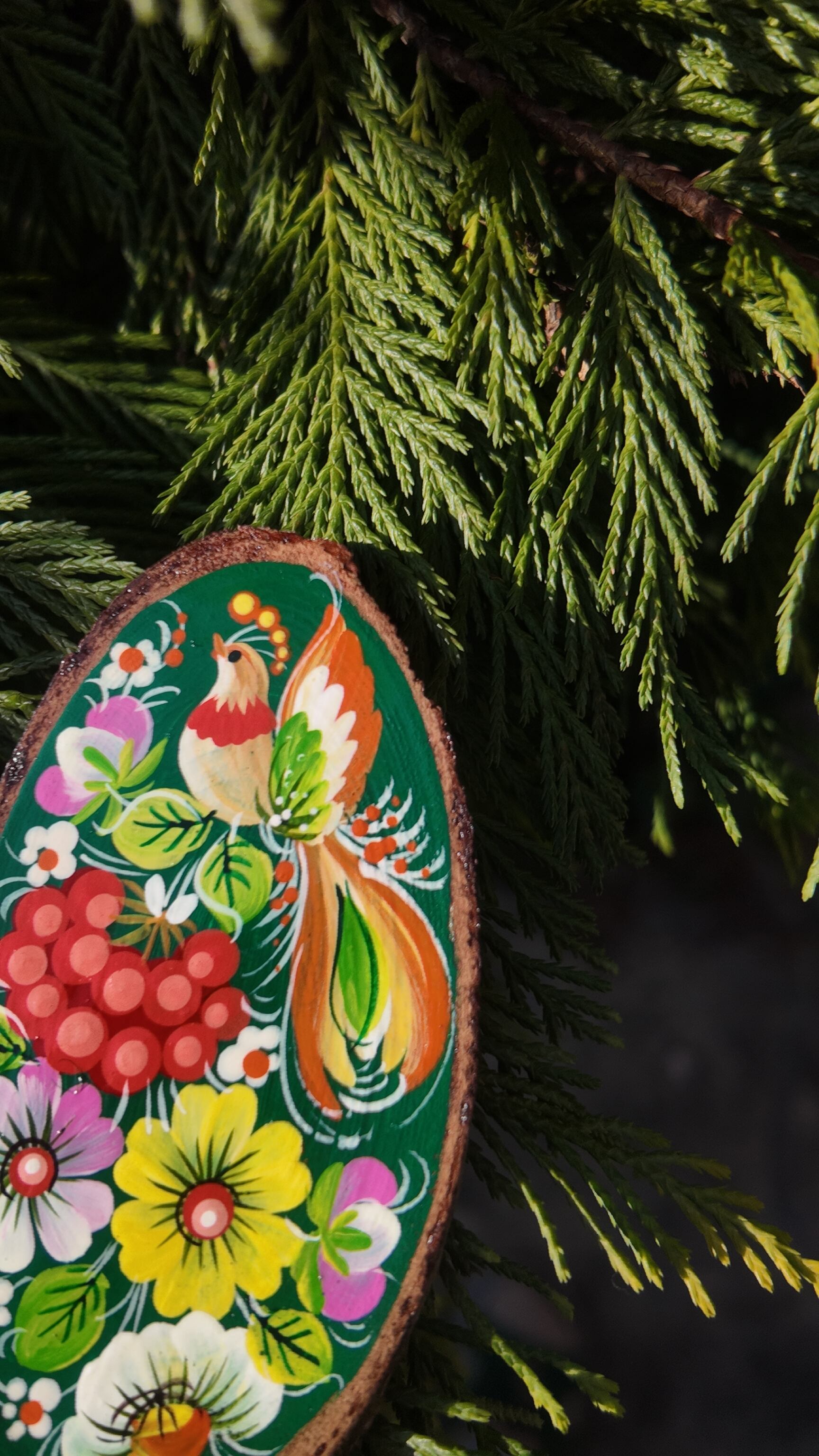 本作品は、ウクライナを代表する伝統絵画技法「ペトリキウカ塗り」によって制作されています。花や植物をモチーフとした優美な文様と、鮮やかで奥行きのある色彩が特徴で、長い歴史の中で受け継がれてきた民俗芸術のひとつです。
