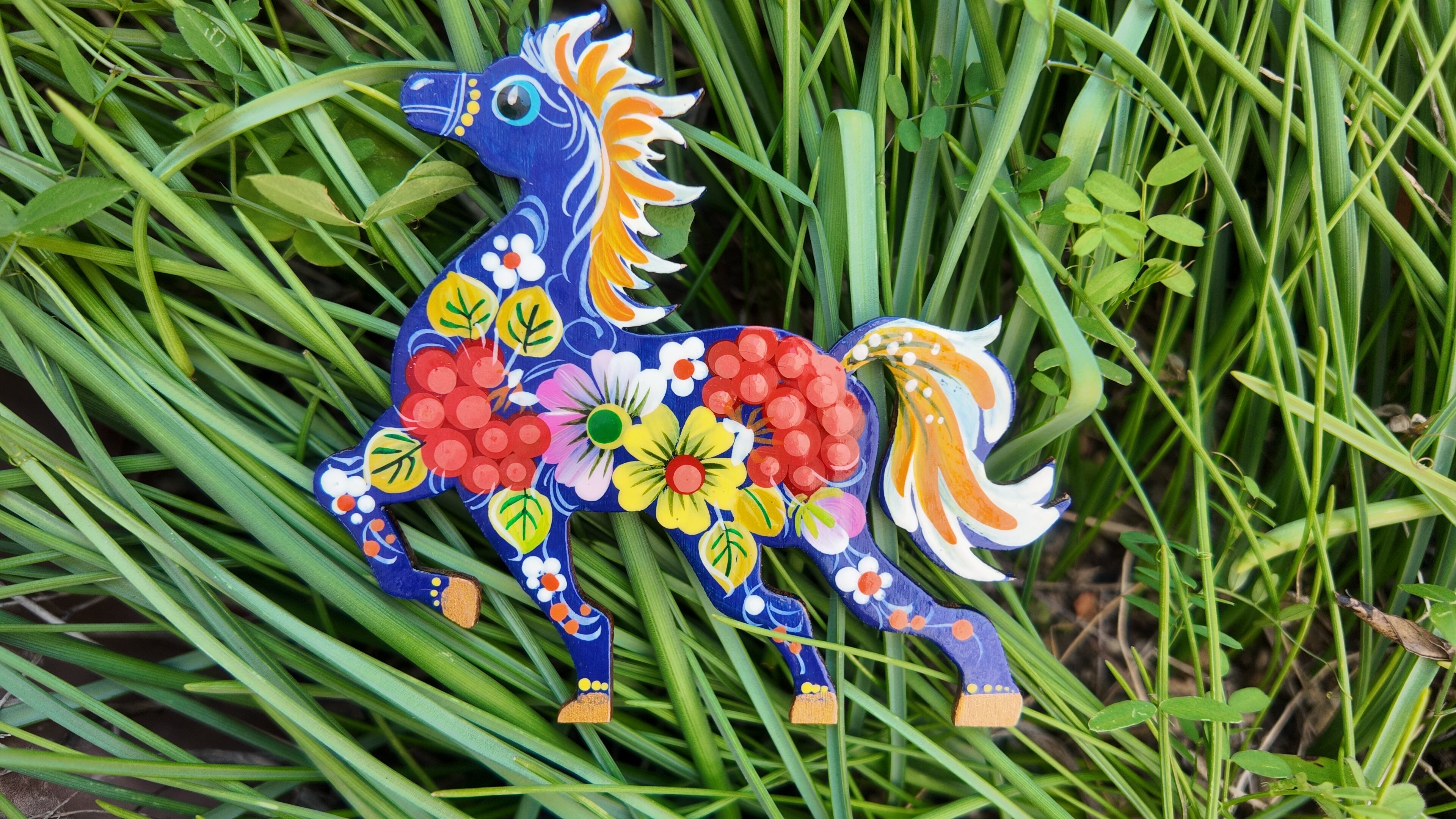 ウクライナ伝統絵画 ペトリキウカ塗り 木製ブローチ(ホメンコ作)