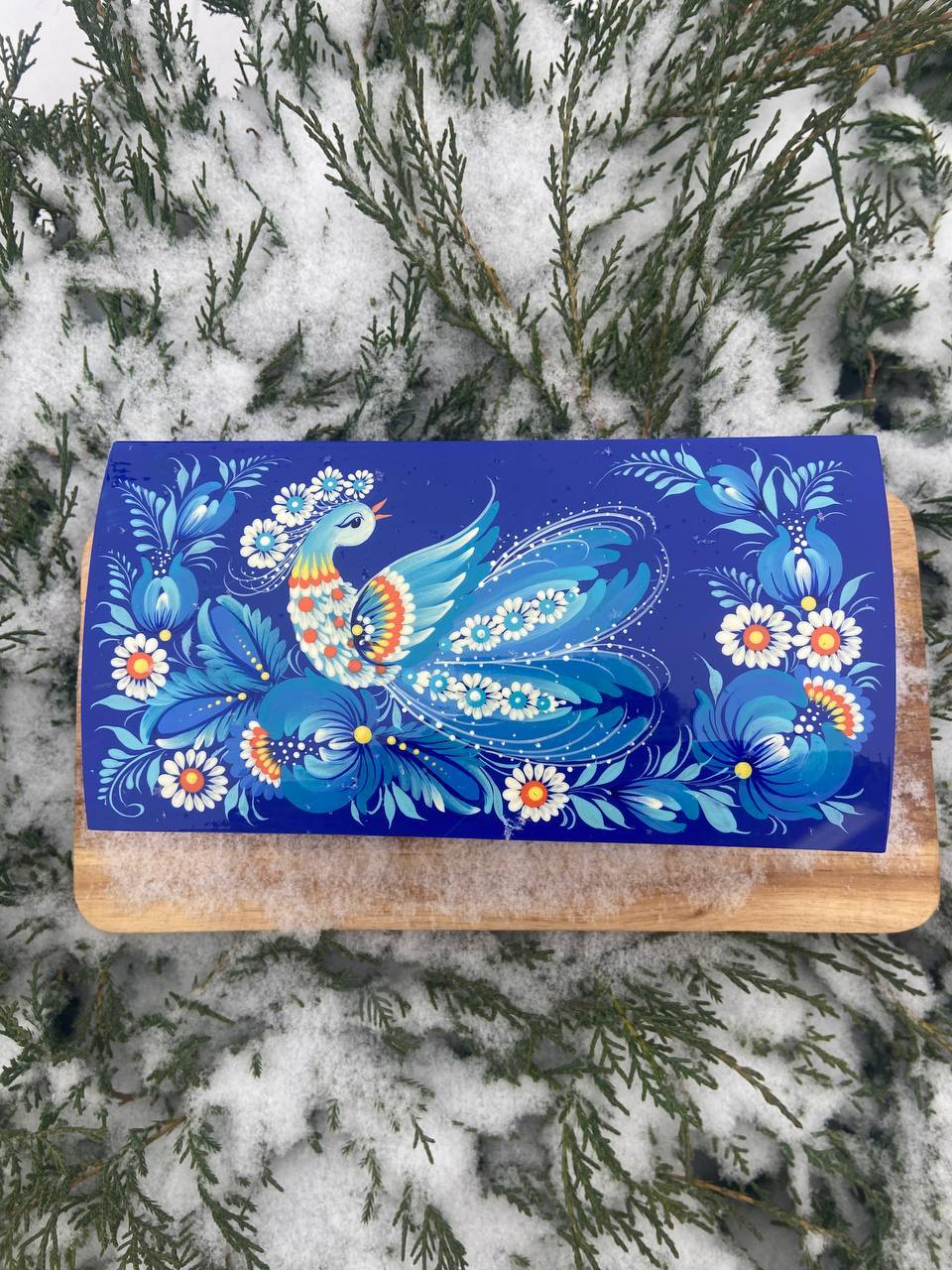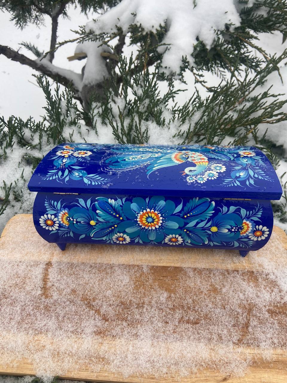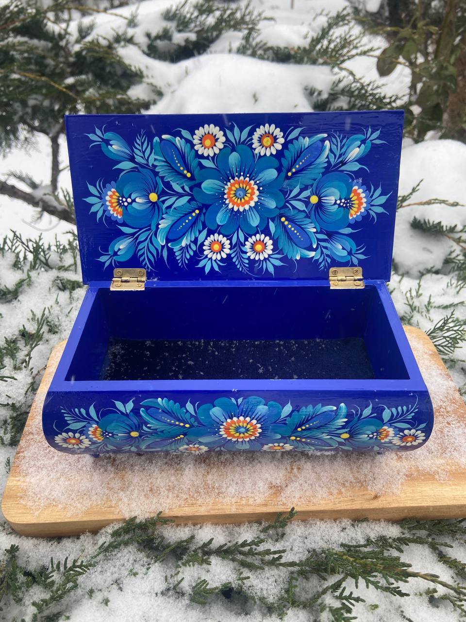 この美しいジュエリーボックスは、ペトリキフカ村のシナノキゾクの樹木から一から手作業で切り彫られ、細部にわたって丁寧に仕上げられています。シナノキの木材は、ウクライナでは御守りとしての意味を持ち、幸運と安全をもたらすと信じられています。