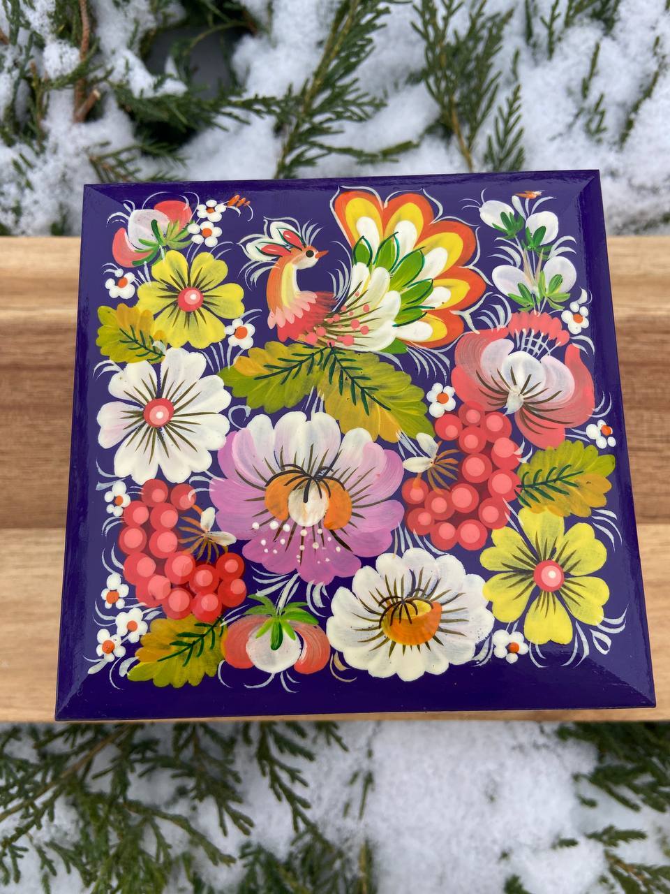 ペトリキフカ・ジュエリーボックスは、ウクライナの伝統的な芸術、ペトリキフカ塗りの精粋を表現する逸品です。この芸術は、ドニプロ近郊のペトリキフカ村にて代々受け継がれてきたペトリーヴナ家の手によって生み出されています。ホメンコ・ヴァレンティーナ・ペトリーヴナは、その伝統を受け継ぐ現代の名工です。