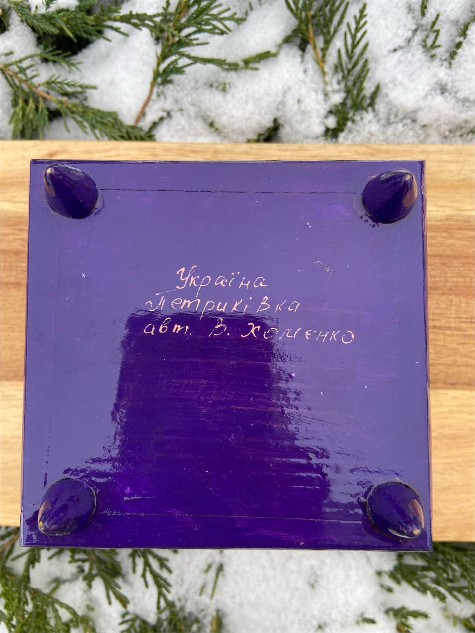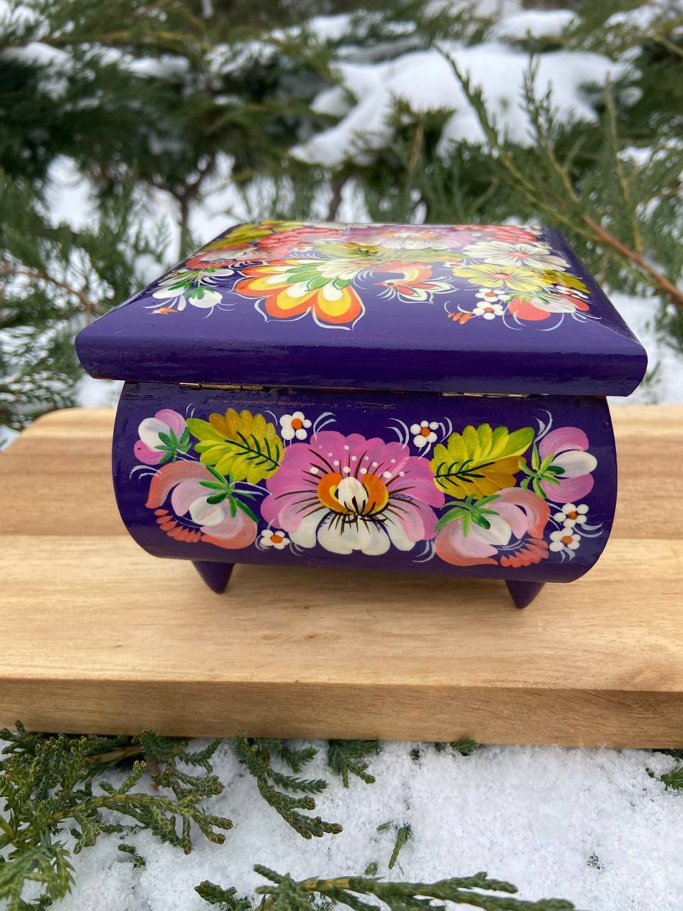 この美しいジュエリーボックスは、ペトリキフカ村のシナノキゾクの樹木から一から手作業で切り彫られ、細部にわたって丁寧に仕上げられています。シナノキの木材は、ウクライナでは御守りとしての意味を持ち、幸運と安全をもたらすと信じられています。