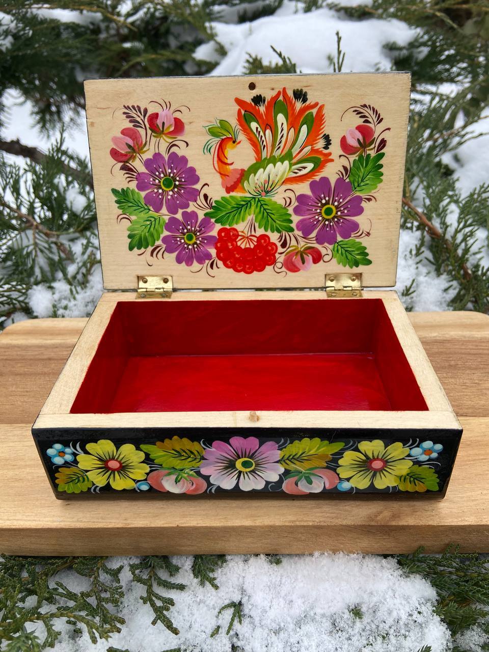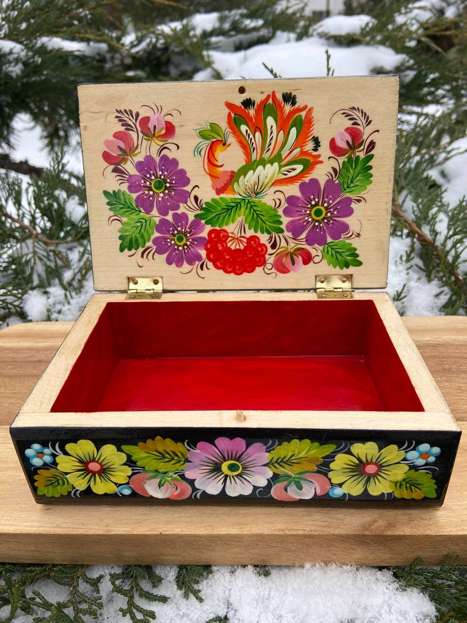 この美しいジュエリーボックスは、ペトリキフカ村のシナノキゾクの樹木から一から手作業で切り彫られ、細部にわたって丁寧に仕上げられています。シナノキの木材は、ウクライナでは御守りとしての意味を持ち、幸運と安全をもたらすと信じられています。