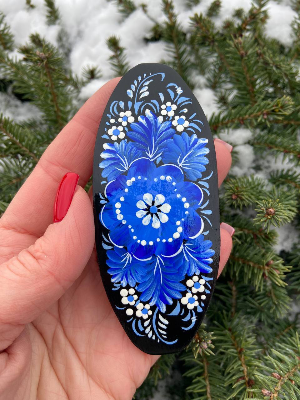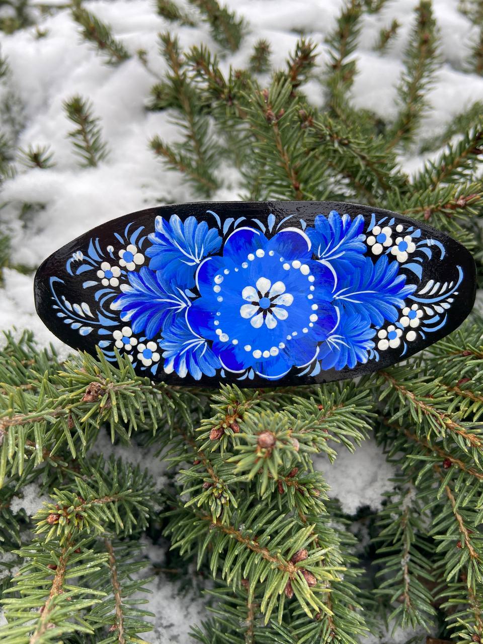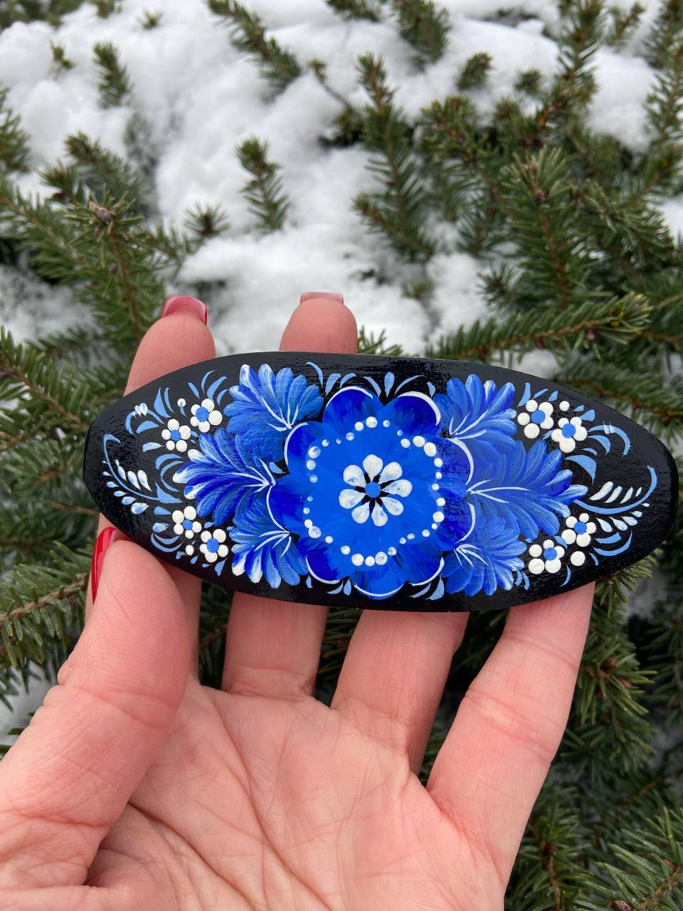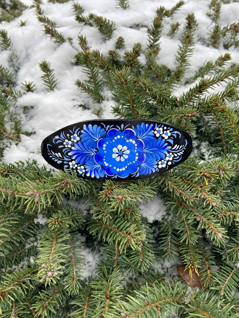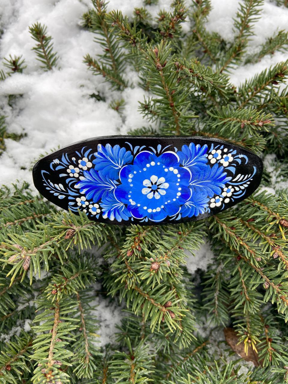 ペトリキフカの木製バレッタは、ウクライナの伝統美術「ペトリキフカ塗り」の技法を用いた、洗練されたヘアアクセサリーです。このヘアピンは、ペトリキフカ村に住む名工、ホロヴィッツ(国家名誉職人・人間国宝)によって手作りされています。彼女は数世紀にわたって受け継がれるこの技法を現代のファッションアイテムに落とし込んでいます。