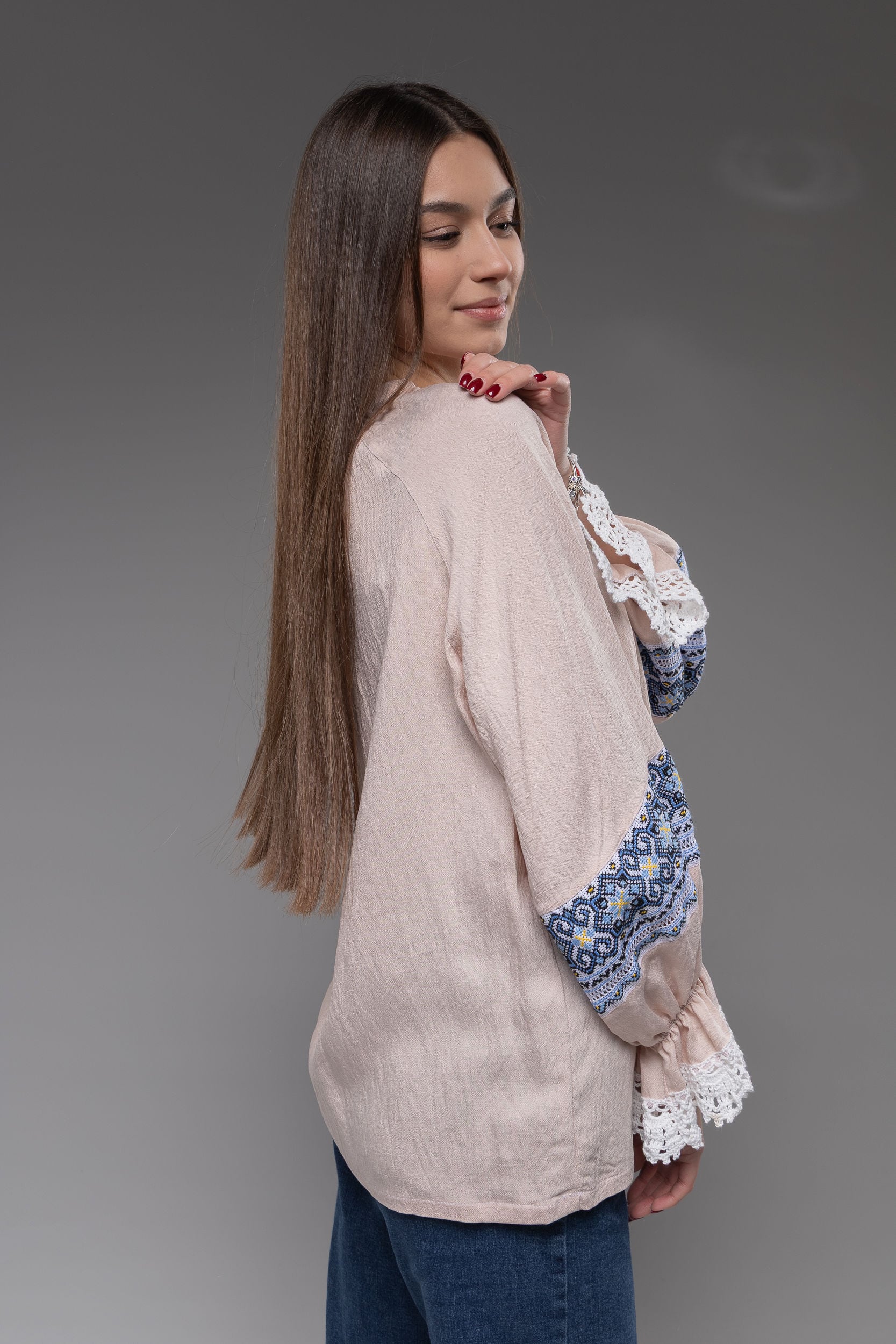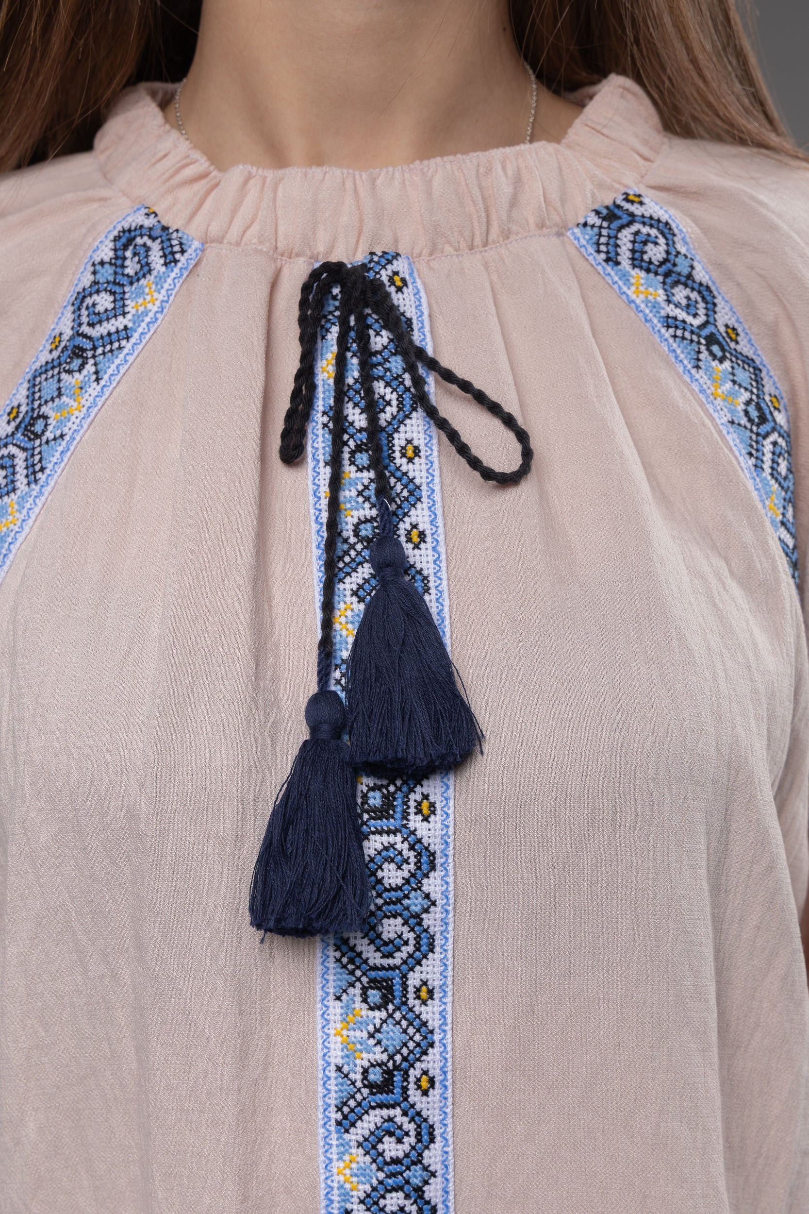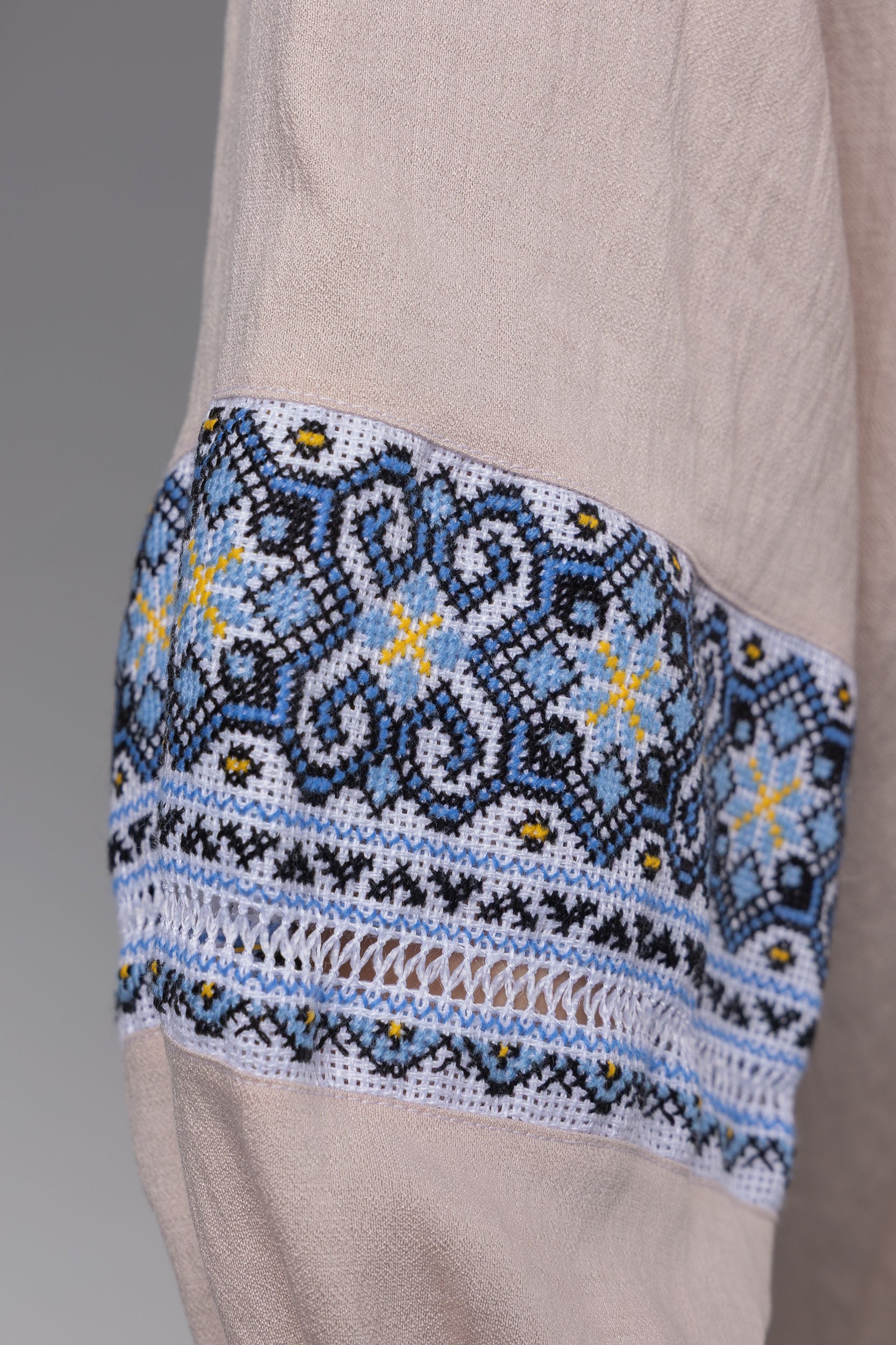 この作品は、ウクライナの伝統と美しさを象徴するヴィシヴァンカの刺繍を採用しています。過度な派手さを追求せず、日本の日常生活に自然に溶け込むデザインとなっております。しかし、それでいて洗練された高級感とカジュアルな雰囲気を両立させ、見る人を魅了する一着となっています。