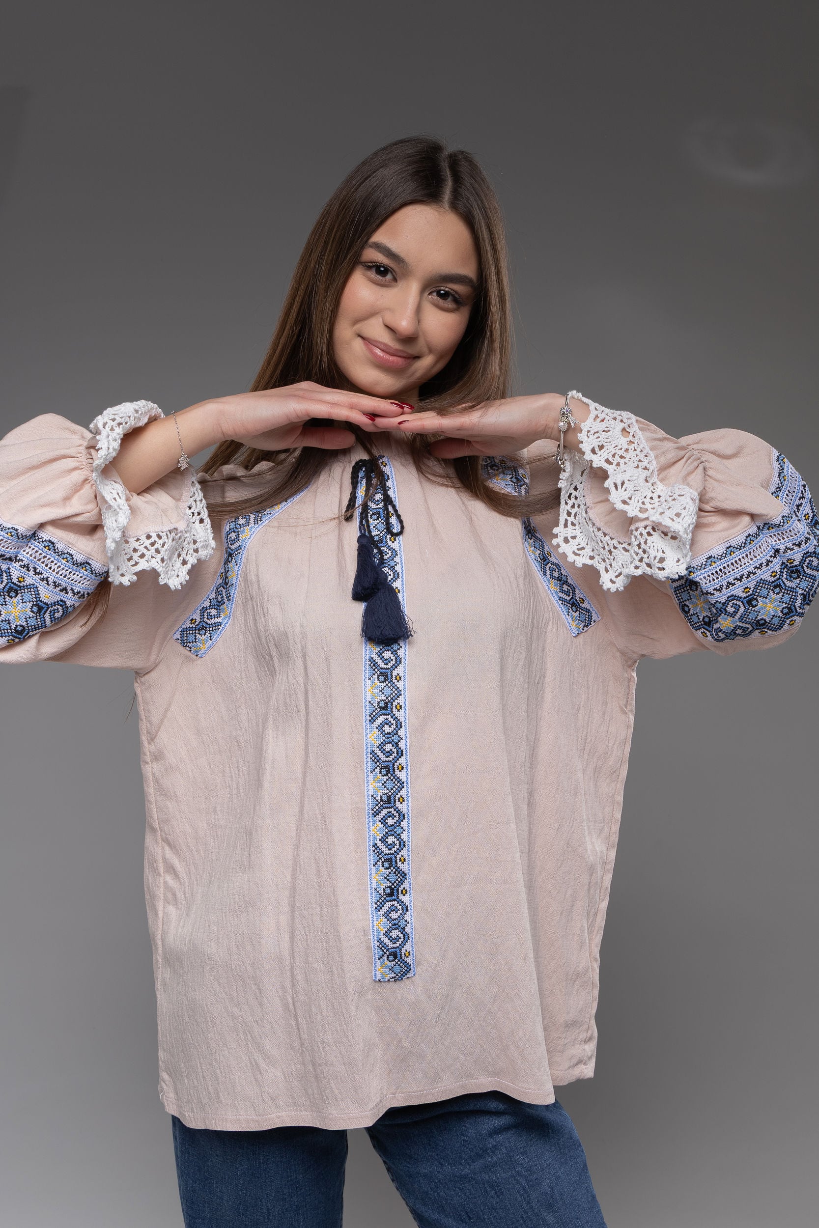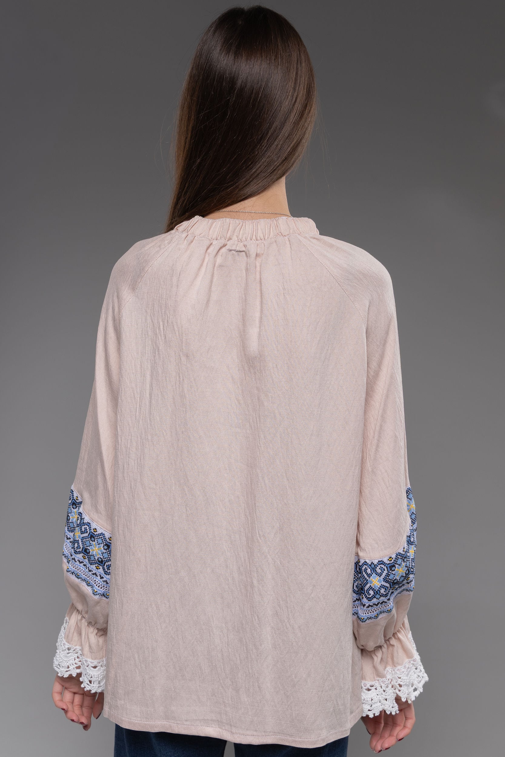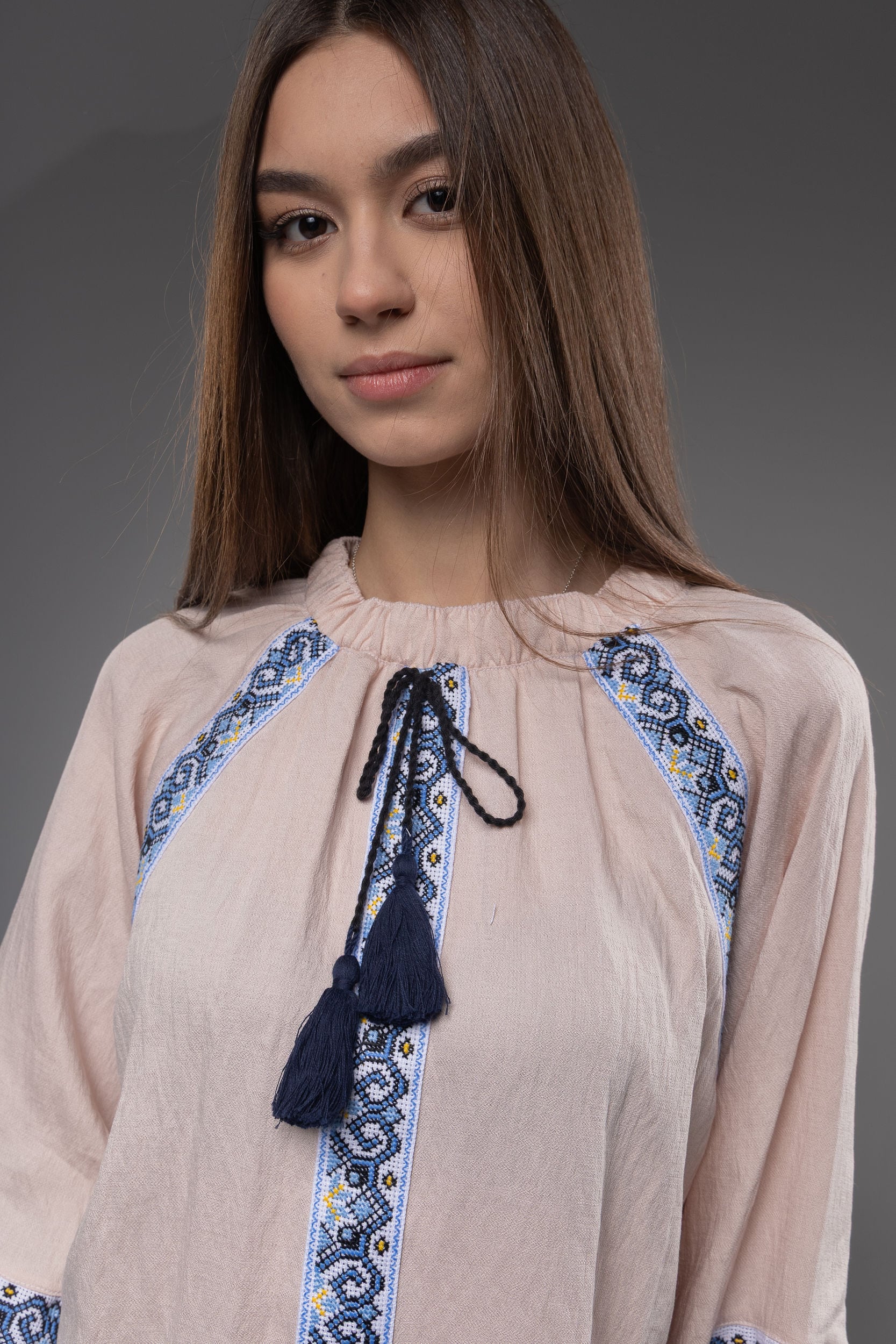 この作品は、ウクライナの伝統と美しさを象徴するヴィシヴァンカの刺繍を採用しています。過度な派手さを追求せず、日本の日常生活に自然に溶け込むデザインとなっております。しかし、それでいて洗練された高級感とカジュアルな雰囲気を両立させ、見る人を魅了する一着となっています。
