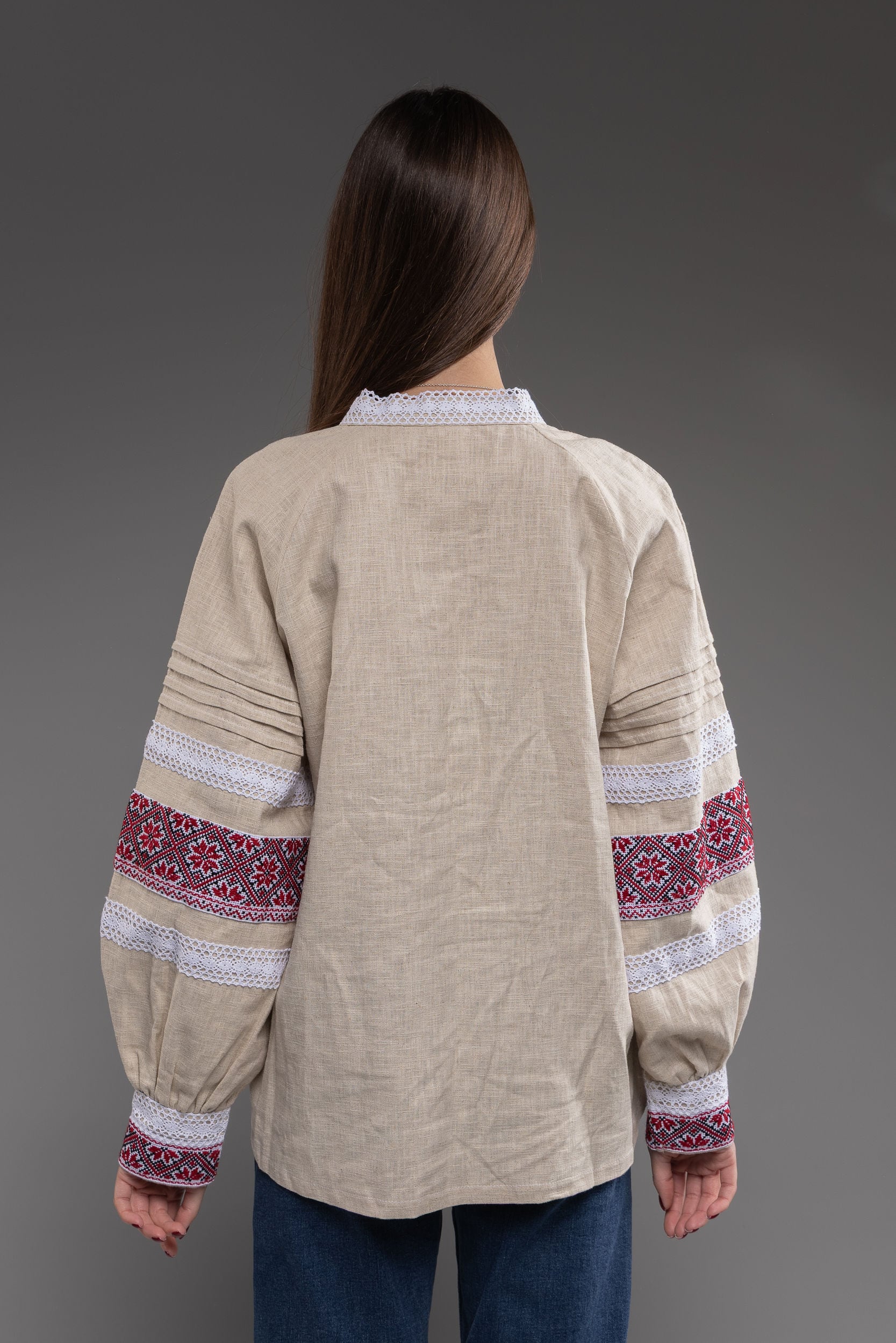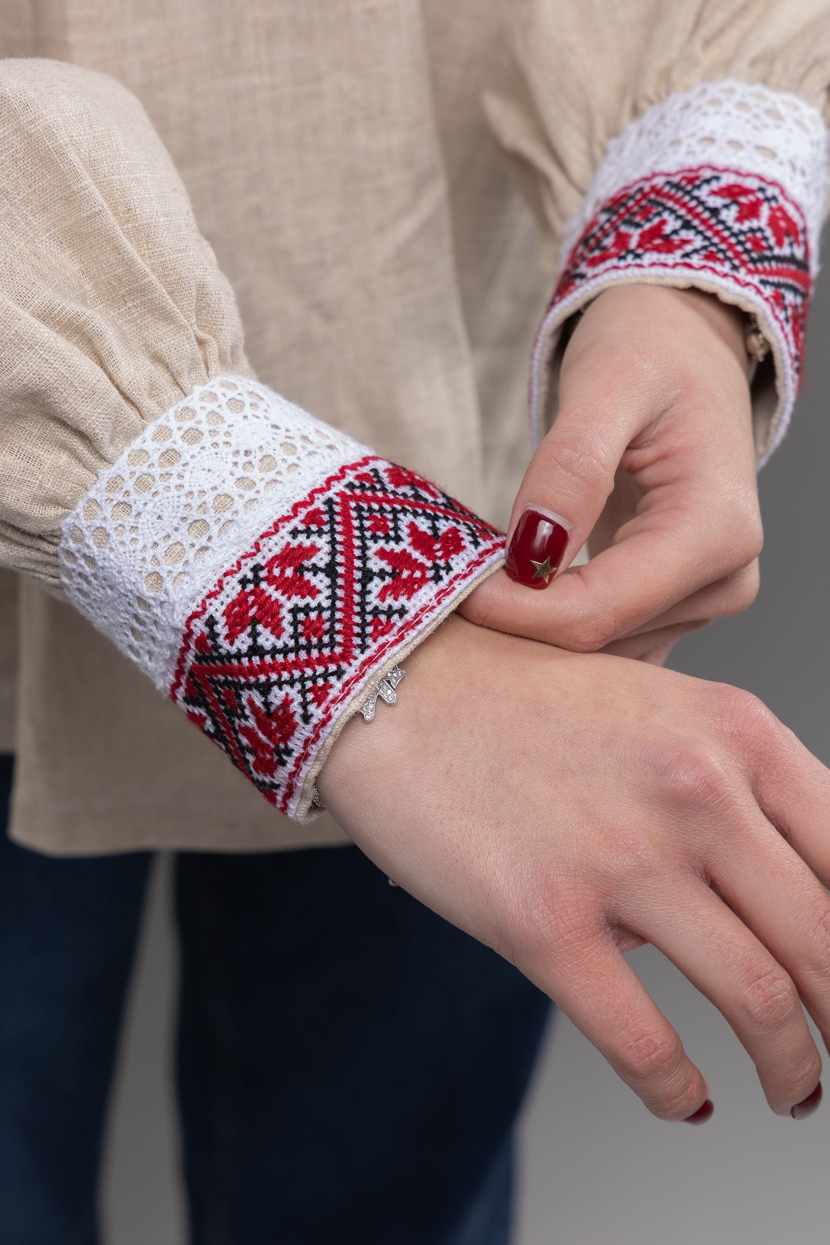 この作品は、ウクライナの伝統と美しさを象徴するヴィシヴァンカの刺繍を採用しています。過度な派手さを追求せず、日本の日常生活に自然に溶け込むデザインとなっております。しかし、それでいて洗練された高級感とカジュアルな雰囲気を両立させ、見る人を魅了する一着となっています。