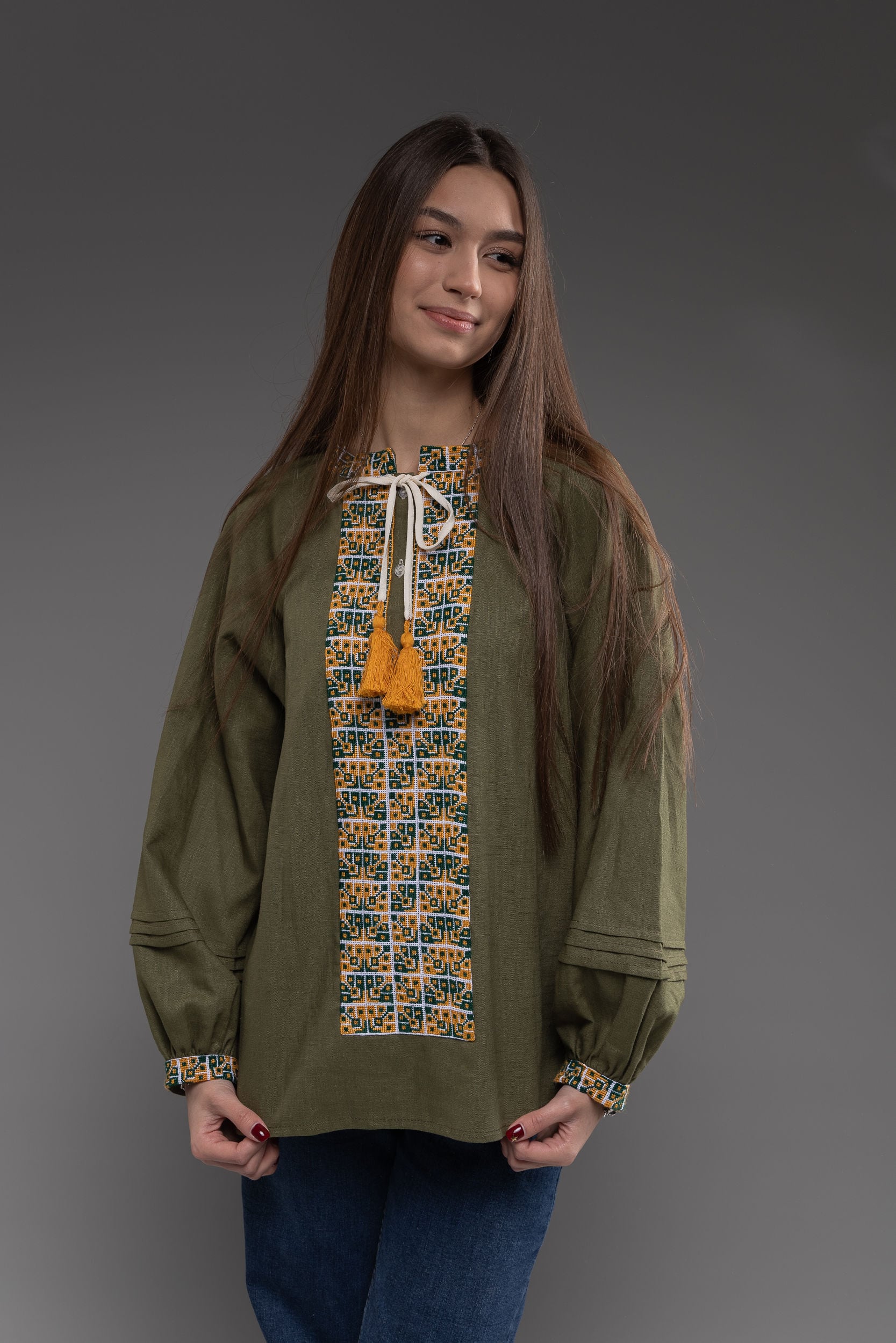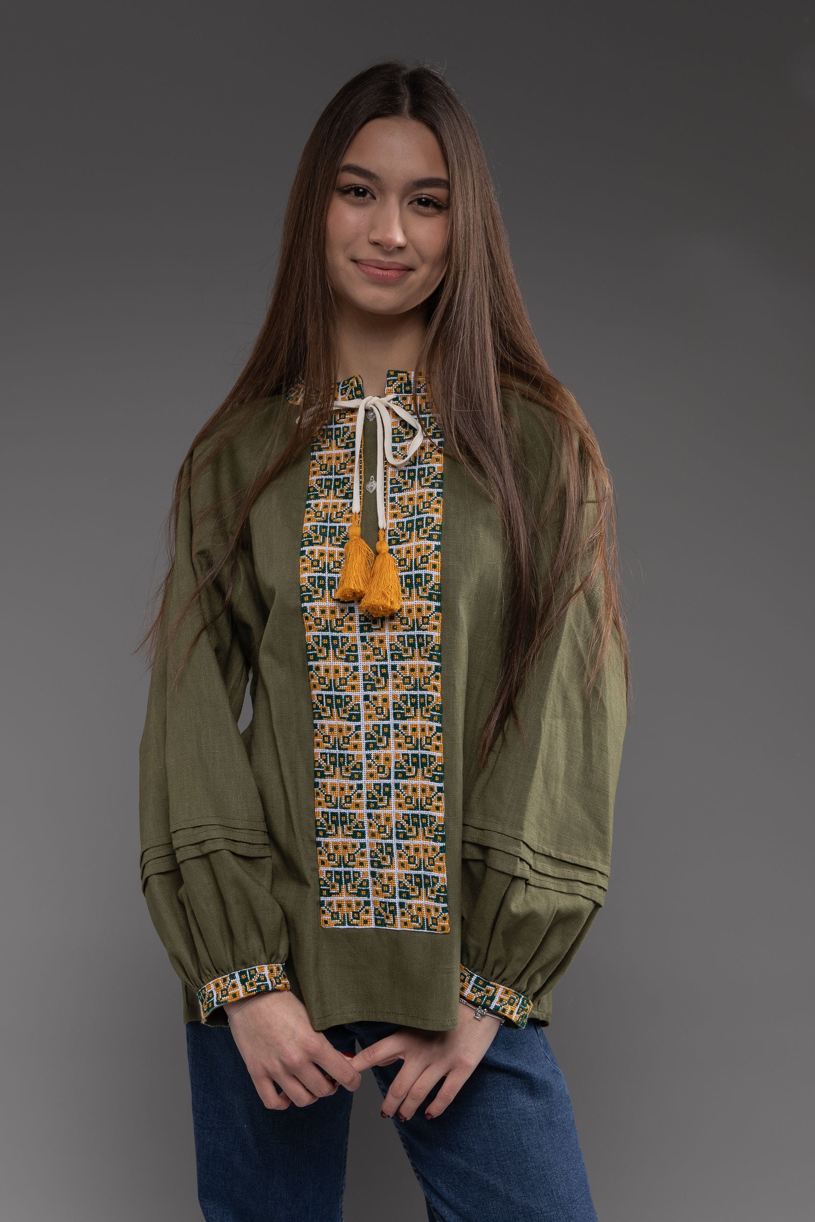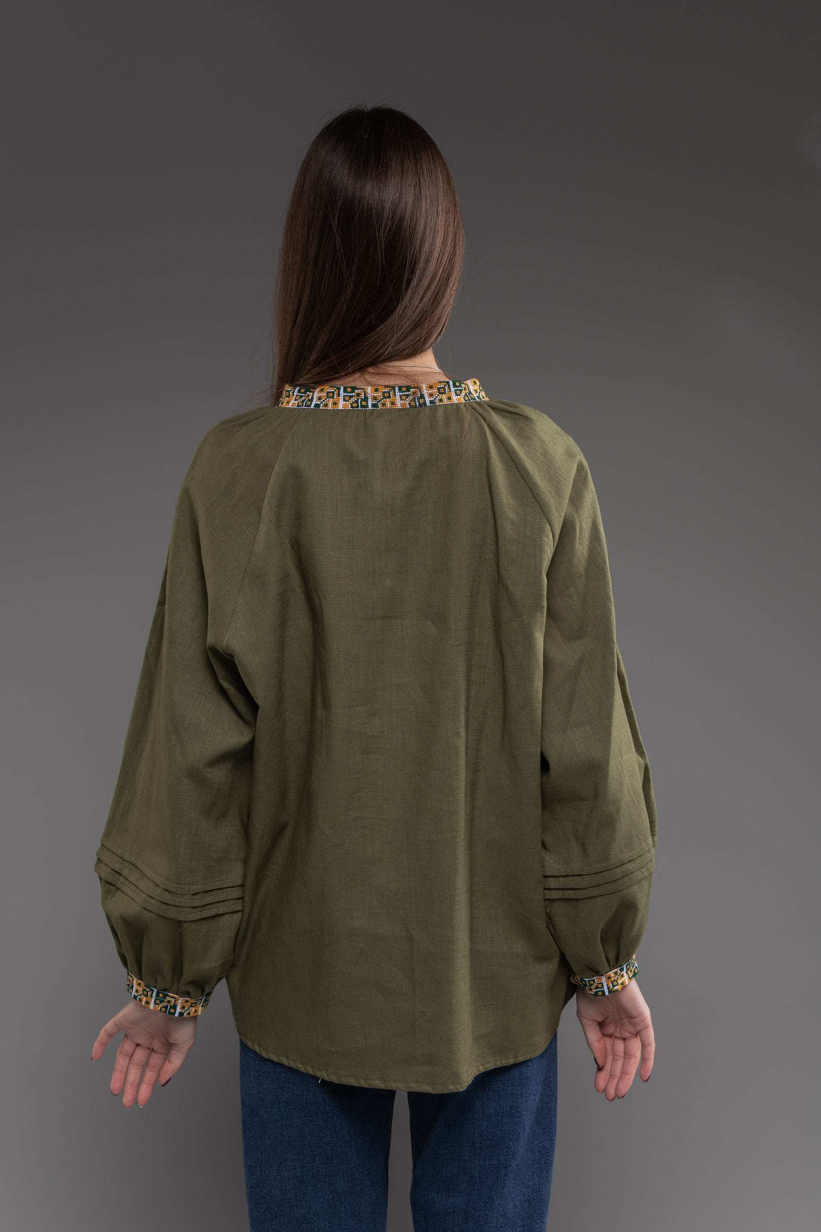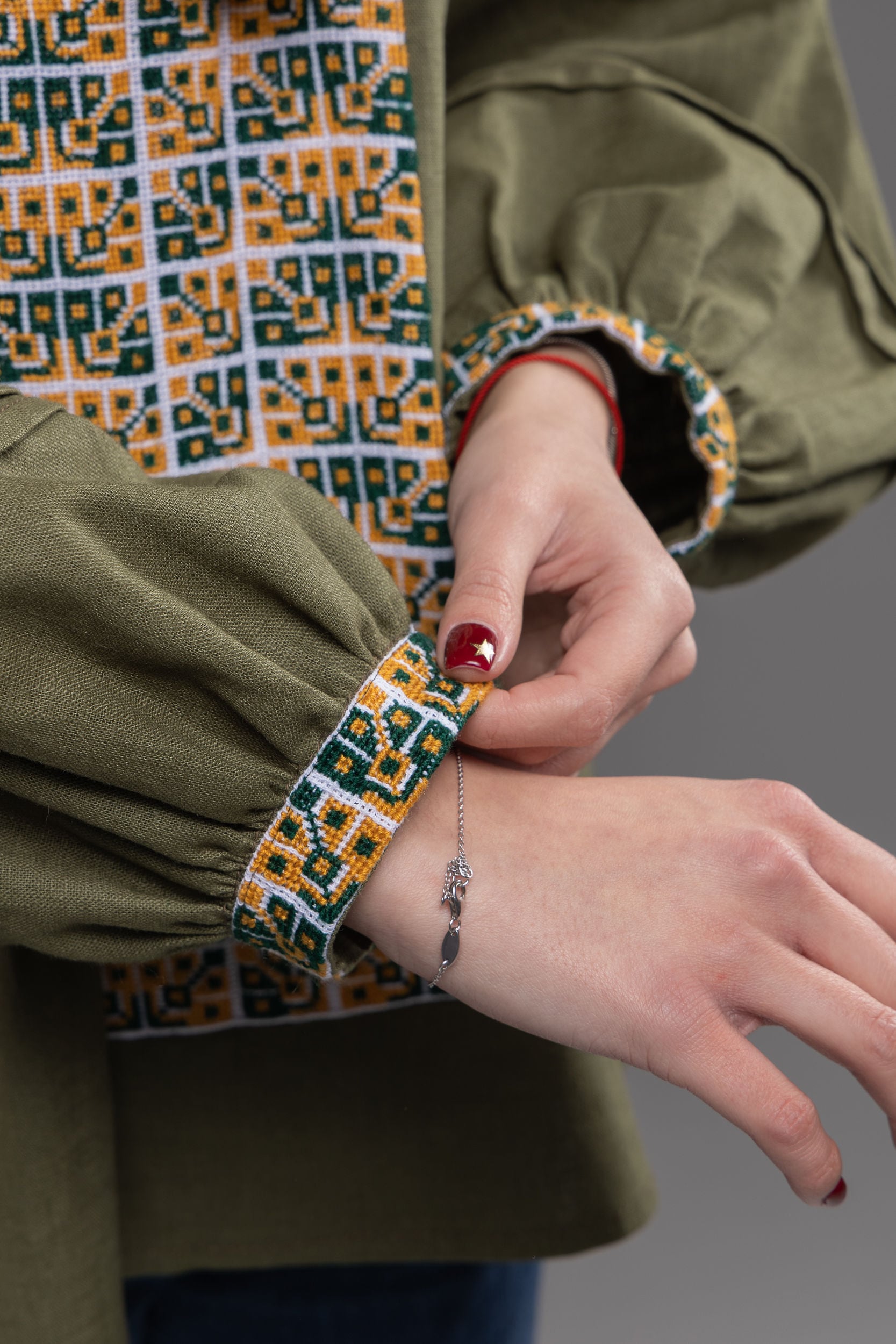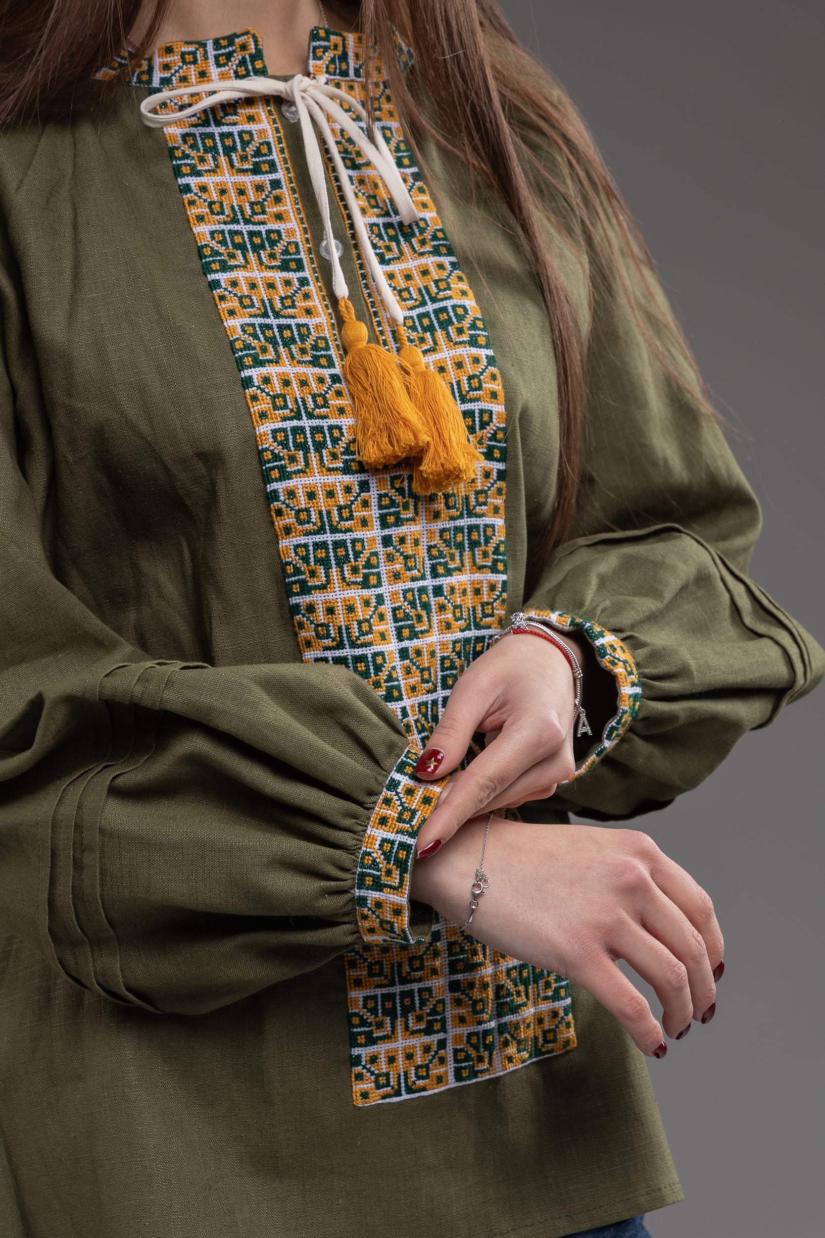 この作品は、ウクライナの伝統と美しさを象徴するヴィシヴァンカの刺繍を採用しています。過度な派手さを追求せず、日本の日常生活に自然に溶け込むデザインとなっております。しかし、それでいて洗練された高級感とカジュアルな雰囲気を両立させ、見る人を魅了する一着となっています。