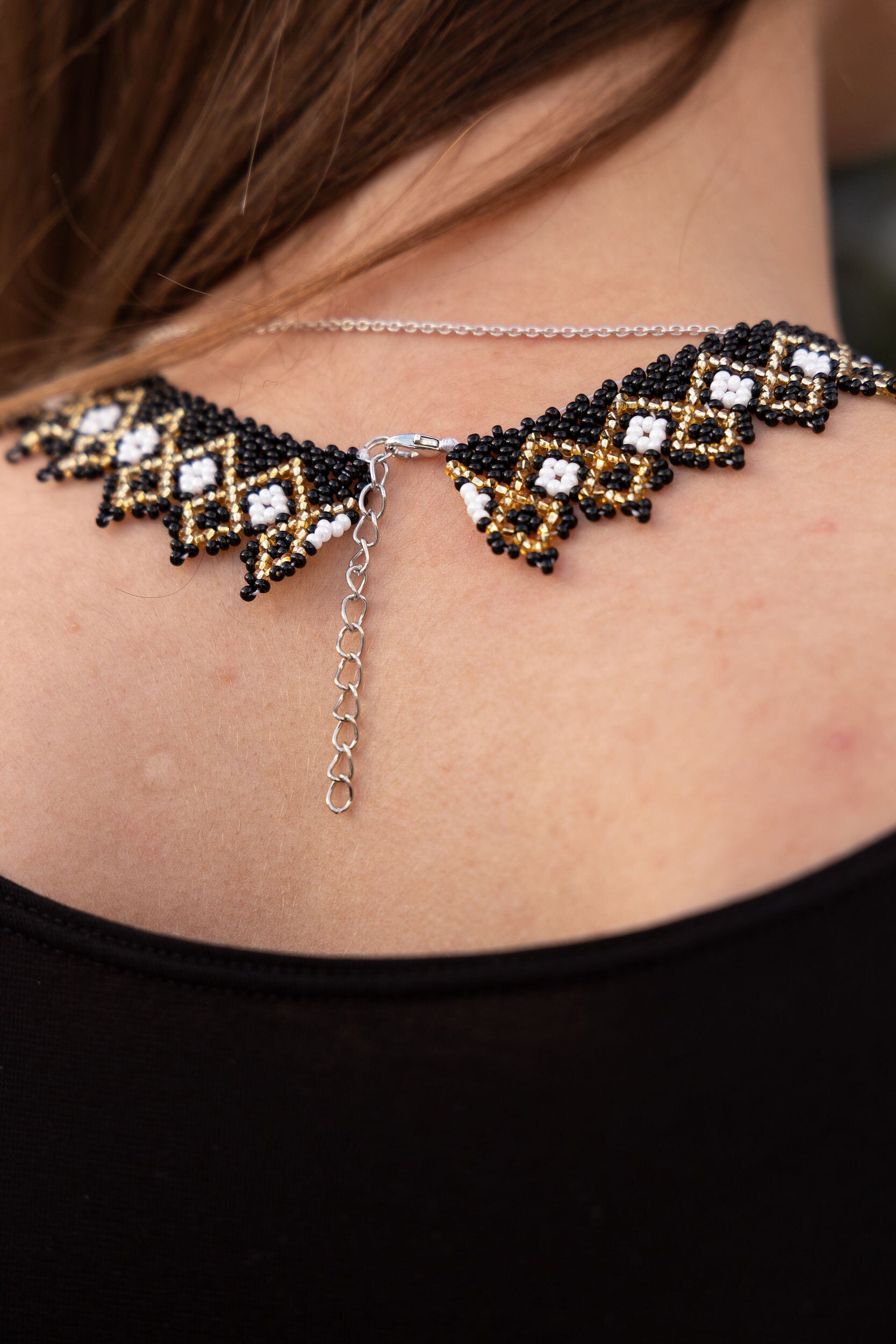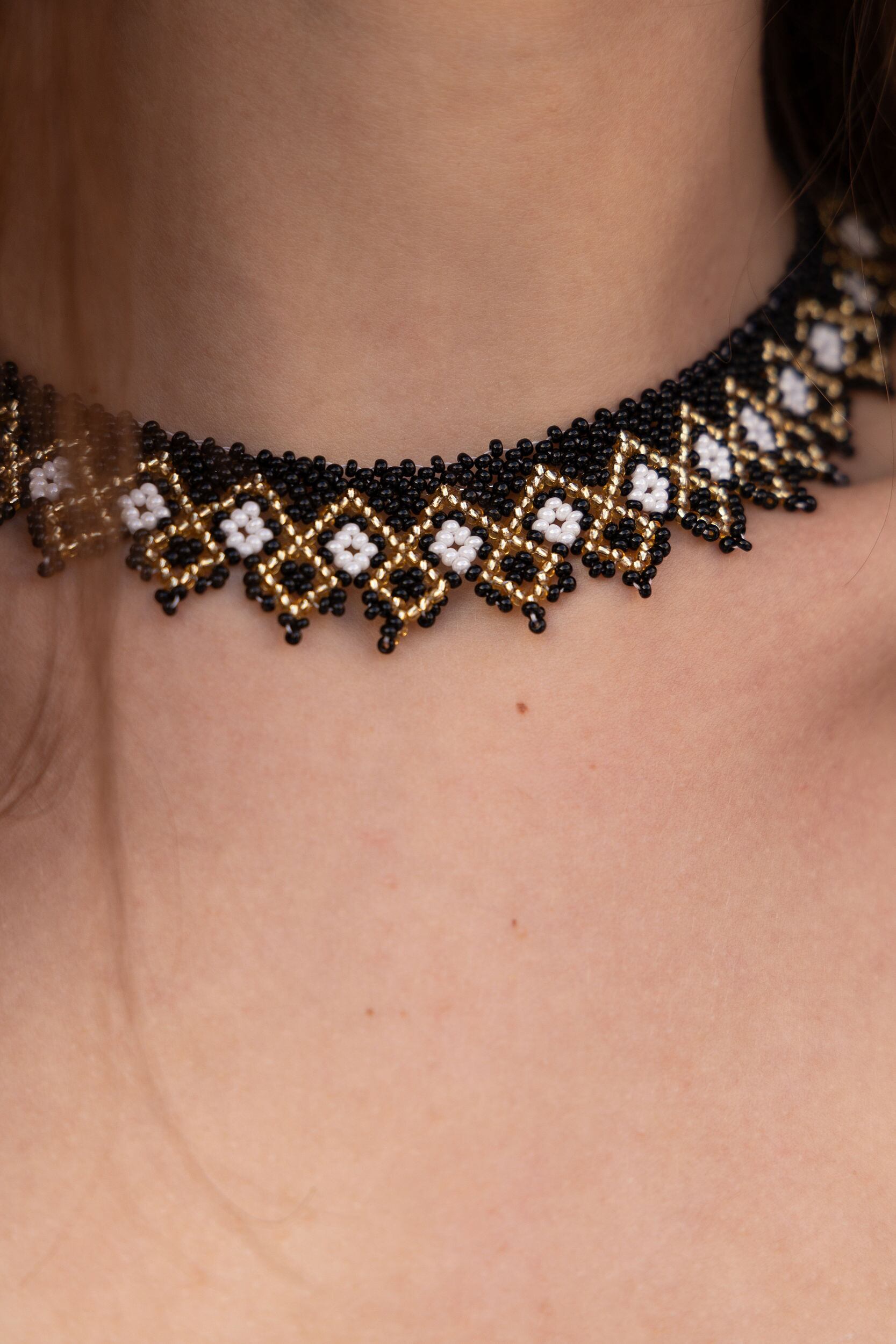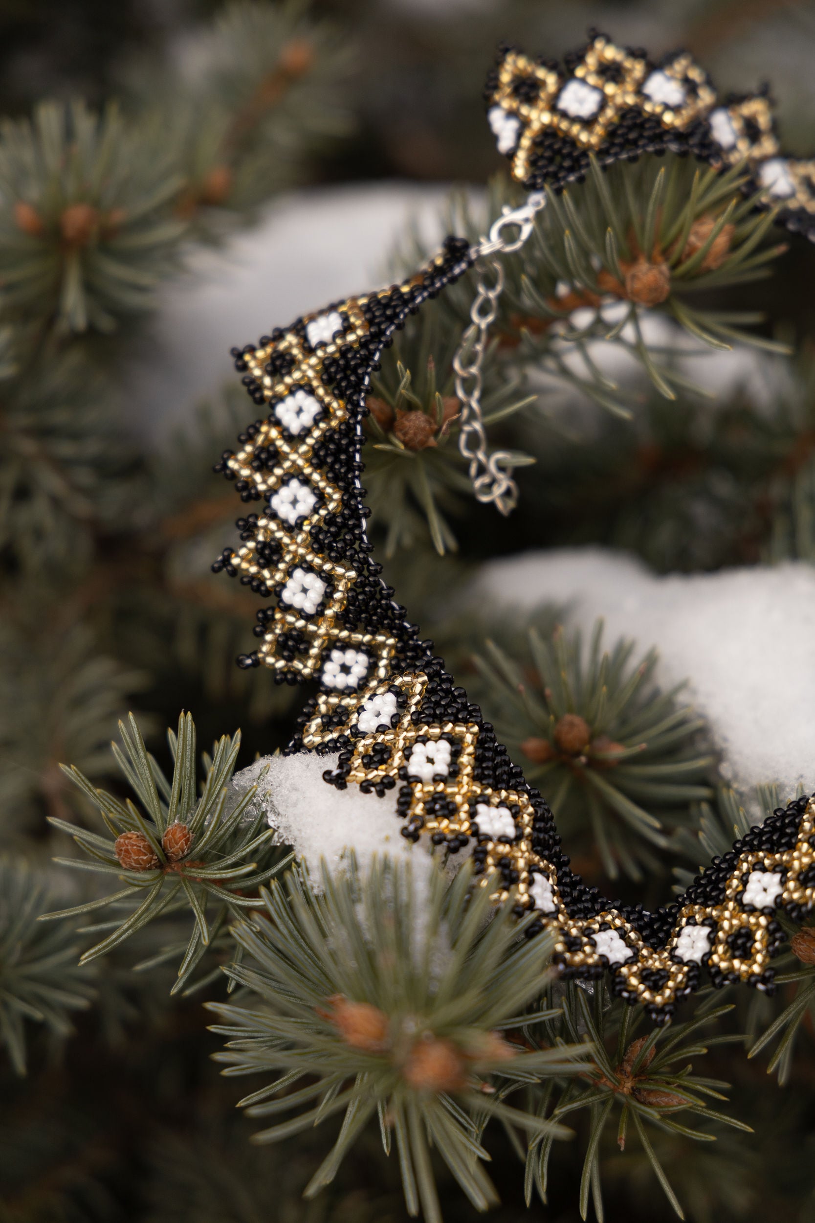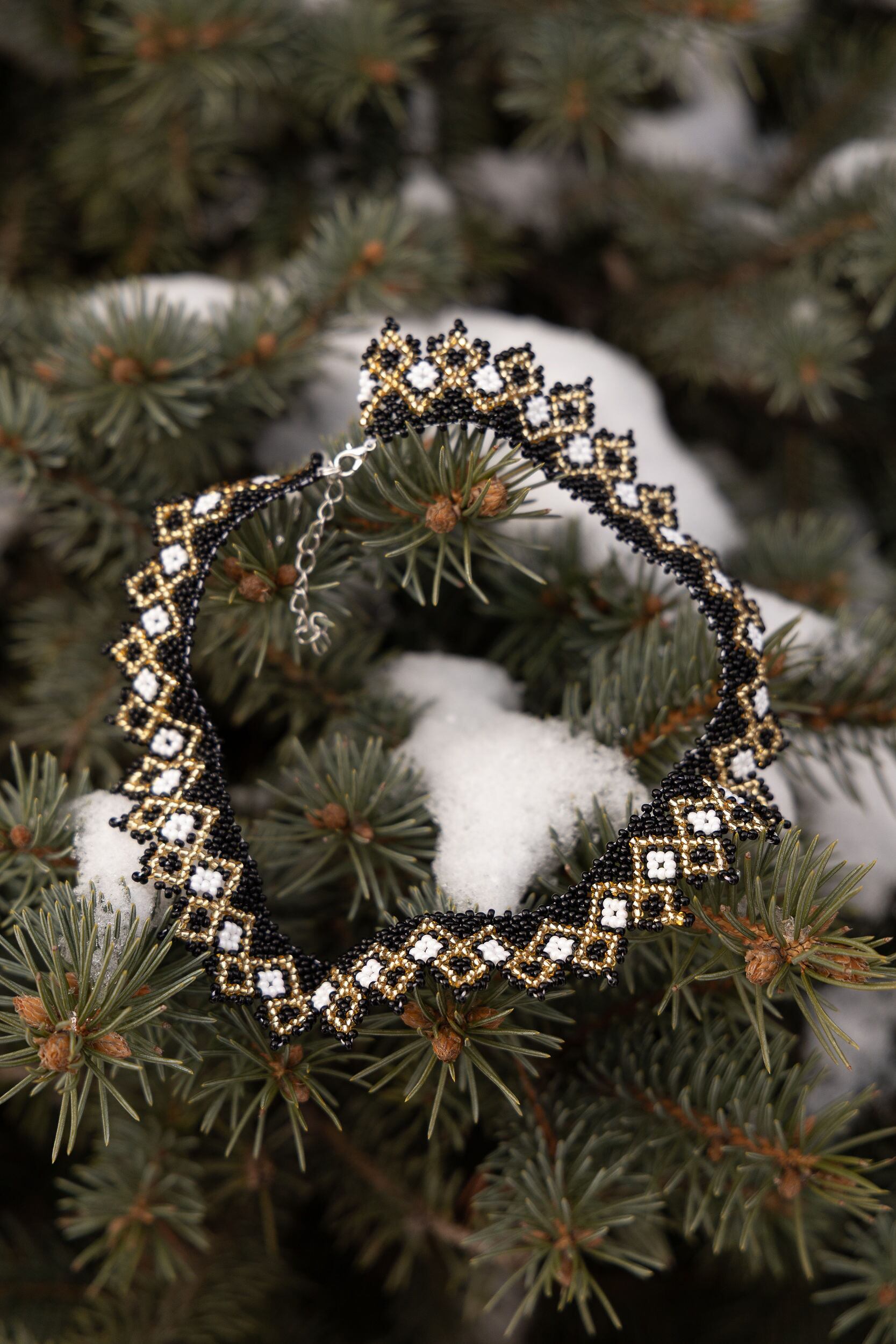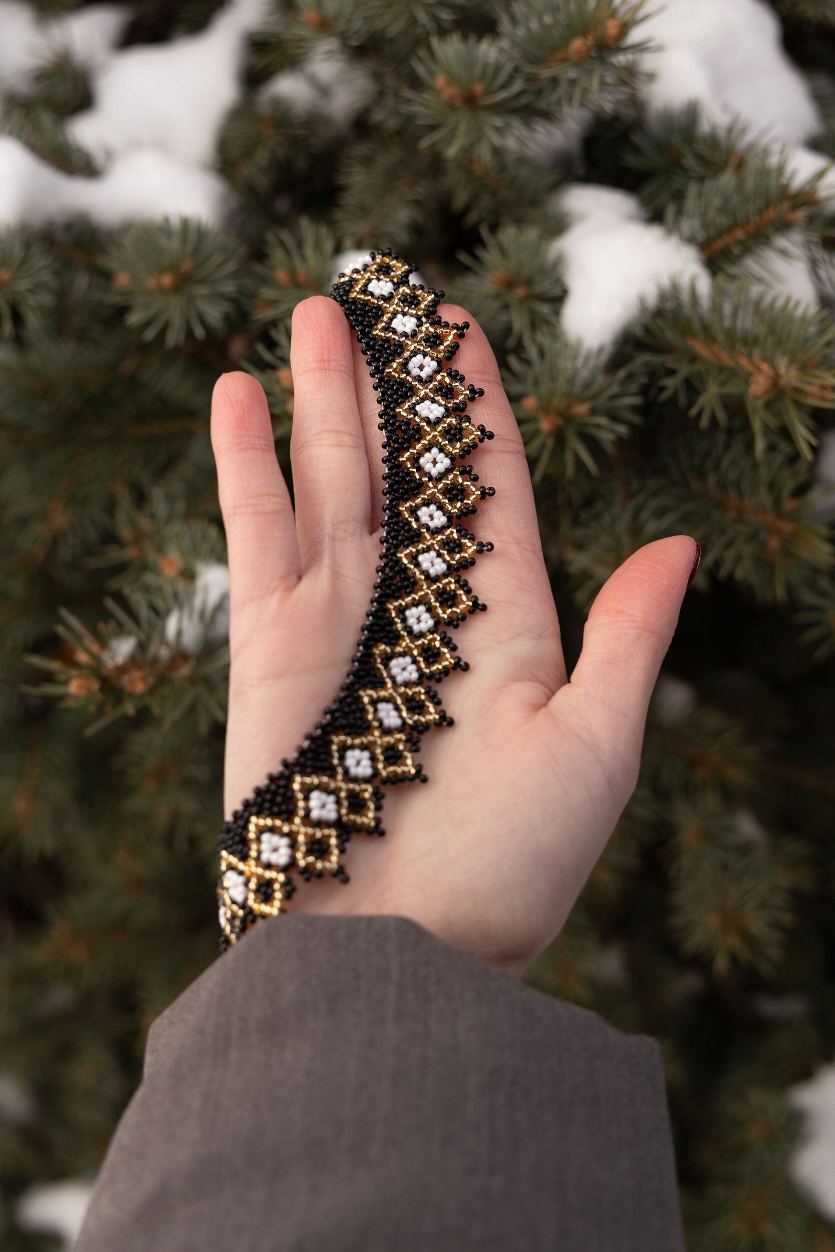 ウクライナ産ガラス100%、最高品質のビーズを用いて、ひとつひとつ手作業でウクライナの民族衣装ヴィシヴァンカにも用いられる幾何学な模様を作り出します。