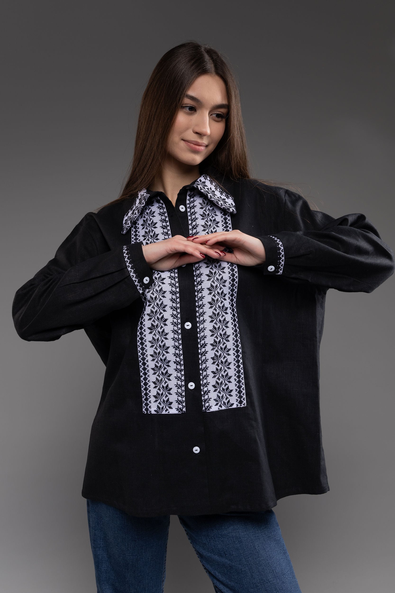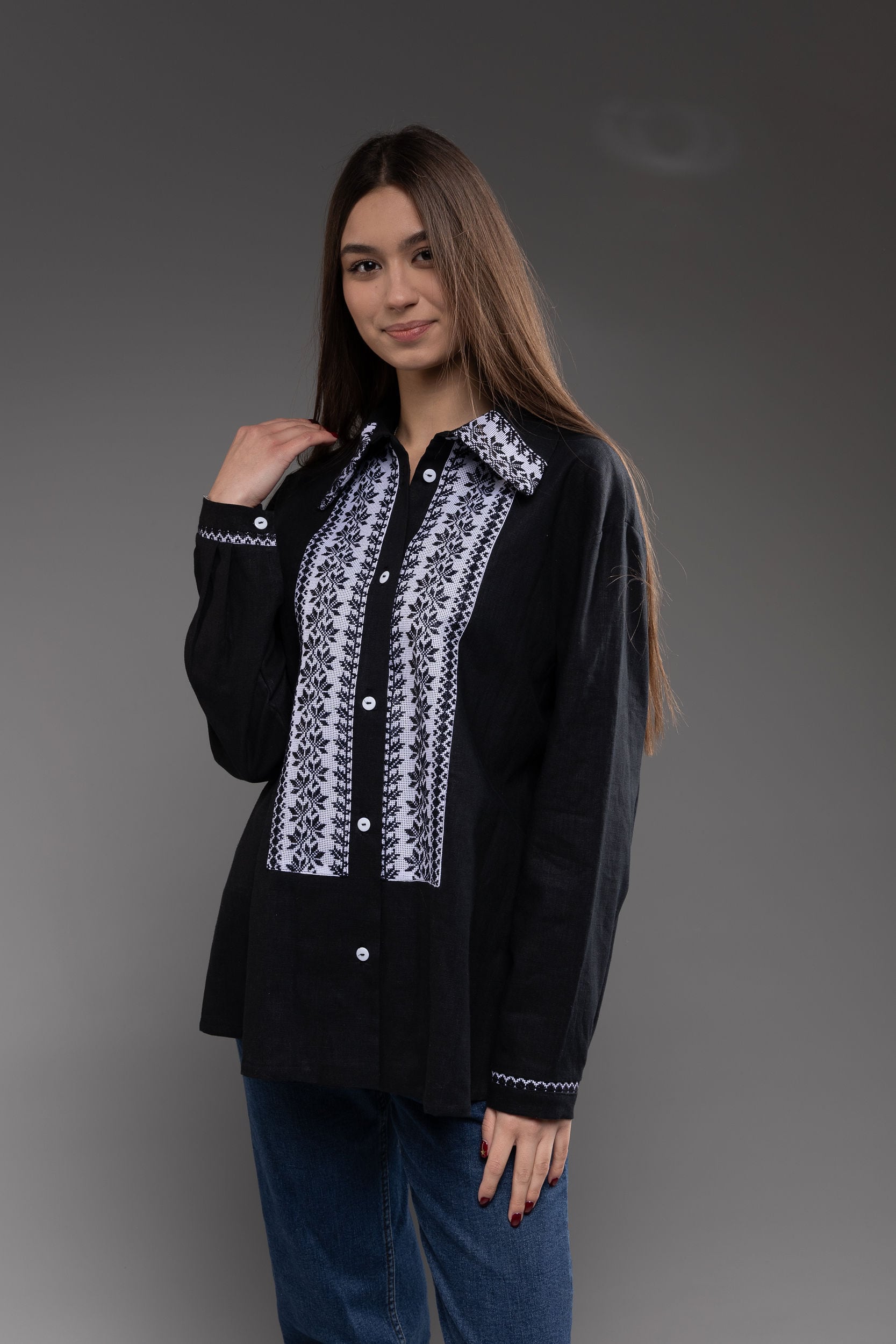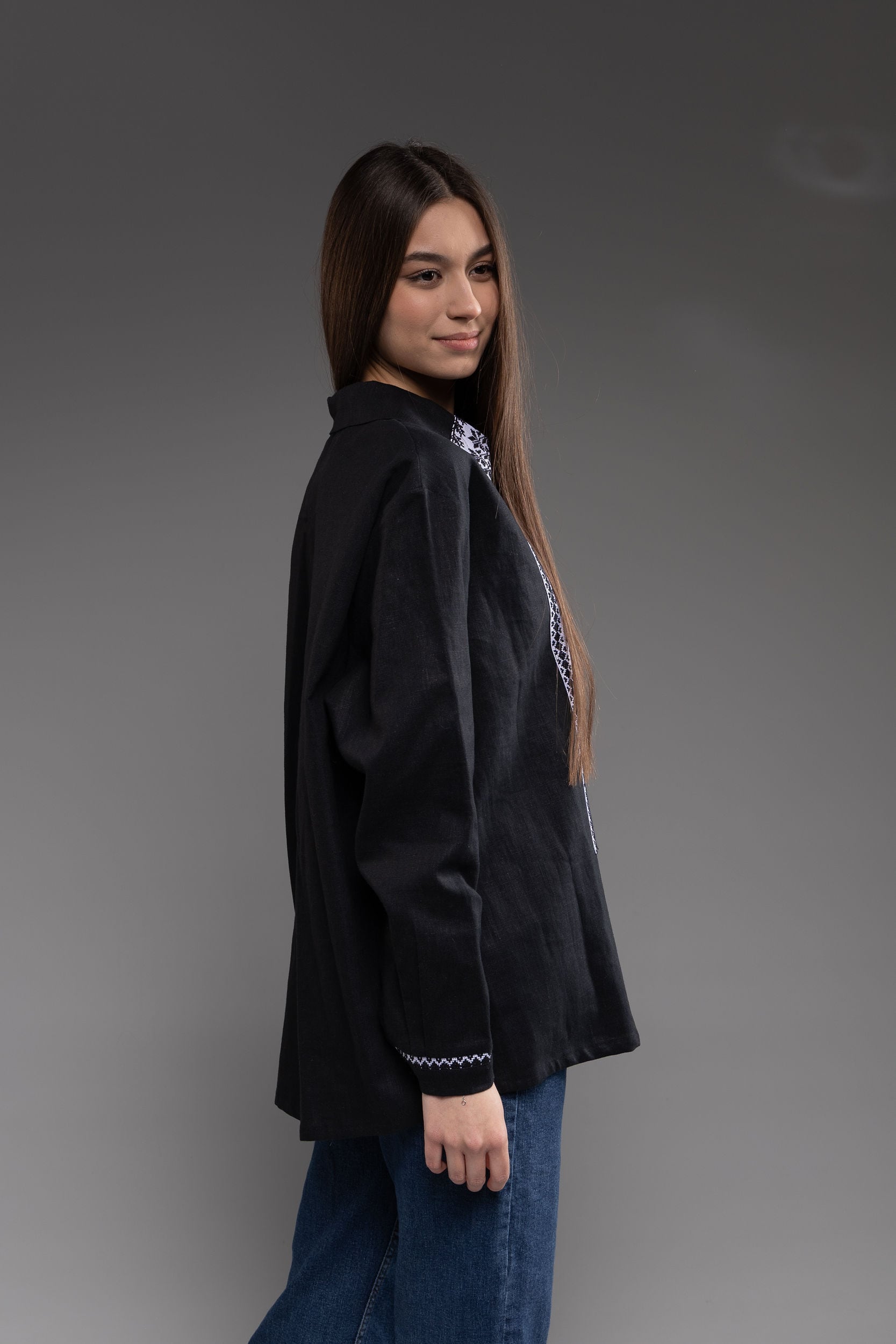 この作品は、ウクライナの伝統と美しさを象徴するヴィシヴァンカの刺繍を採用しています。過度な派手さを追求せず、日本の日常生活に自然に溶け込むデザインとなっております。しかし、それでいて洗練された高級感とカジュアルな雰囲気を両立させ、見る人を魅了する一着となっています。