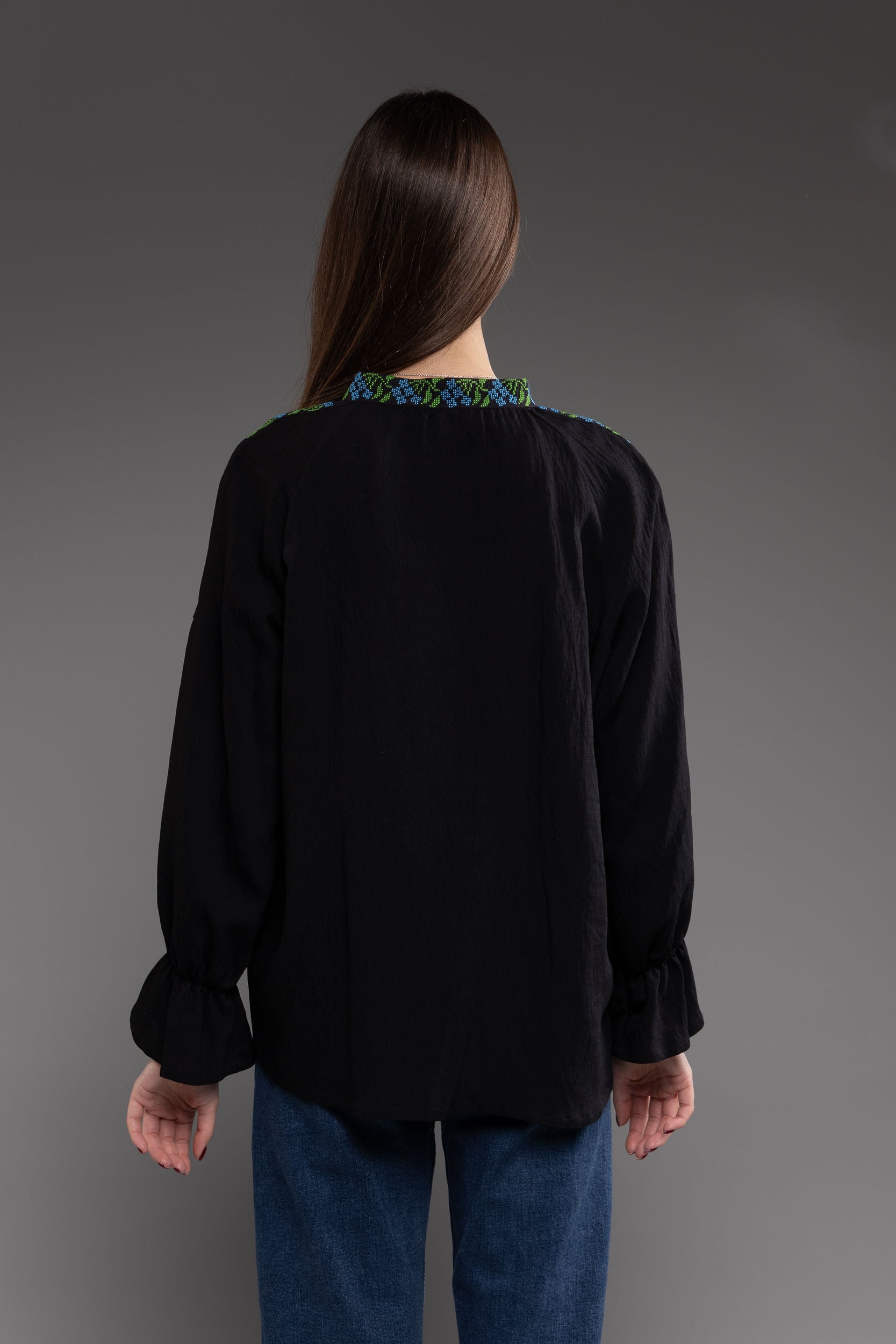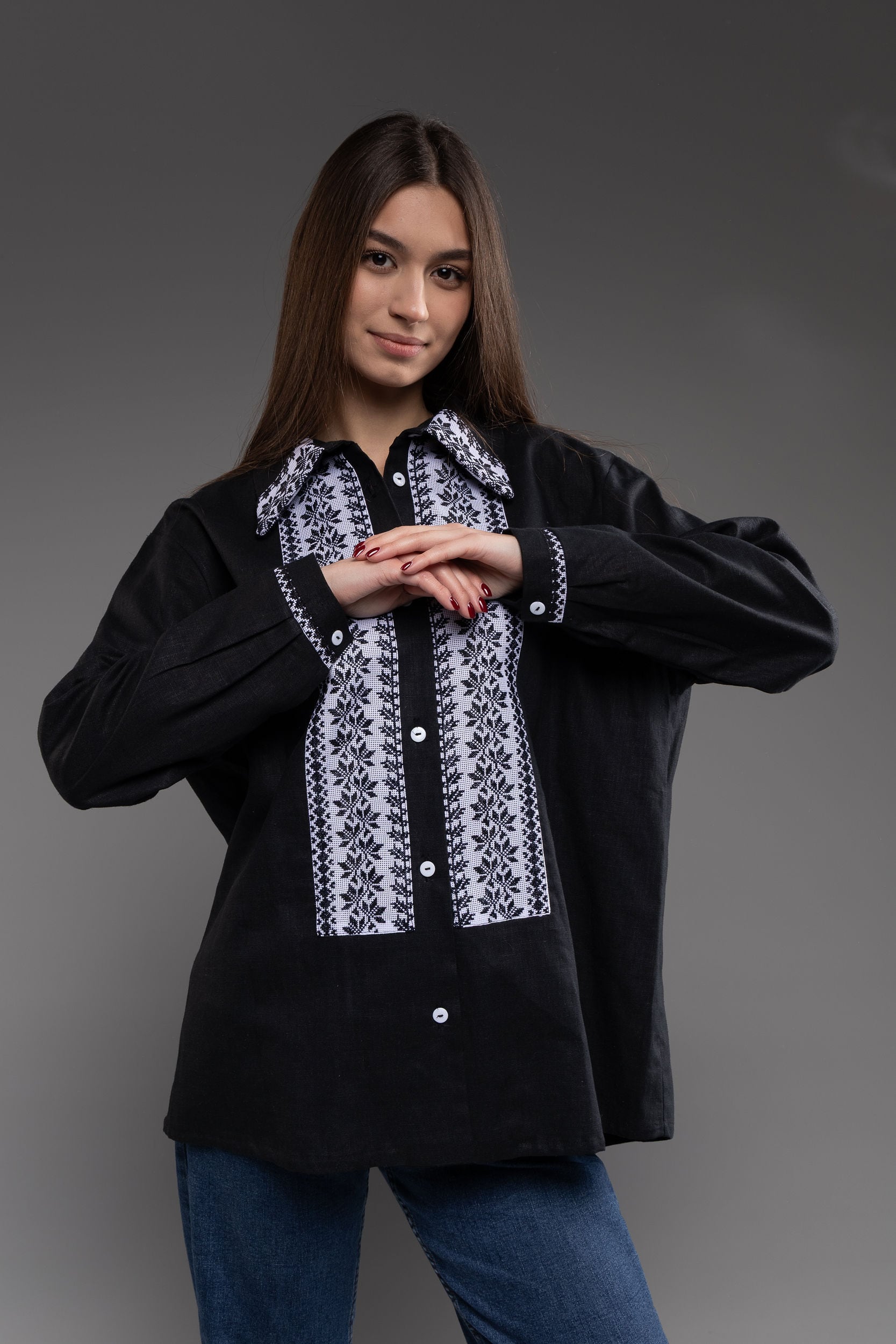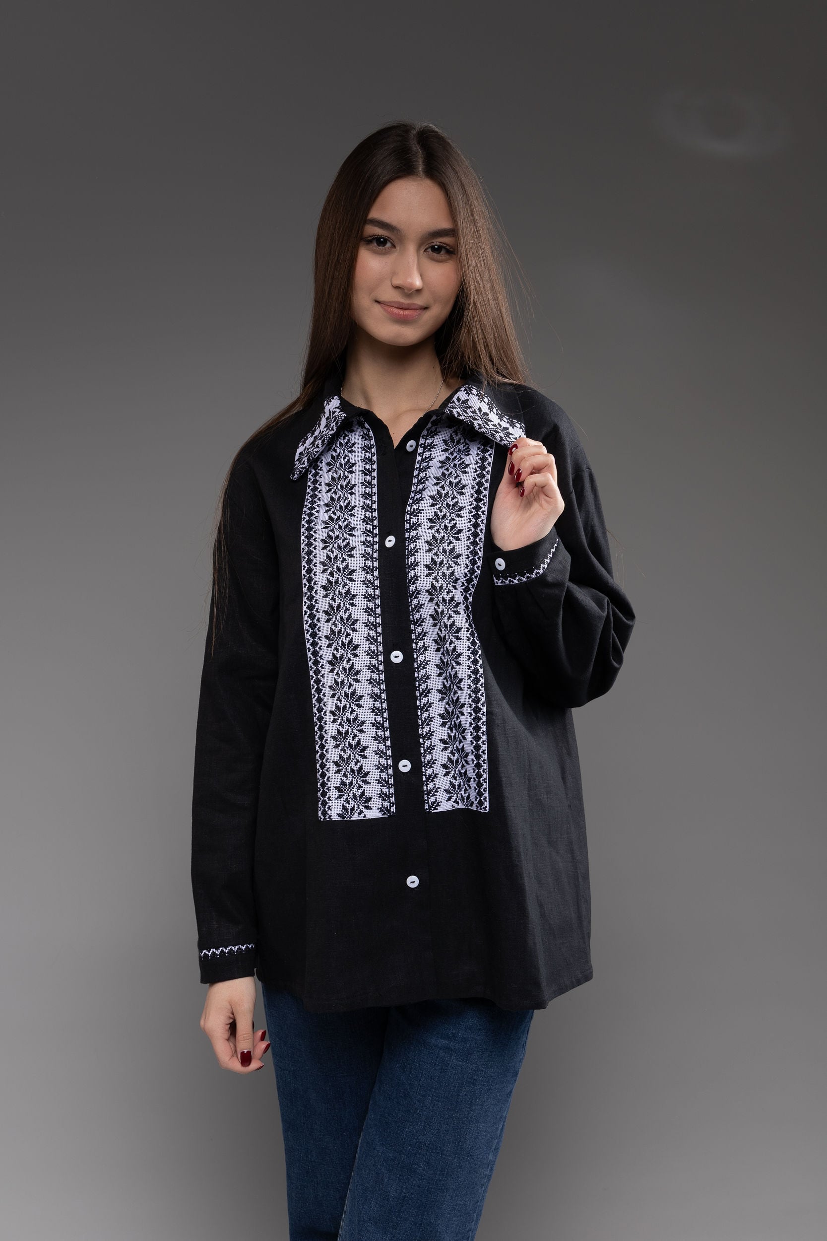 この作品は、ウクライナの伝統と美しさを象徴するヴィシヴァンカの刺繍を採用しています。過度な派手さを追求せず、日本の日常生活に自然に溶け込むデザインとなっております。しかし、それでいて洗練された高級感とカジュアルな雰囲気を両立させ、見る人を魅了する一着となっています。