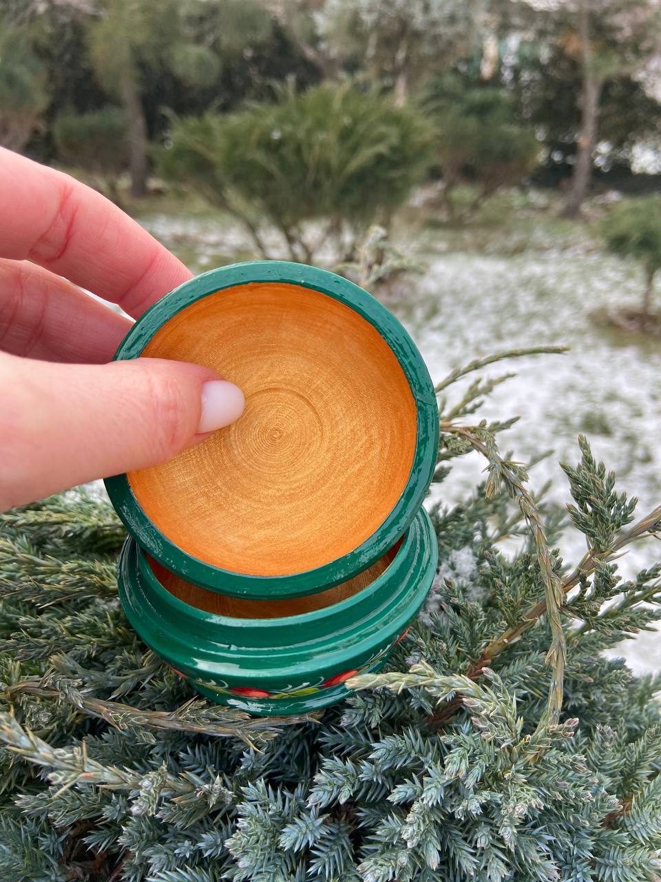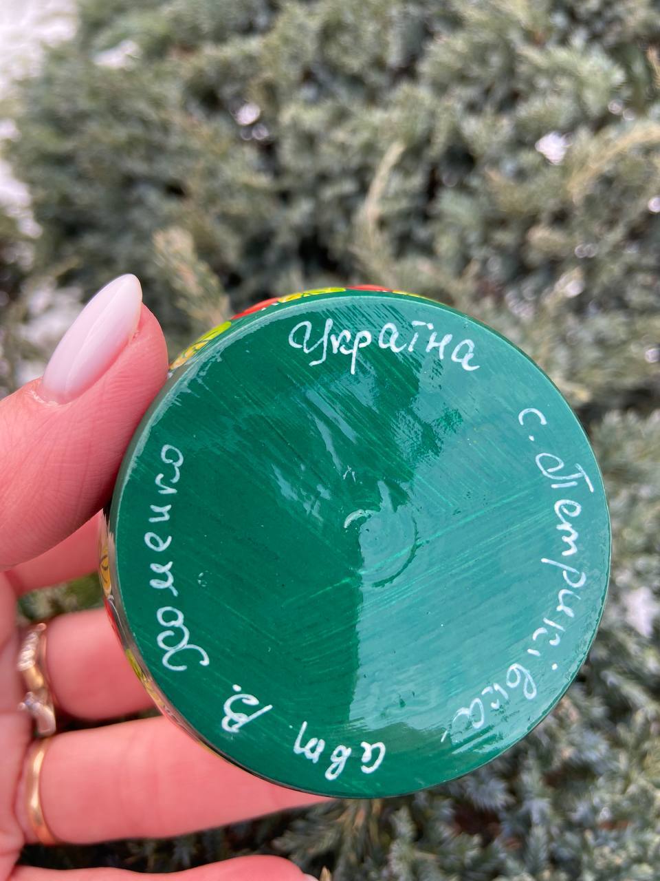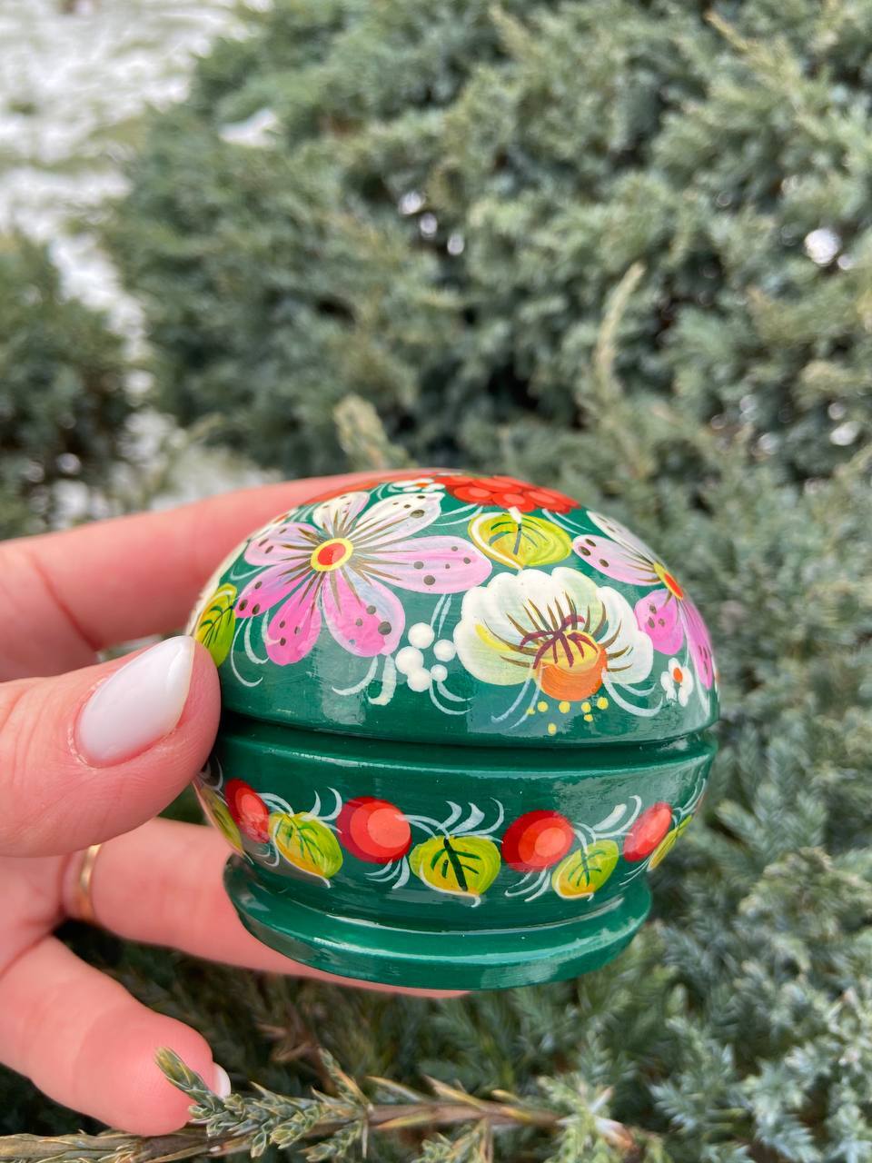 ペトリキフカ・ジュエリーボックスは、ウクライナ・ドニプロに位置するペトリキフカ村の職人によって手作りされた、小さくて繊細な宝物です。サイズは約6×3cmで、小さなジュエリーや大切な小物を収納するのに適したサイズです。