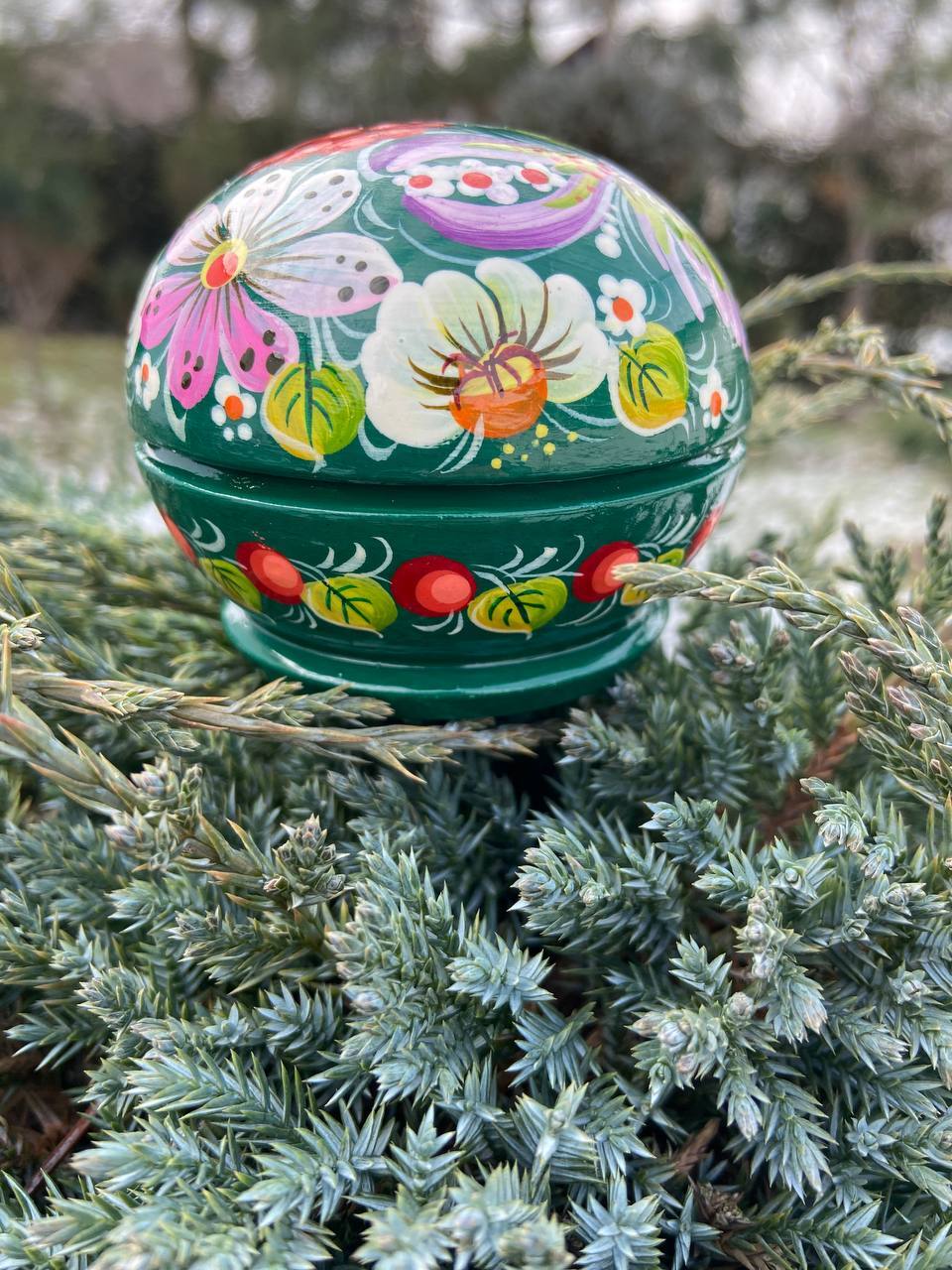 このジュエリーボックスは、ウクライナの伝統的なペトリキフカ塗り技法で装飾されています。2013年にユネスコの無形文化遺産に登録されたこの技法は、ウクライナの文化的遺産としての価値が高く評価されています。