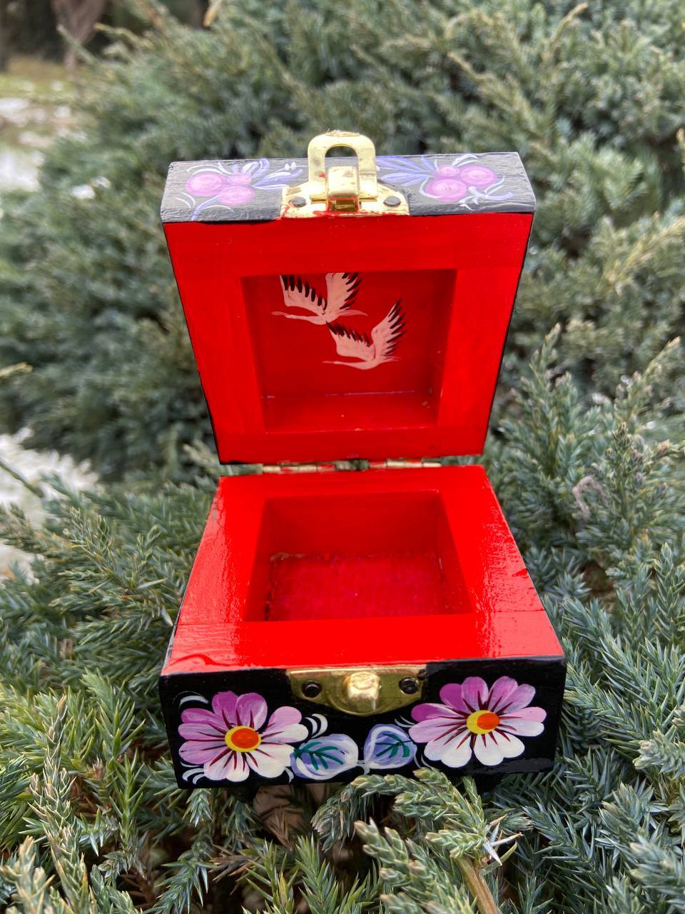 この美しいジュエリーボックスは、ペトリキフカ村のシナノキゾクの樹木から一から手作業で切り彫られ、細部にわたって丁寧に仕上げられています。シナノキの木材は、ウクライナでは御守りとしての意味を持ち、幸運と安全をもたらすと信じられています。