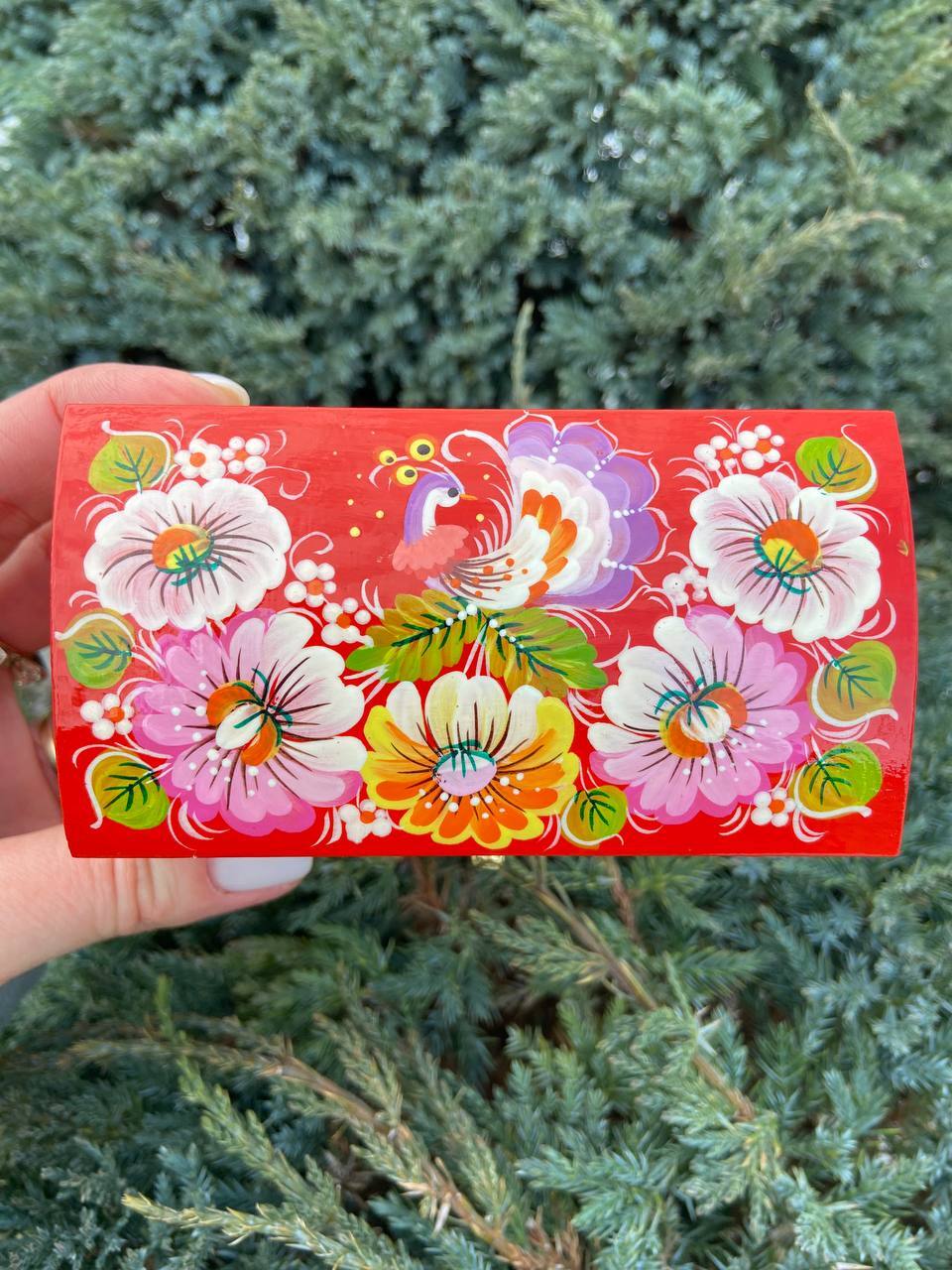 この美しいジュエリーボックスは、ペトリキフカ村のシナノキゾクの樹木から一から手作業で切り彫られ、細部にわたって丁寧に仕上げられています。シナノキの木材は、ウクライナでは御守りとしての意味を持ち、幸運と安全をもたらすと信じられています。