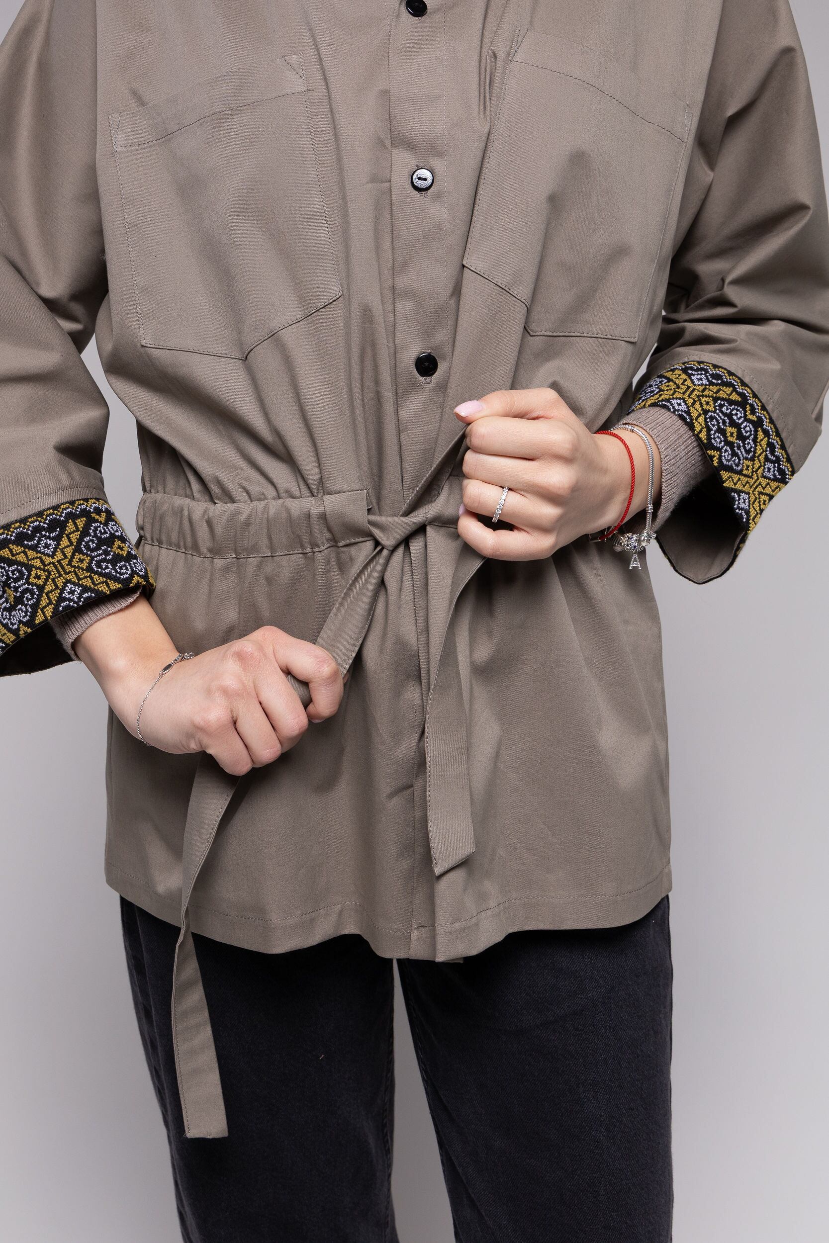 この作品は、ウクライナの伝統と美しさを象徴するヴィシヴァンカに用いられる手縫い刺繍を採用しています。過度な派手さを追求せず、日本の日常生活に自然に溶け込むデザインとなっております。しかし、それでいて洗練された高級感とカジュアルな雰囲気を両立させ、見る人を魅了する一着となっています。