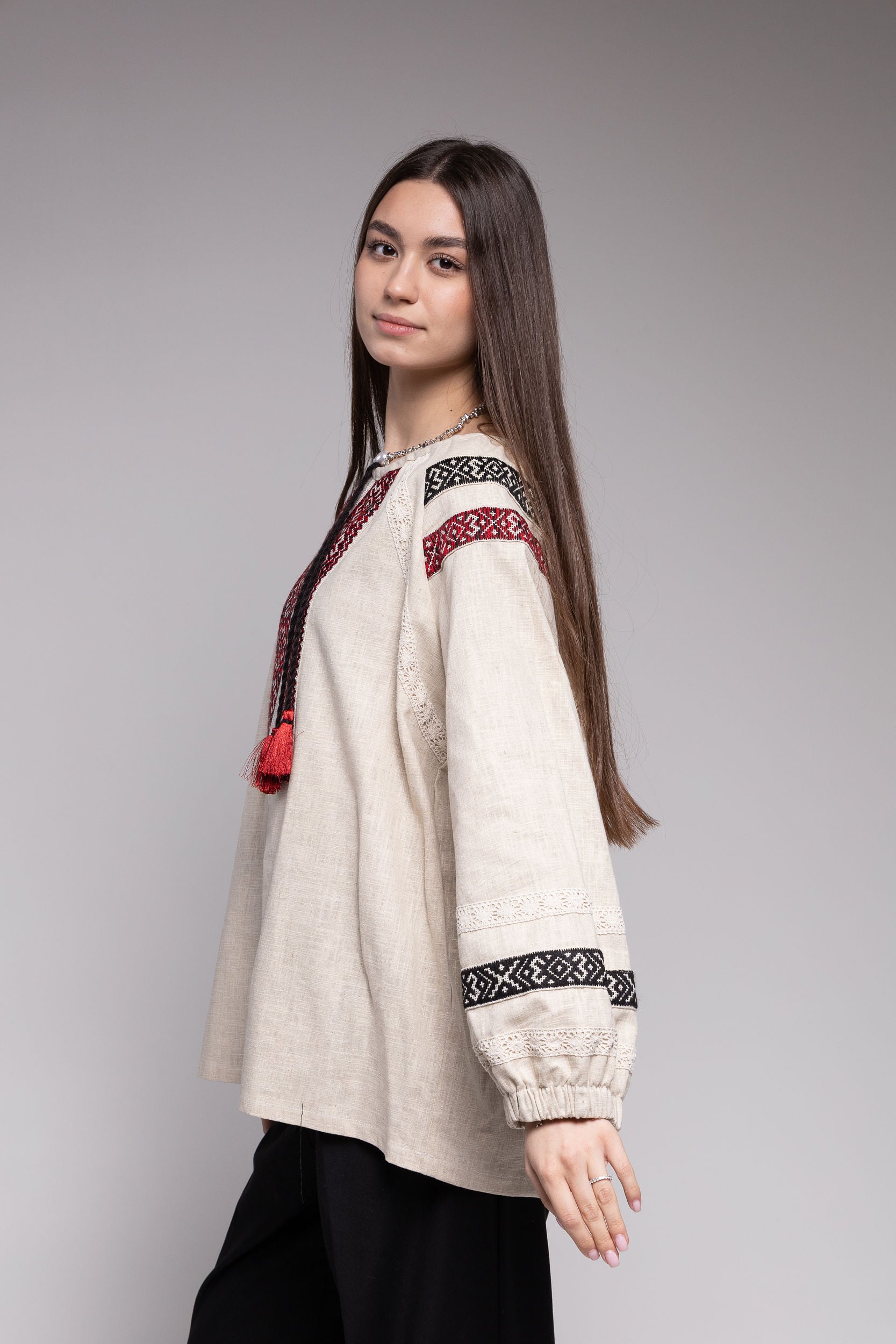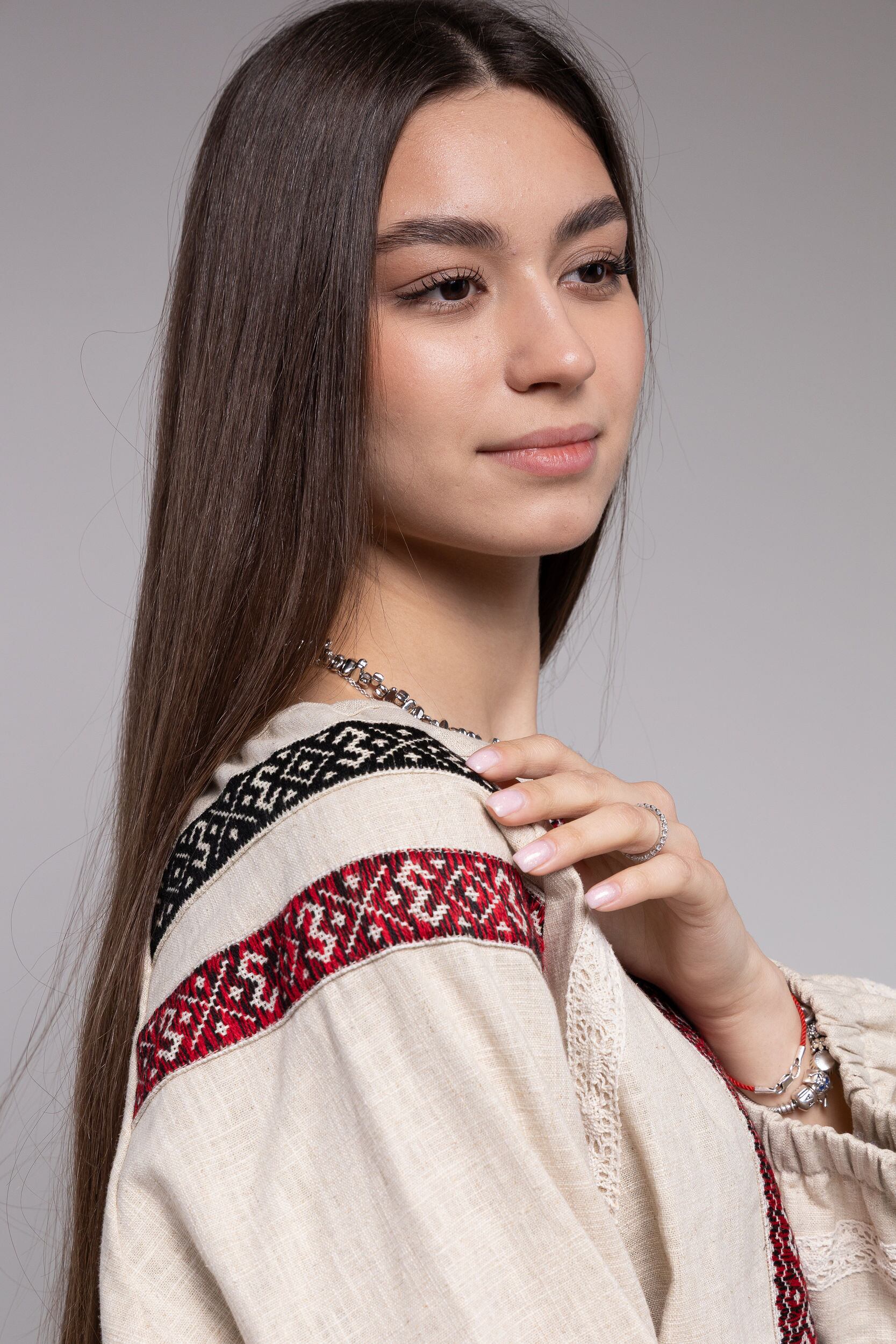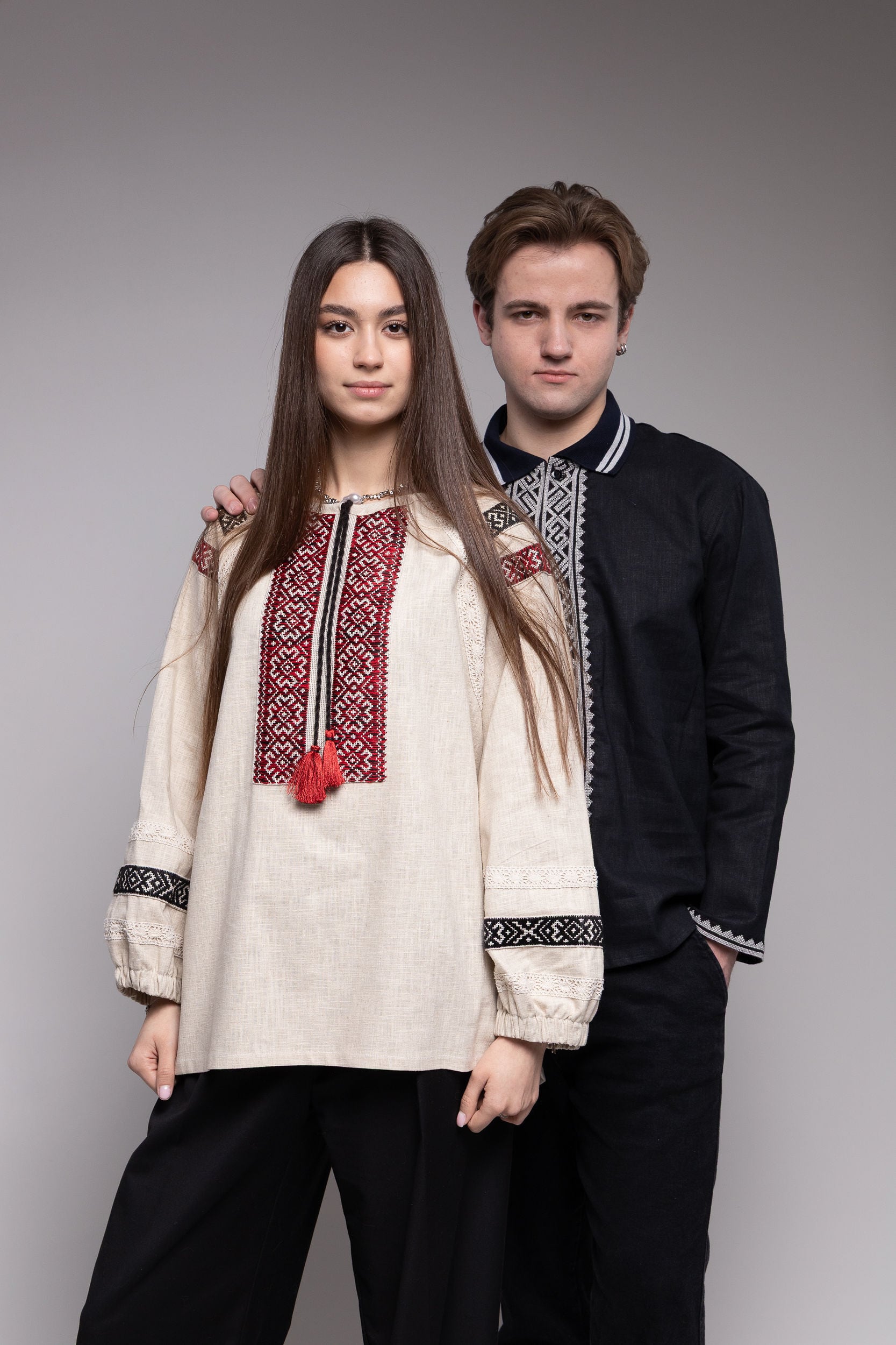 この作品は、ウクライナの伝統と美しさを象徴するヴィシヴァンカの刺繍を採用しています。過度な派手さを追求せず、日本の日常生活に自然に溶け込むデザインとなっております。しかし、それでいて洗練された高級感とカジュアルな雰囲気を両立させ、見る人を魅了する一着となっています。