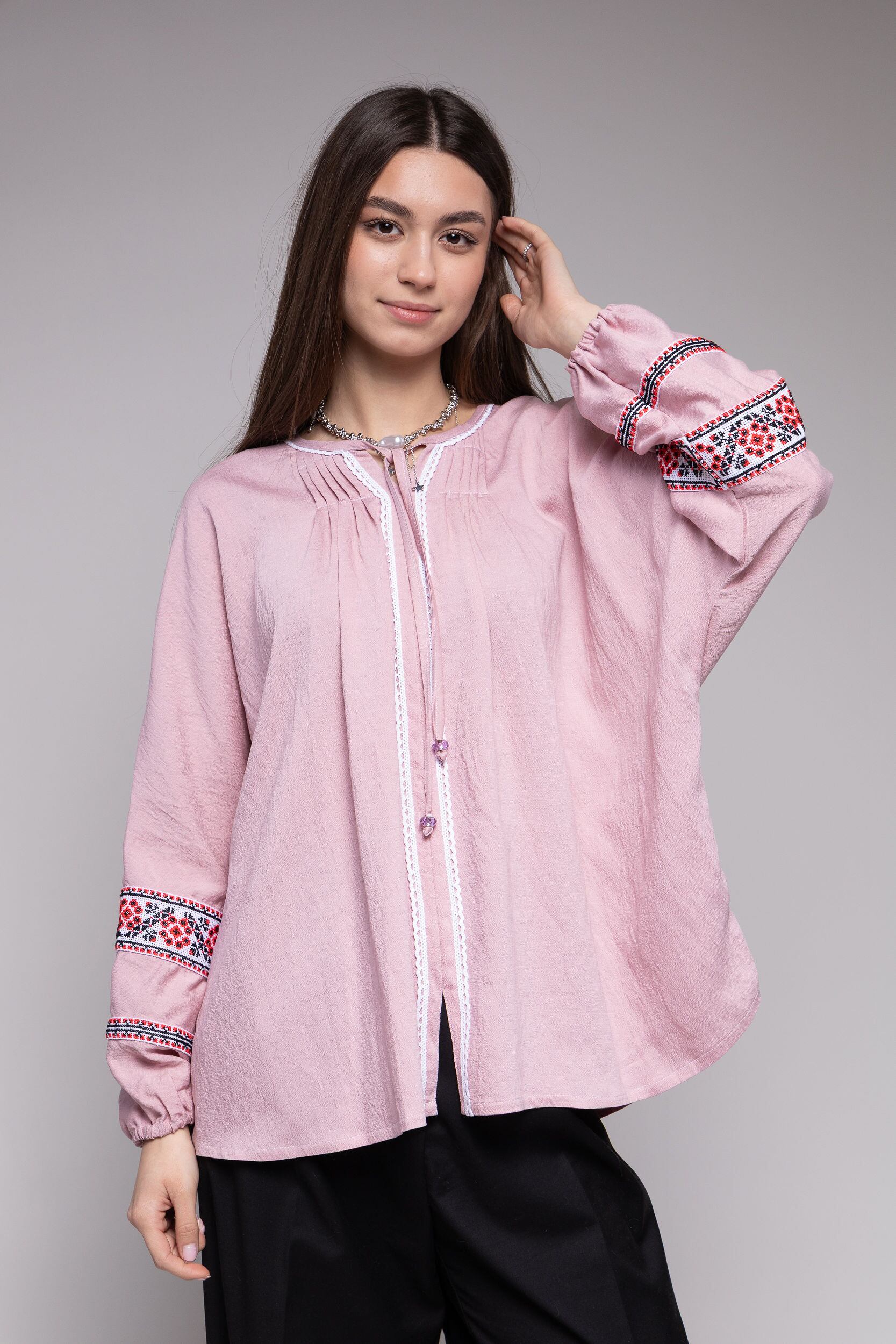 この作品は、ウクライナの伝統と美しさを象徴するヴィシヴァンカの刺繍を採用しています。過度な派手さを追求せず、日本の日常生活に自然に溶け込むデザインとなっております。しかし、それでいて洗練された高級感とカジュアルな雰囲気を両立させ、見る人を魅了する一着となっています。