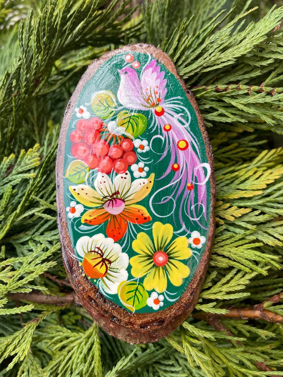 ウクライナ伝統絵画 ペトリキウカ塗り 木製ブローチ(ホメンコ作)