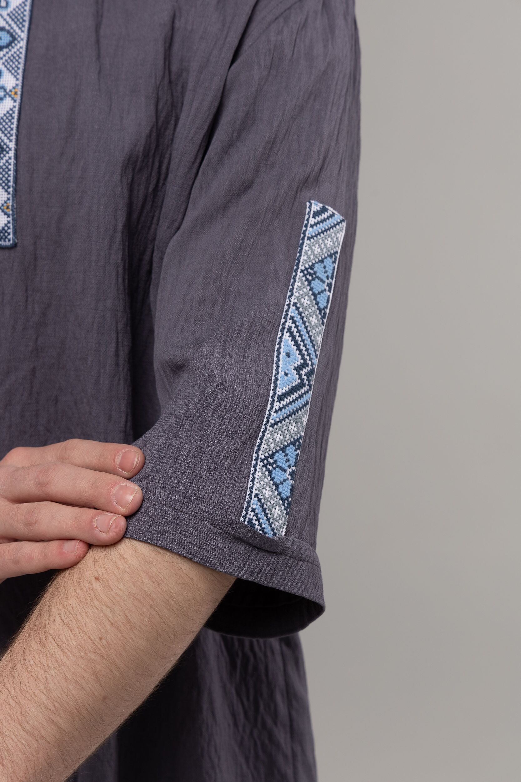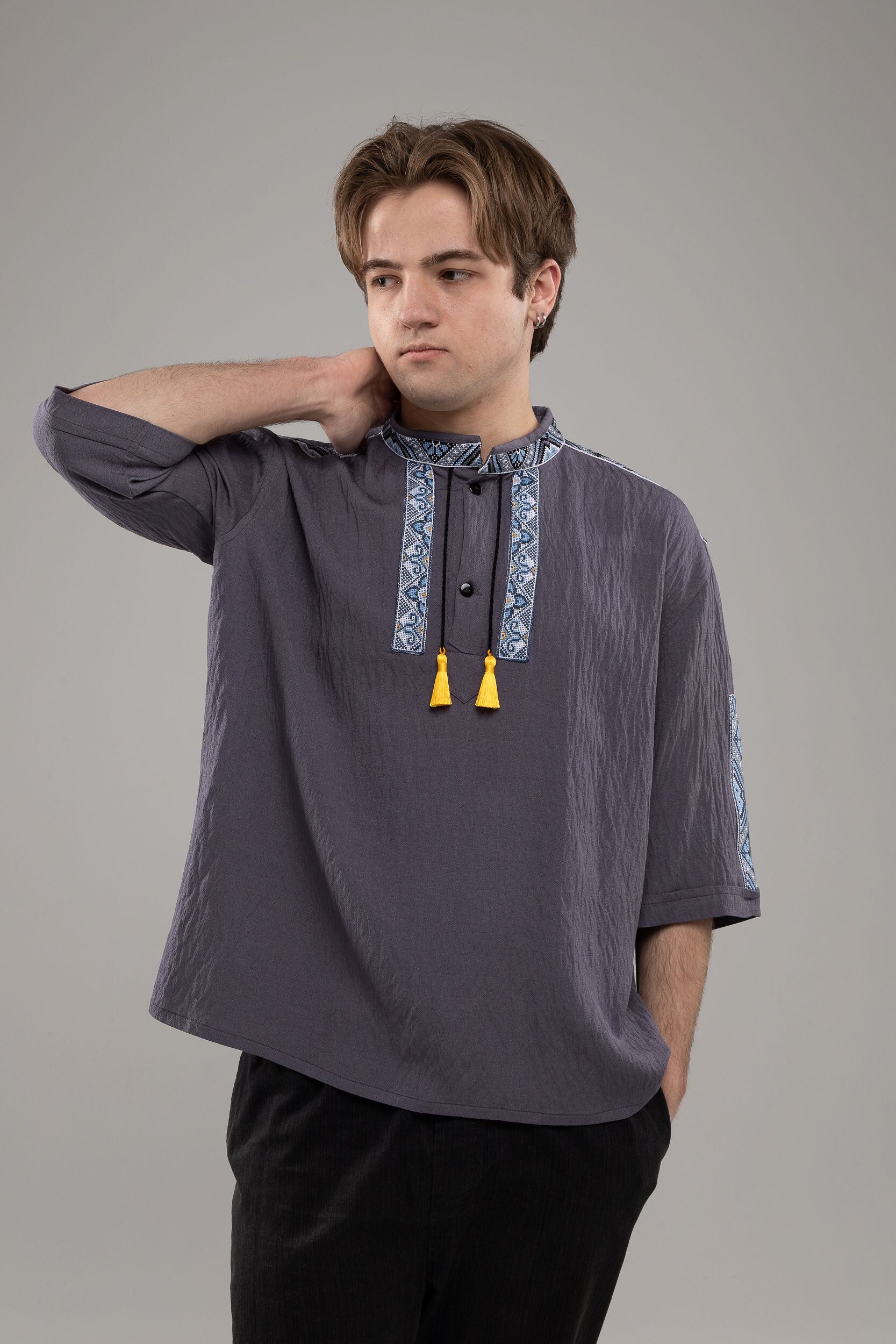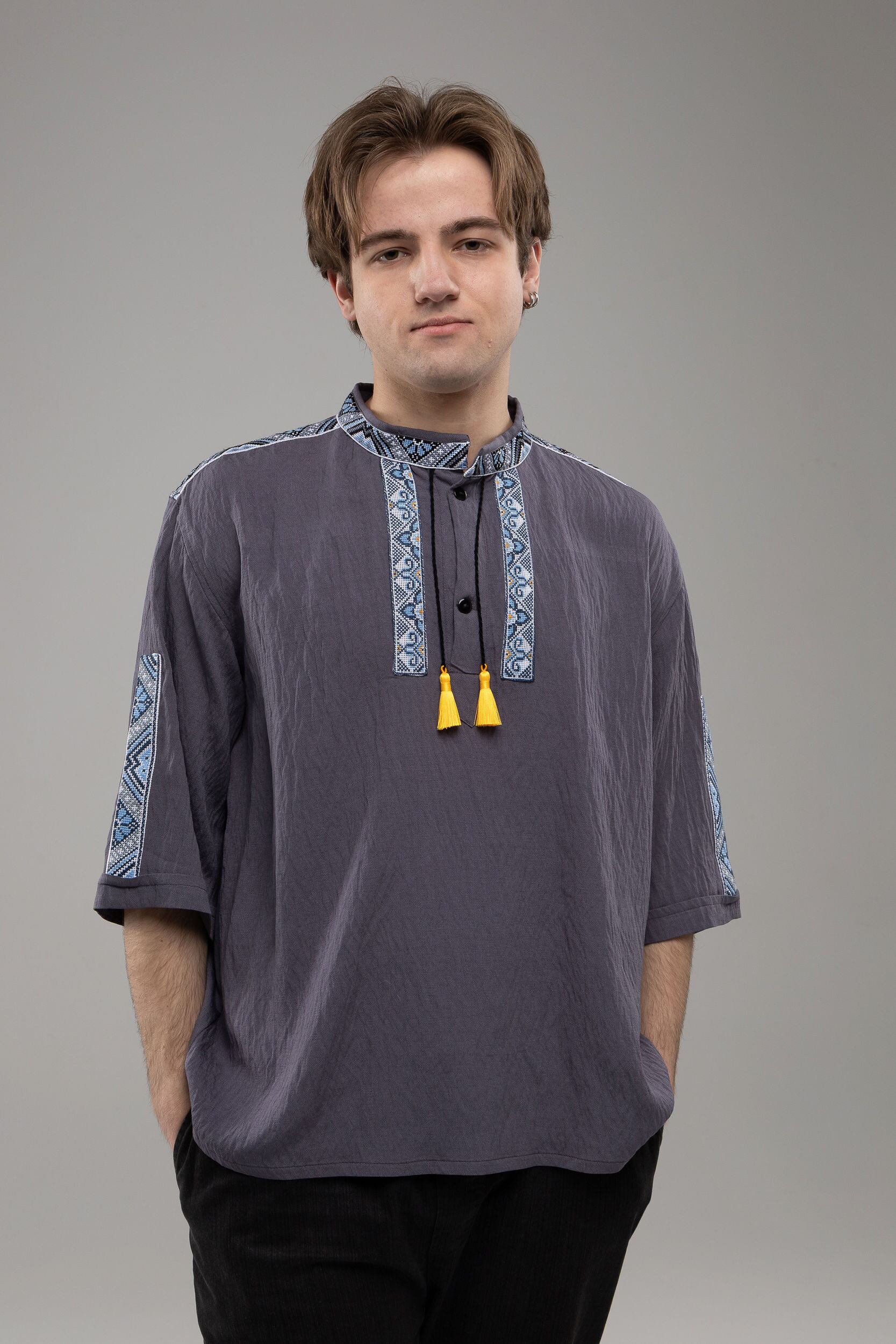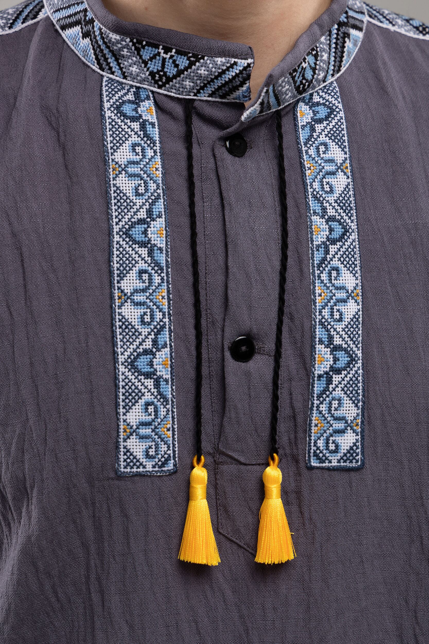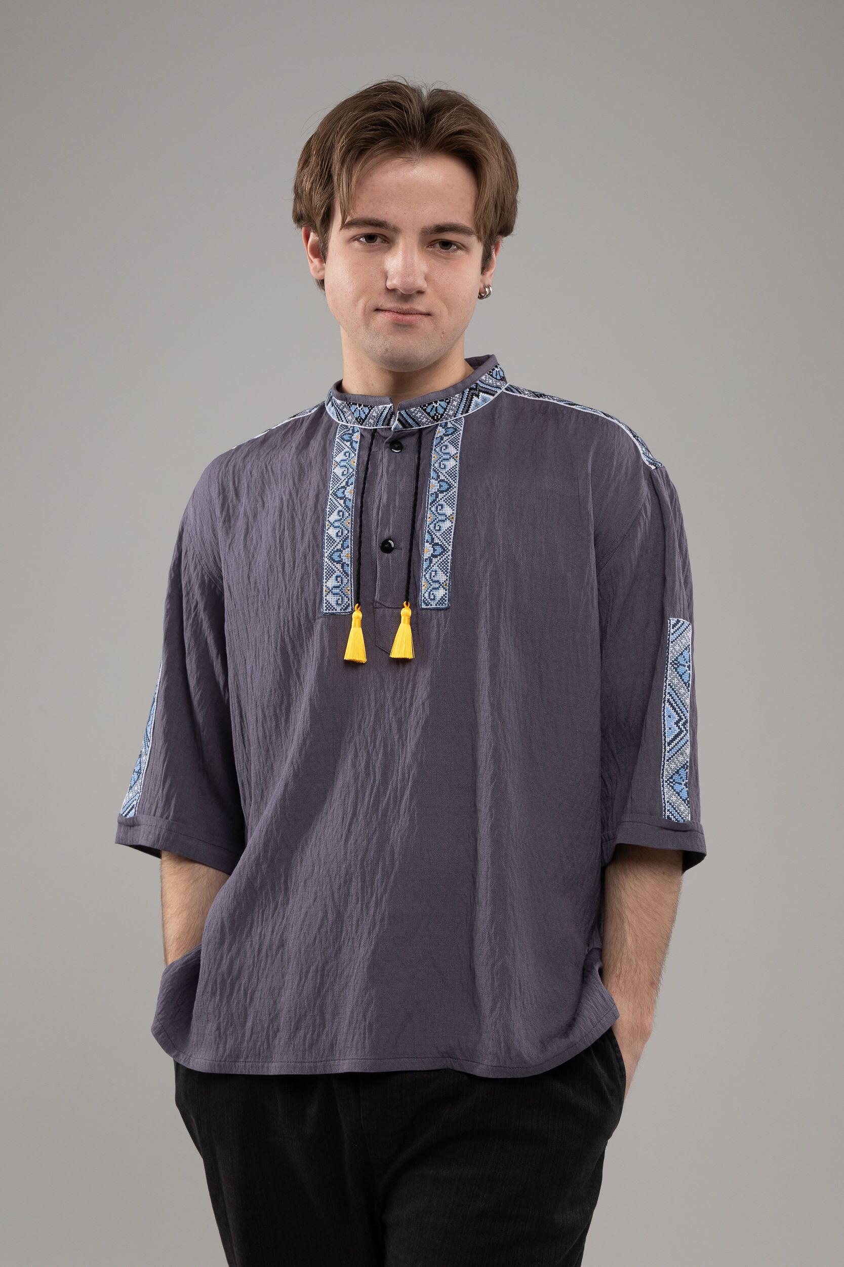 この作品は、ウクライナの伝統と美しさを象徴するヴィシヴァンカに用いられる手縫い刺繍を採用しています。過度な派手さを追求せず、日本の日常生活に自然に溶け込むデザインとなっております。しかし、それでいて洗練された高級感とカジュアルな雰囲気を両立させ、見る人を魅了する一着となっています。