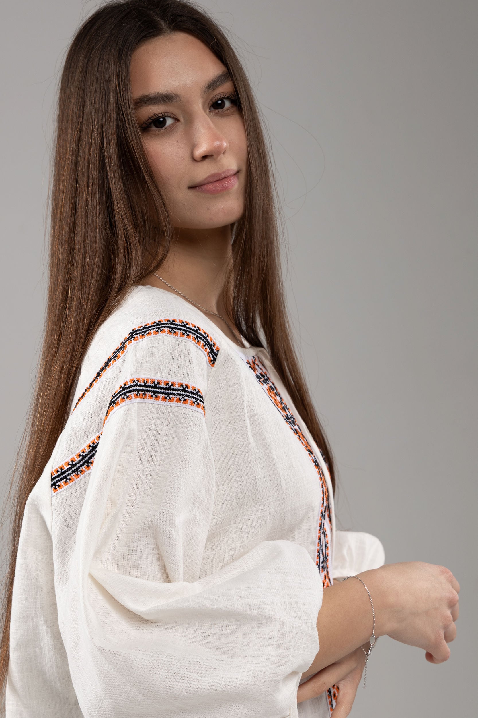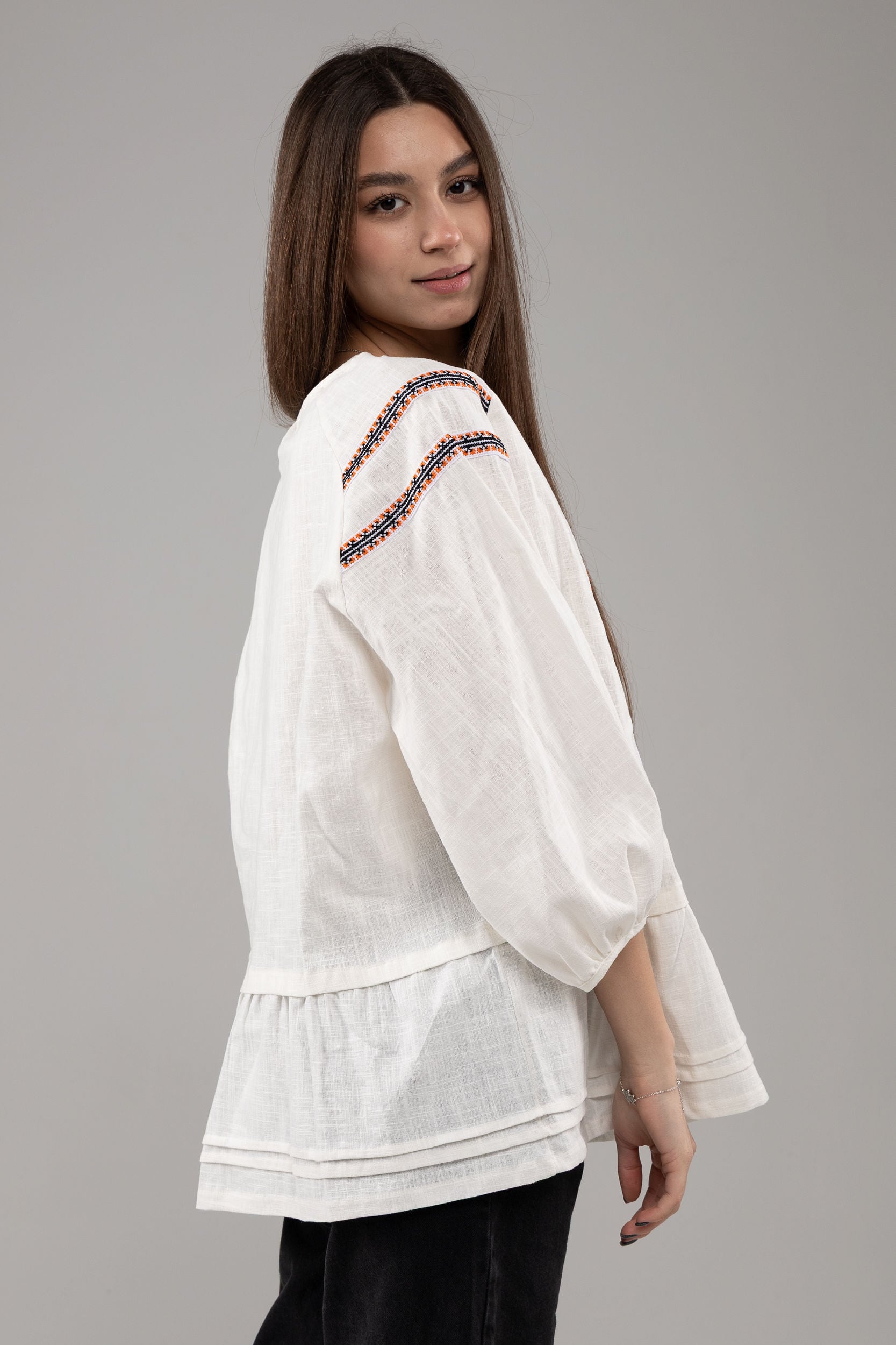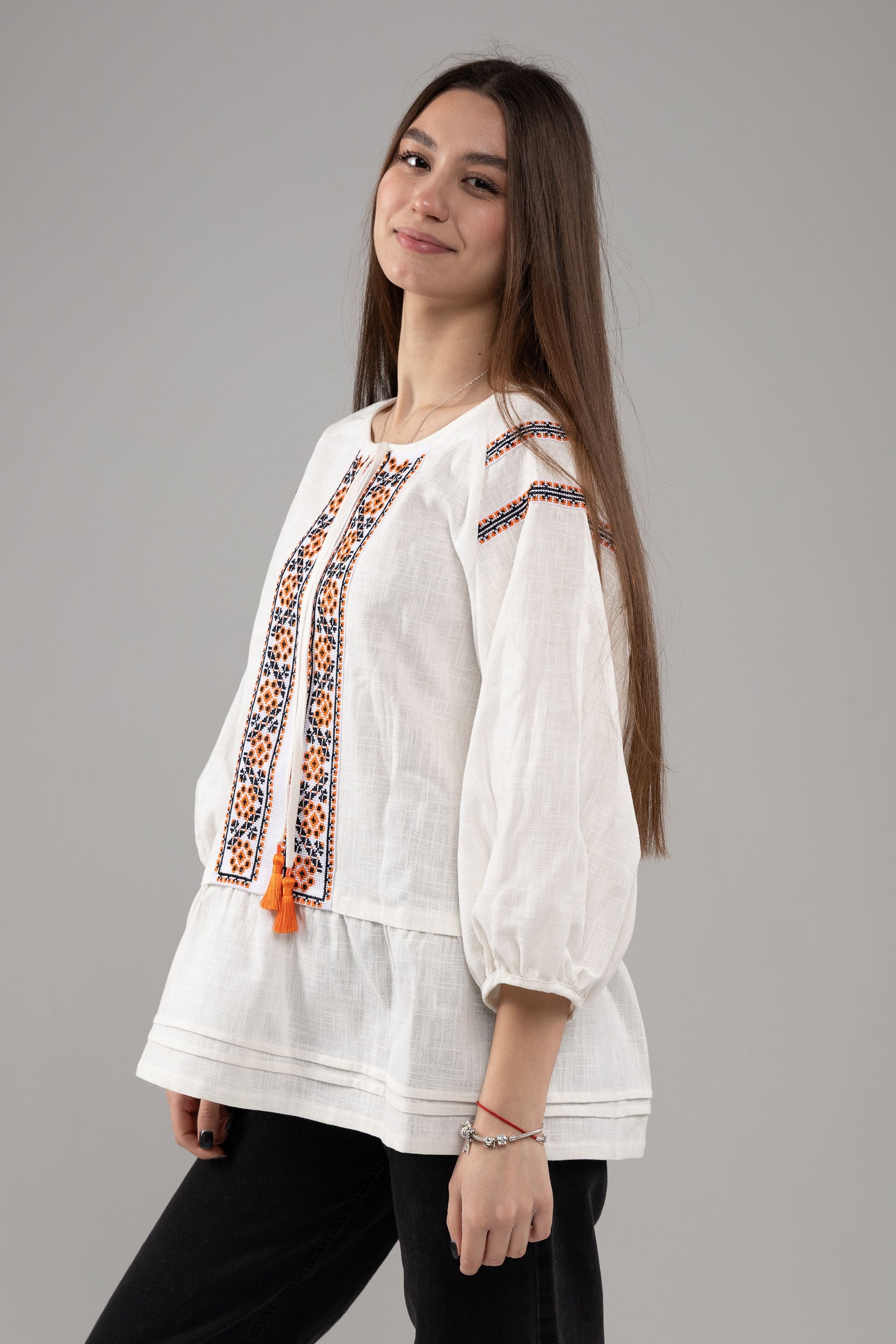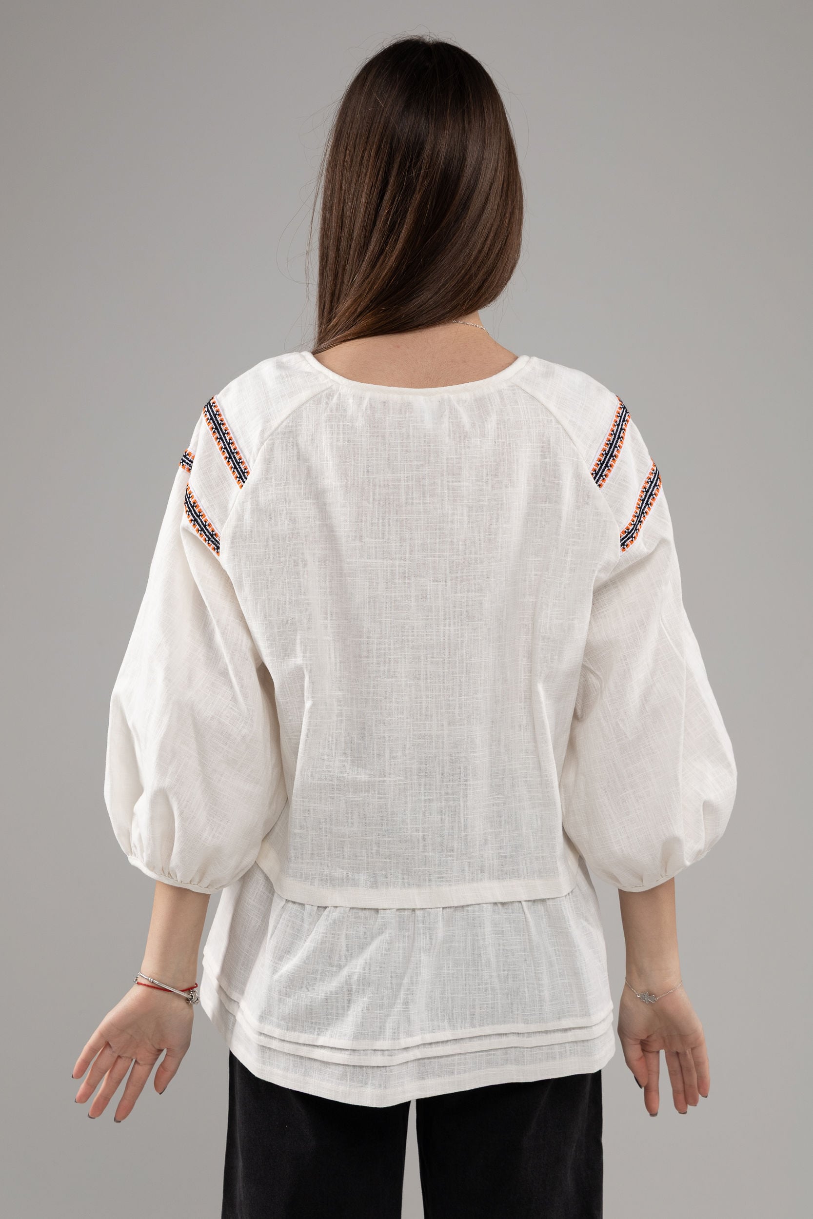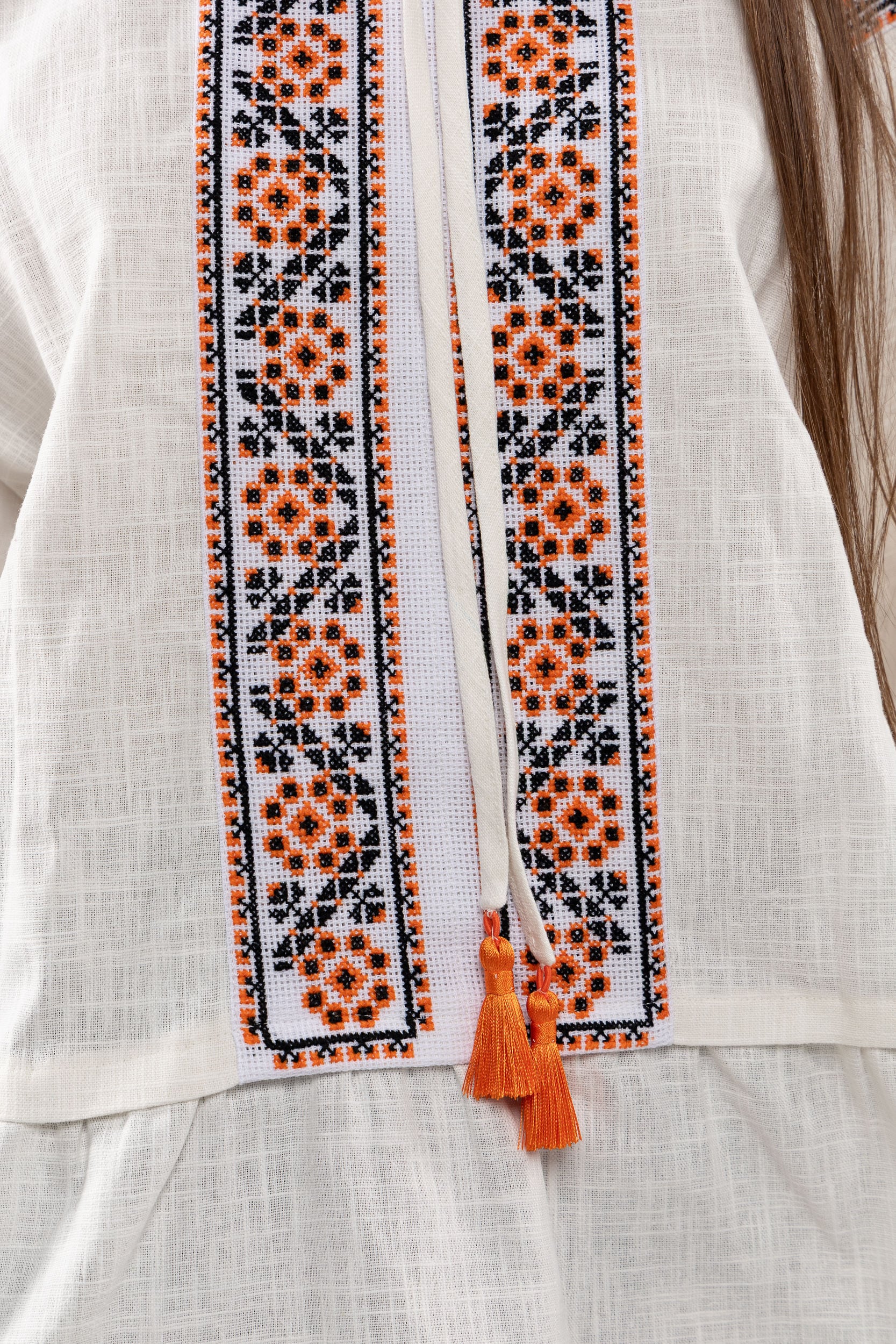 この作品は、ウクライナの伝統と美しさを象徴するヴィシヴァンカの刺繍を採用しています。過度な派手さを追求せず、日本の日常生活に自然に溶け込むデザインとなっております。しかし、それでいて洗練された高級感とカジュアルな雰囲気を両立させ、見る人を魅了する一着となっています。