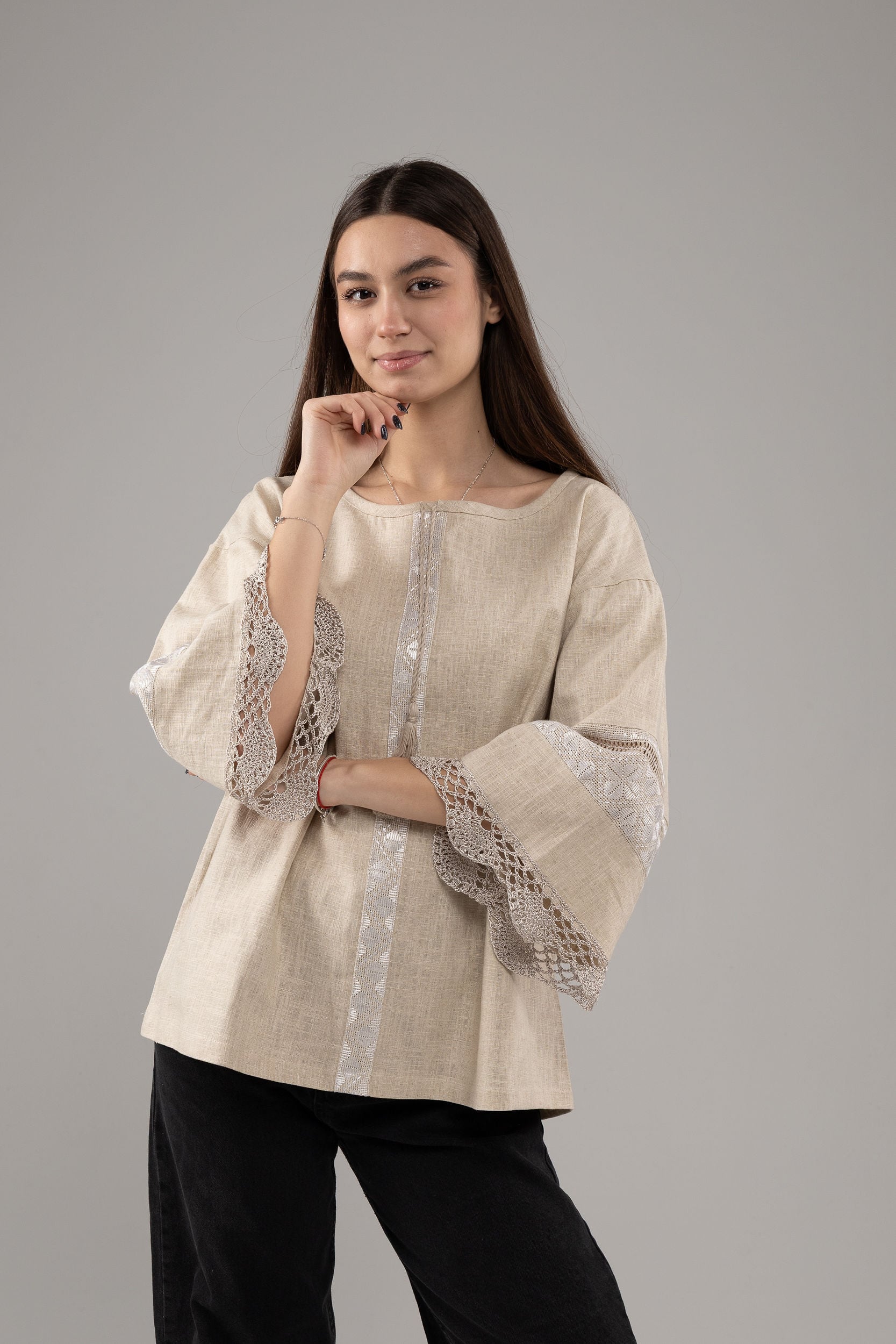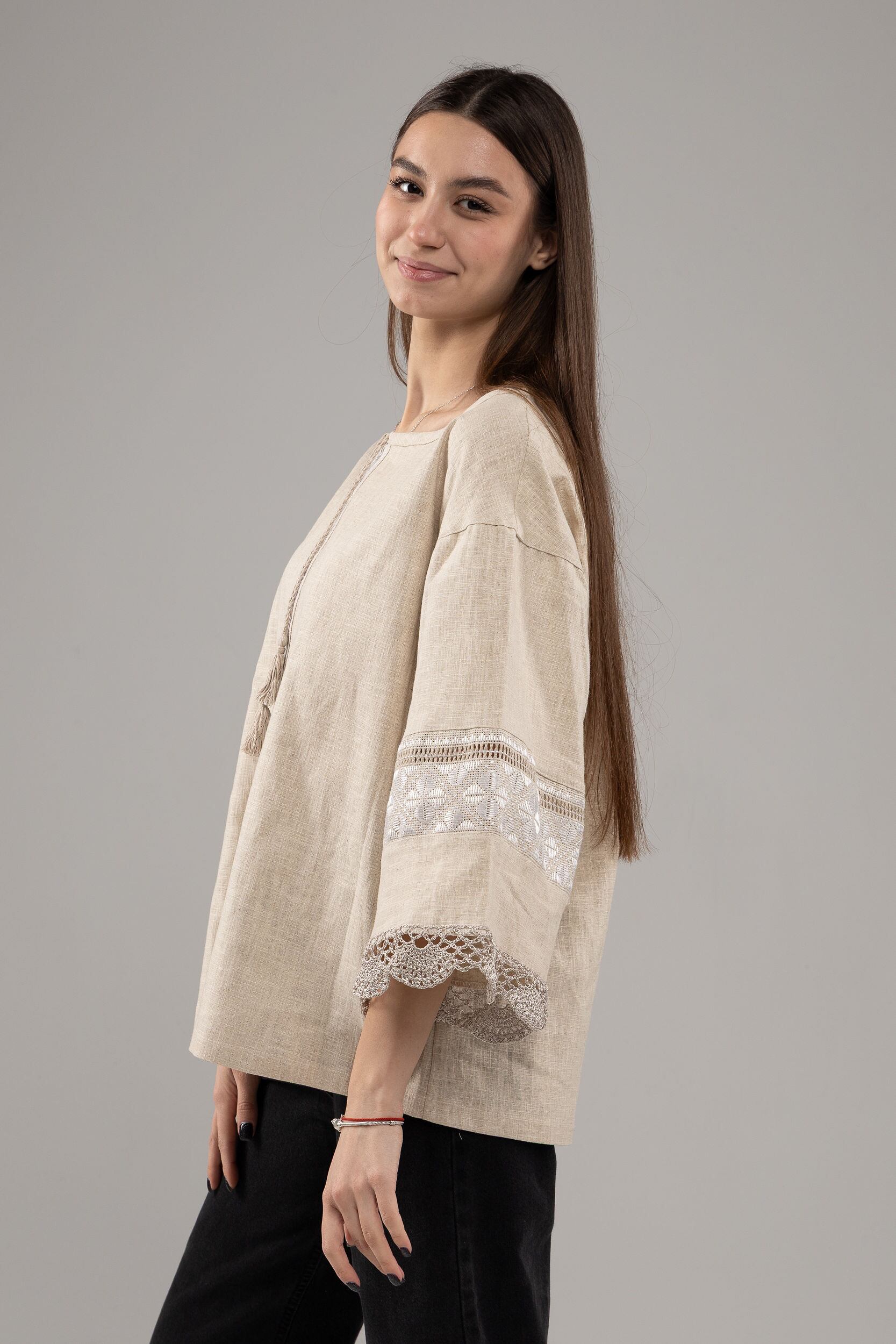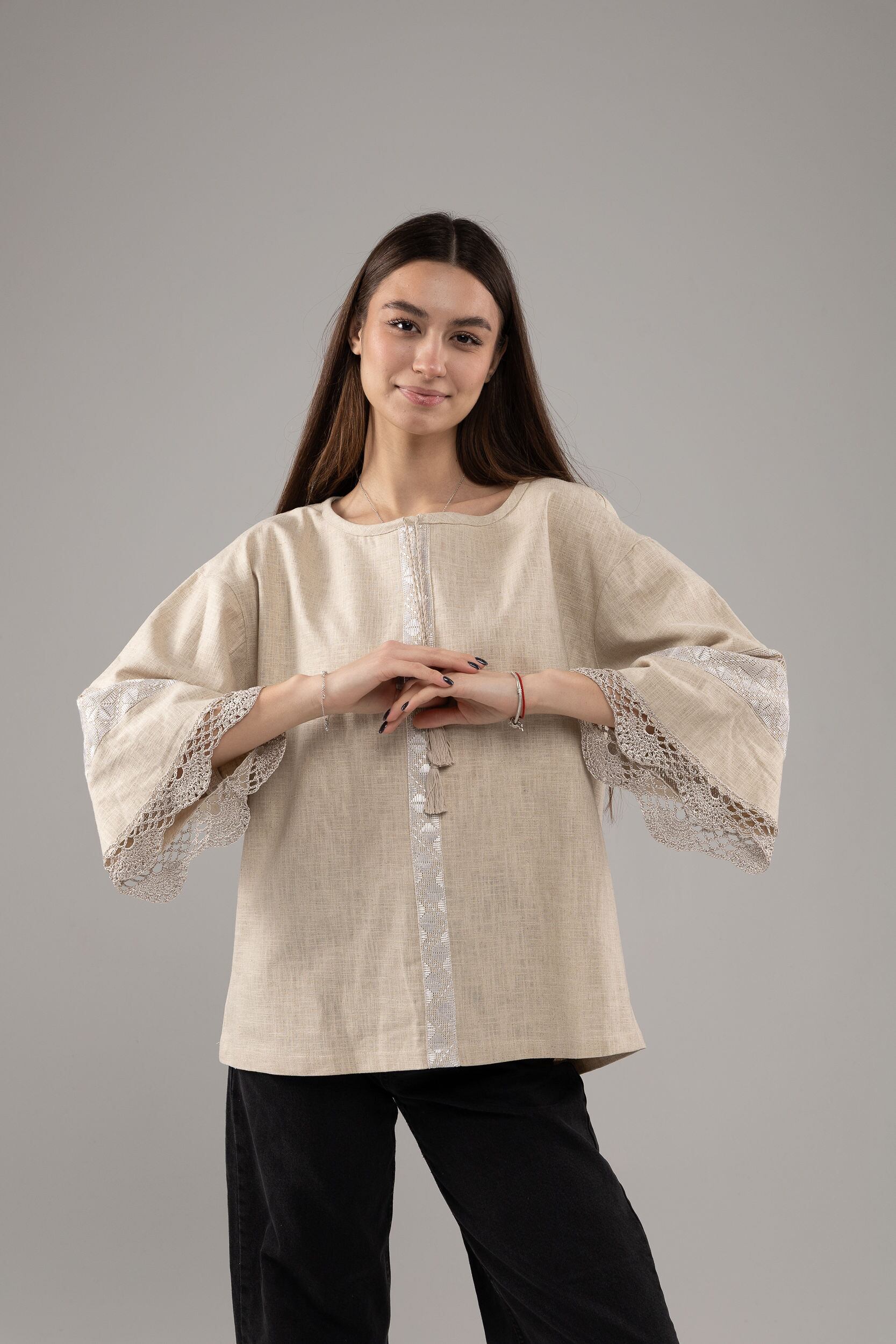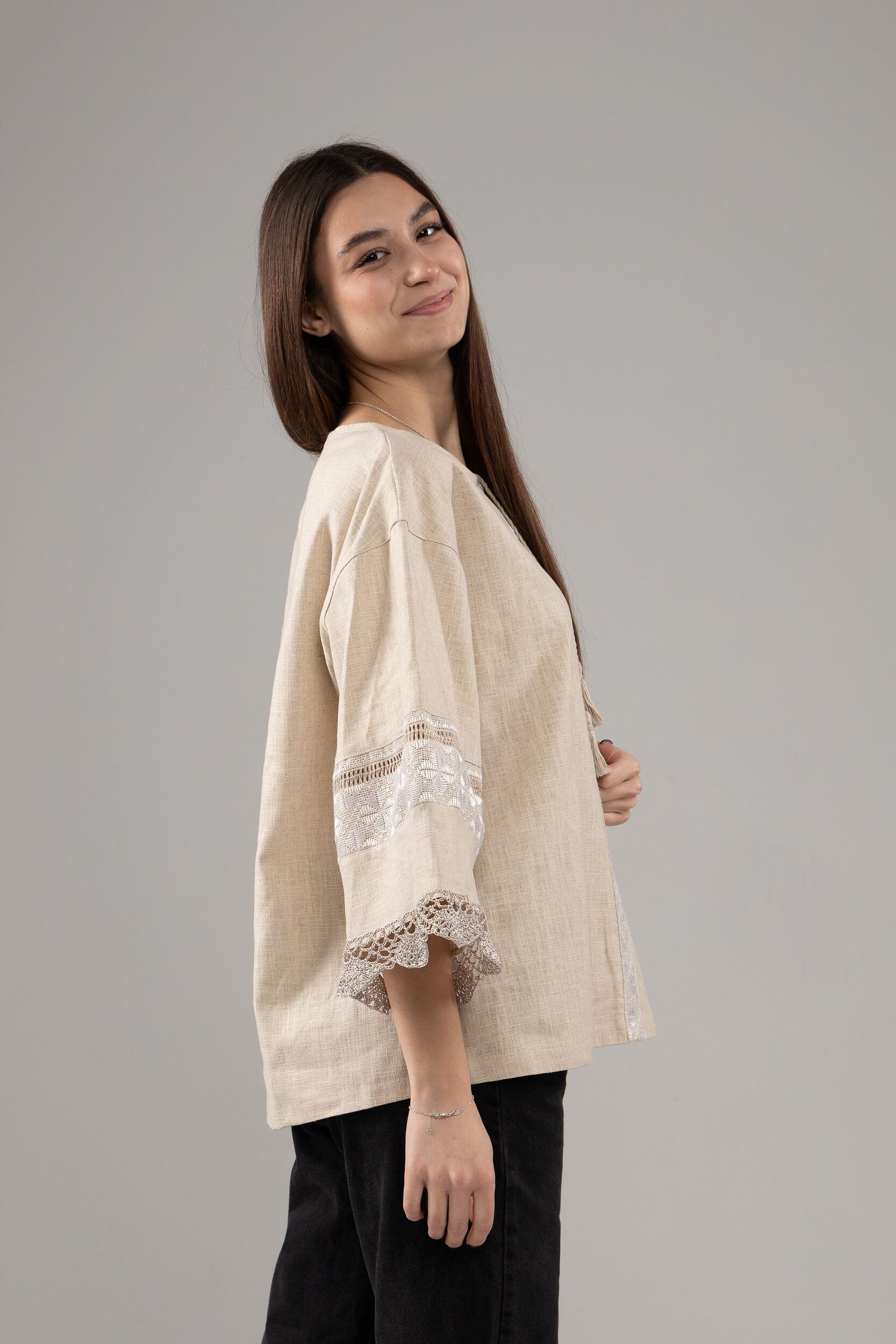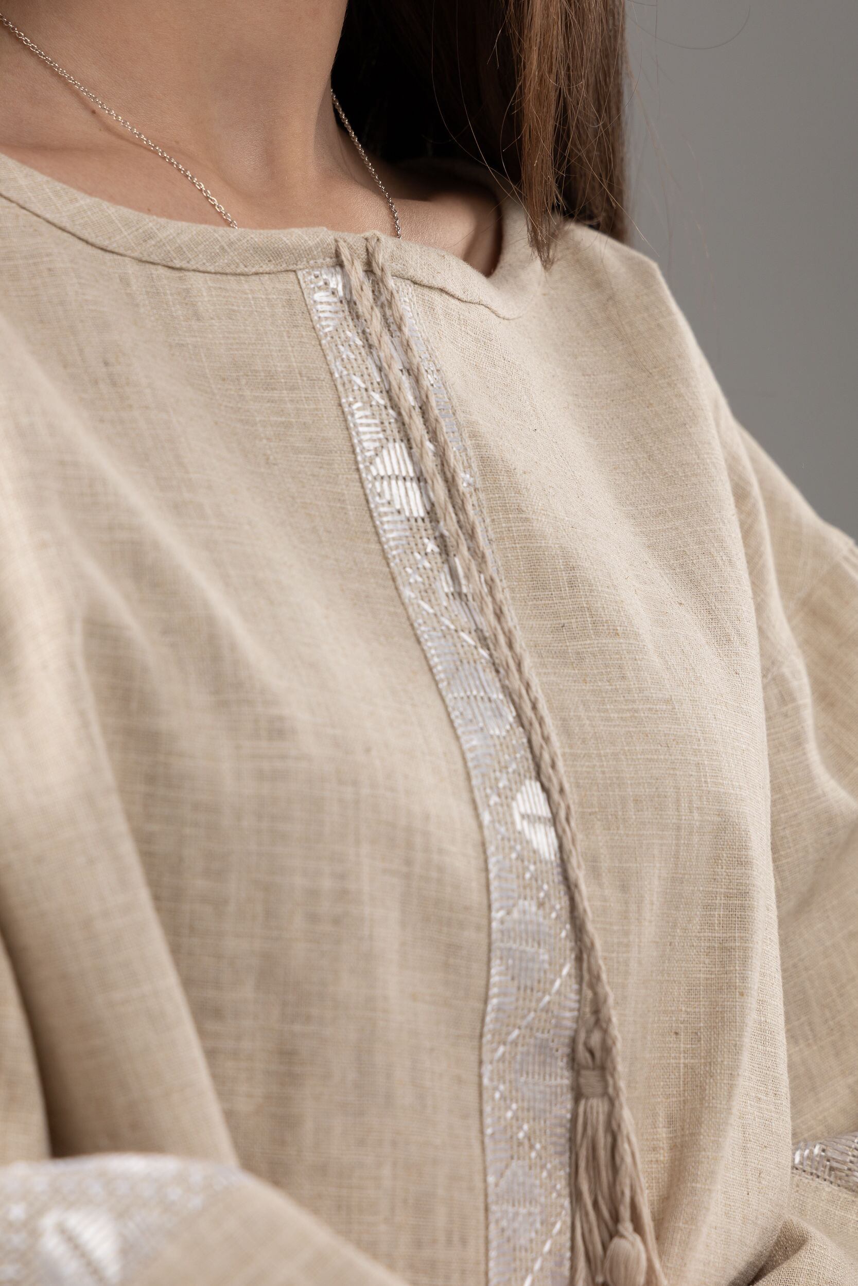 この作品は、ウクライナの伝統と美しさを象徴するヴィシヴァンカの刺繍を採用しています。過度な派手さを追求せず、日本の日常生活に自然に溶け込むデザインとなっております。しかし、それでいて洗練された高級感とカジュアルな雰囲気を両立させ、見る人を魅了する一着となっています。