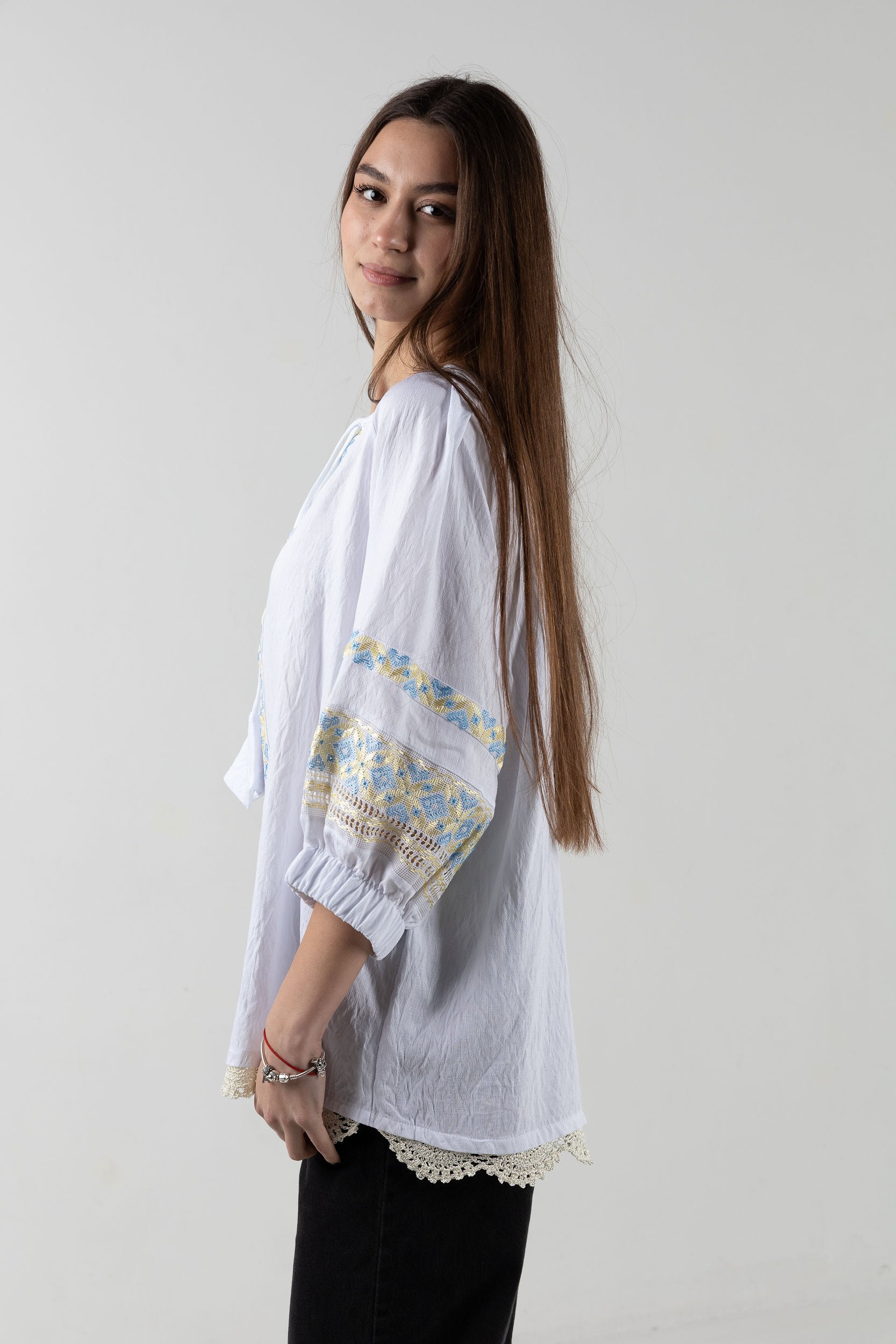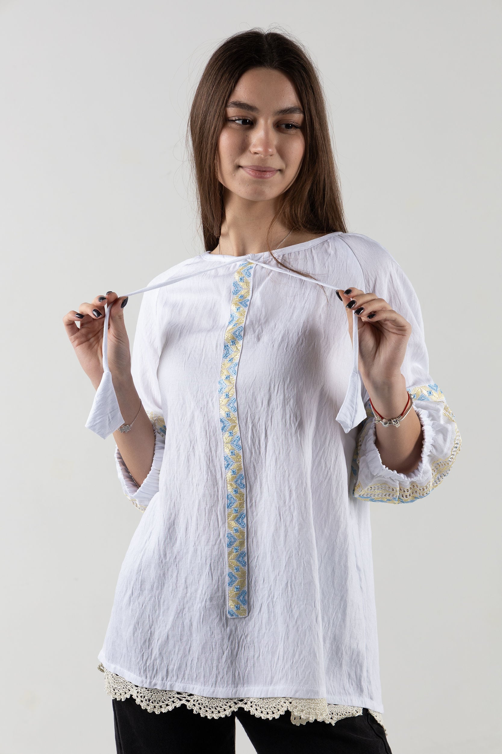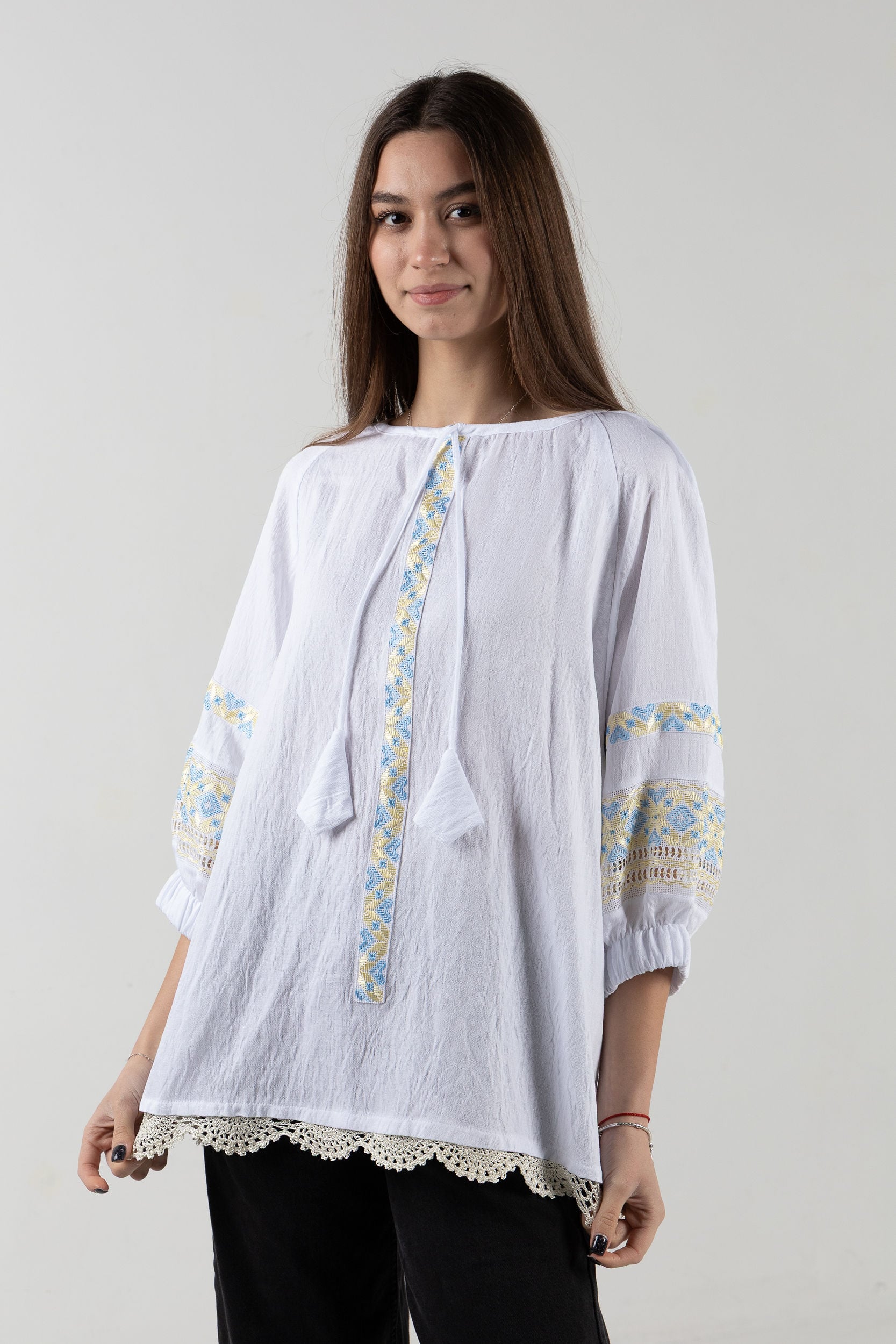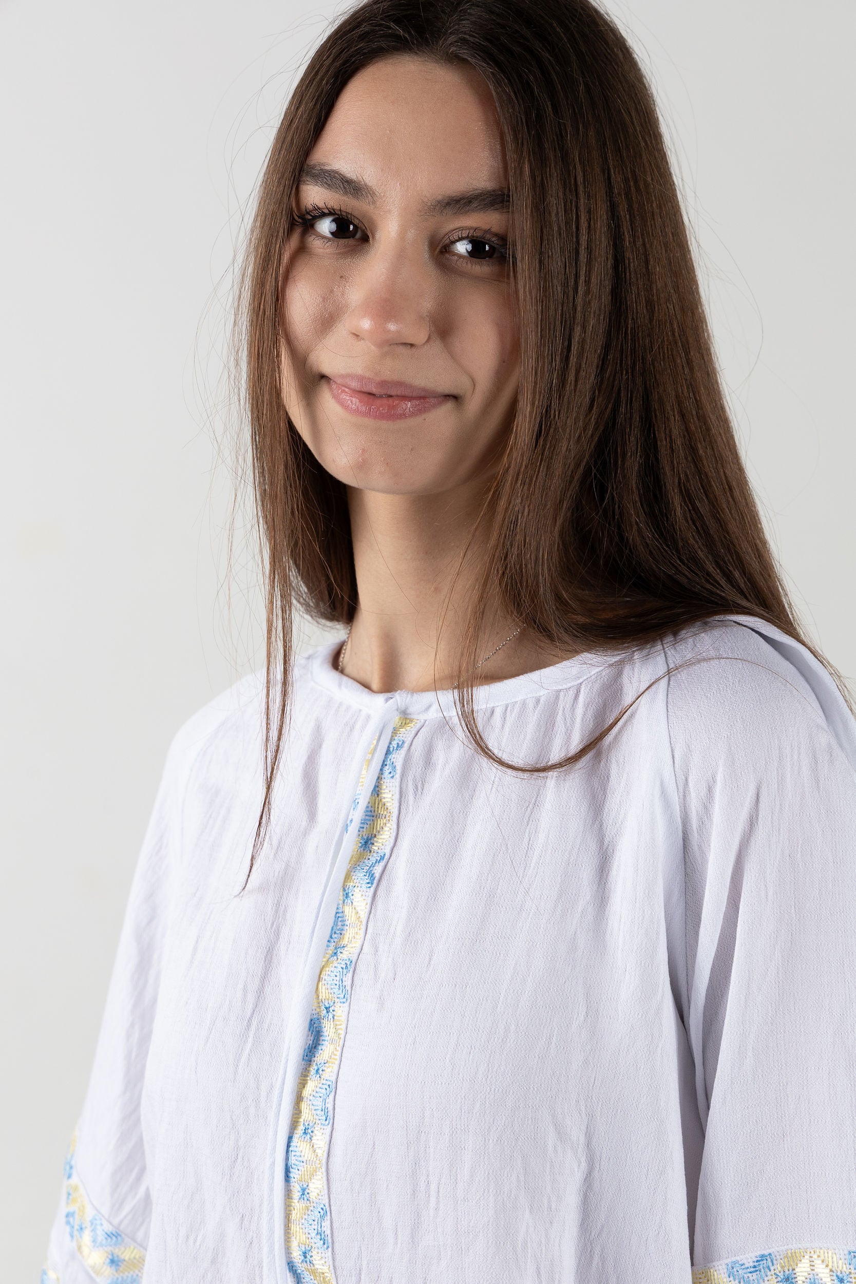 この作品は、ウクライナの伝統と美しさを象徴するヴィシヴァンカの刺繍を採用しています。過度な派手さを追求せず、日本の日常生活に自然に溶け込むデザインとなっております。しかし、それでいて洗練された高級感とカジュアルな雰囲気を両立させ、見る人を魅了する一着となっています。