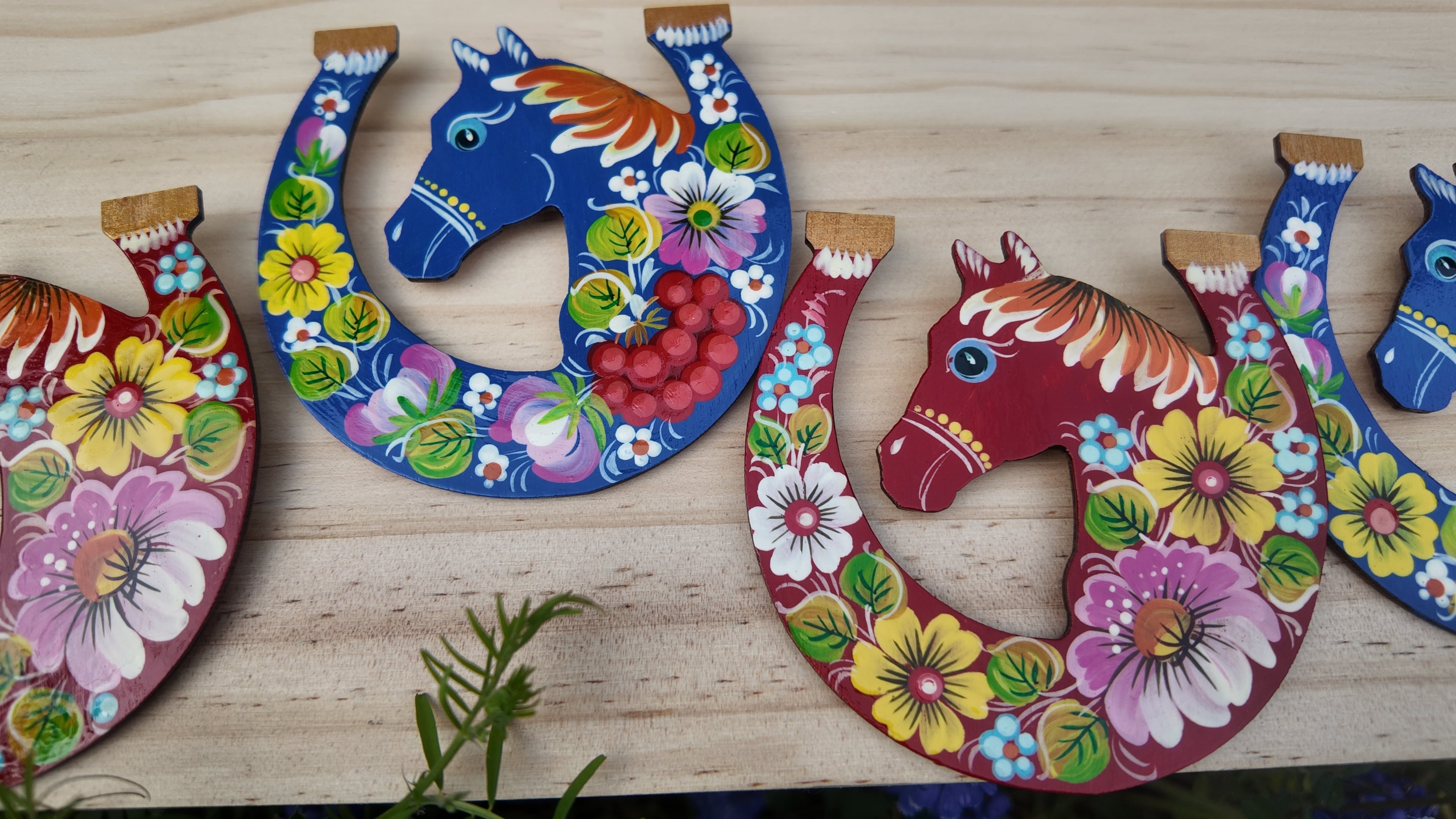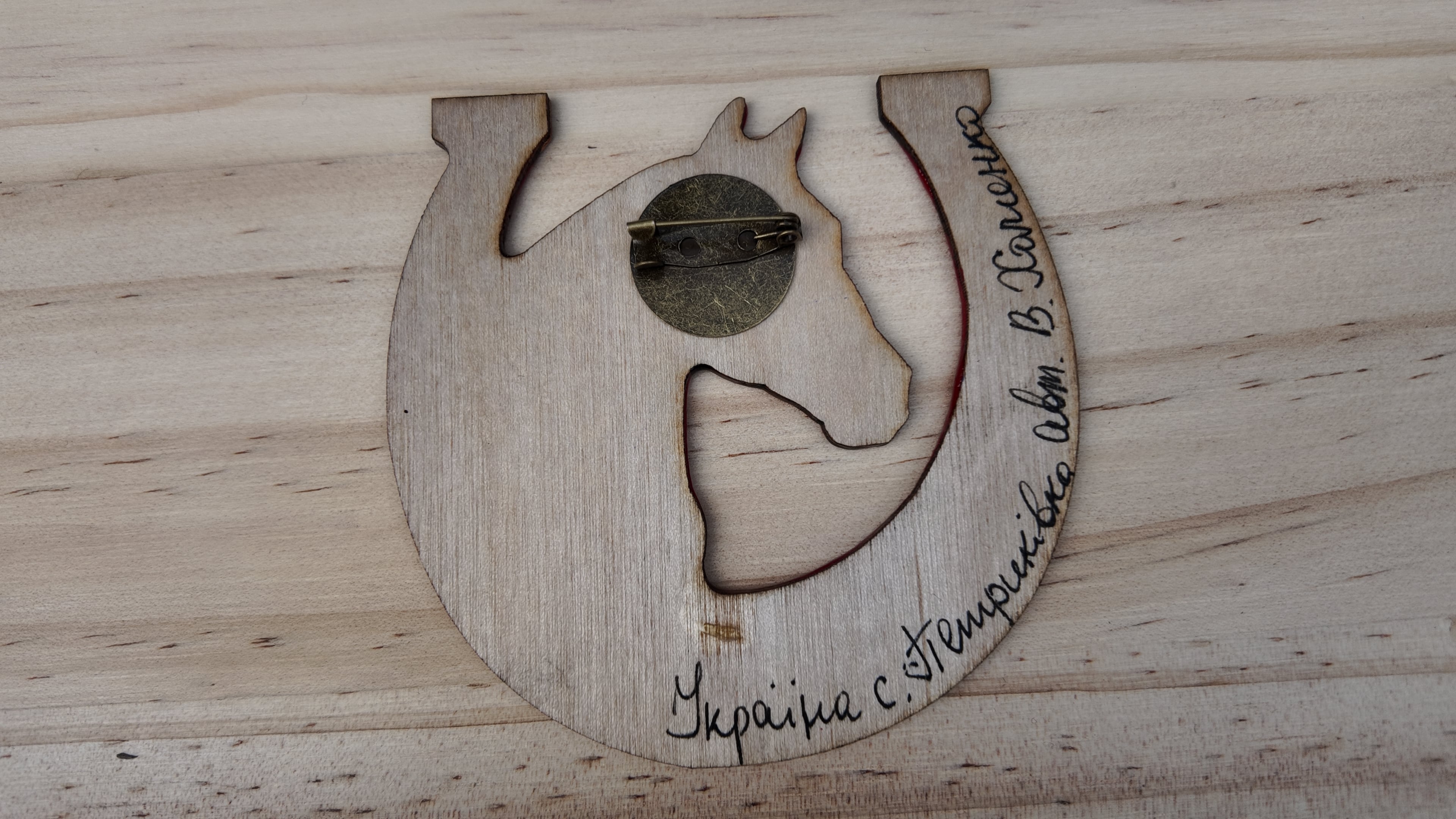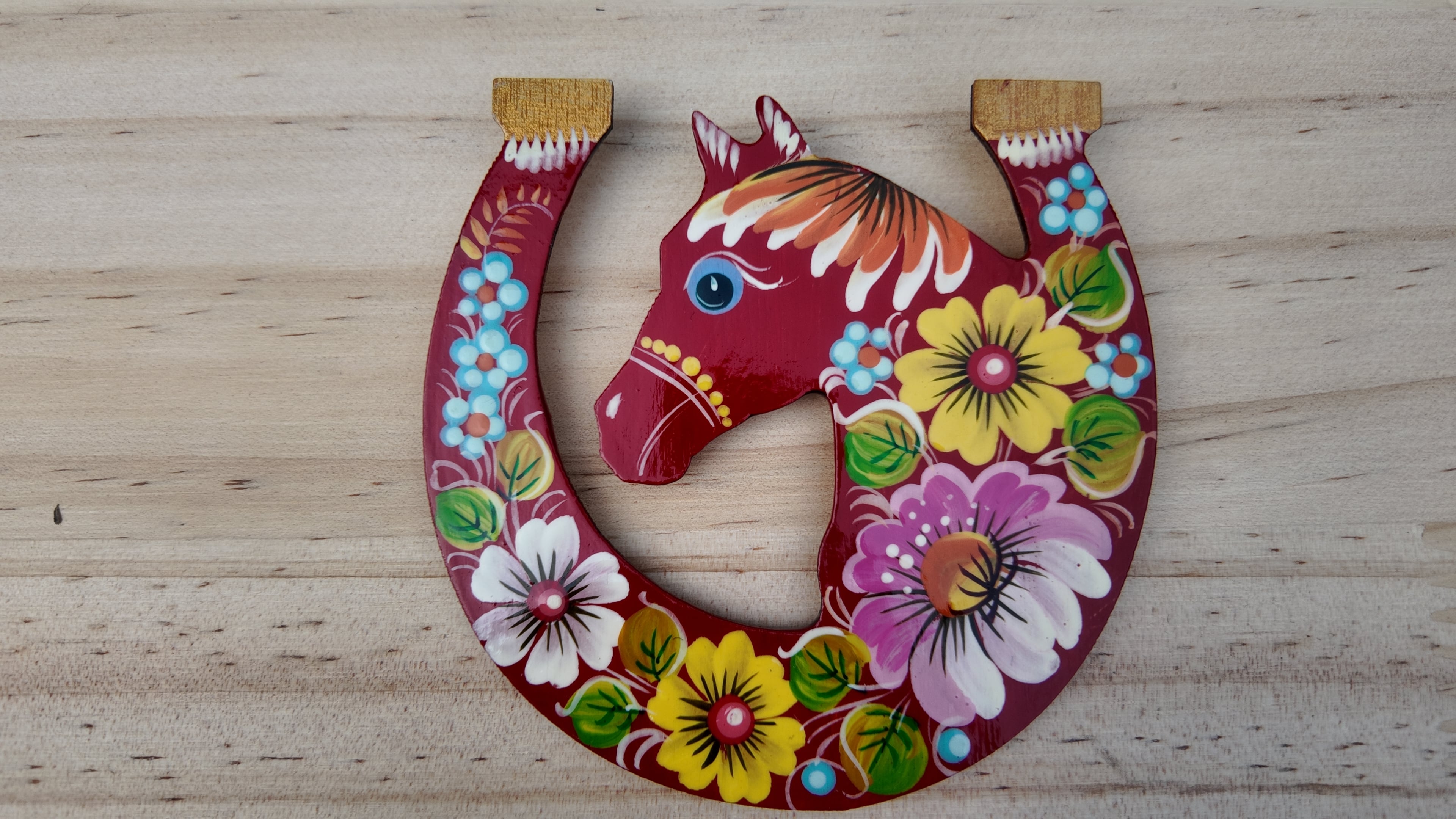 ウクライナ伝統絵画 ペトリキウカ塗り 木製ブローチ(ホメンコ作)馬 ホース