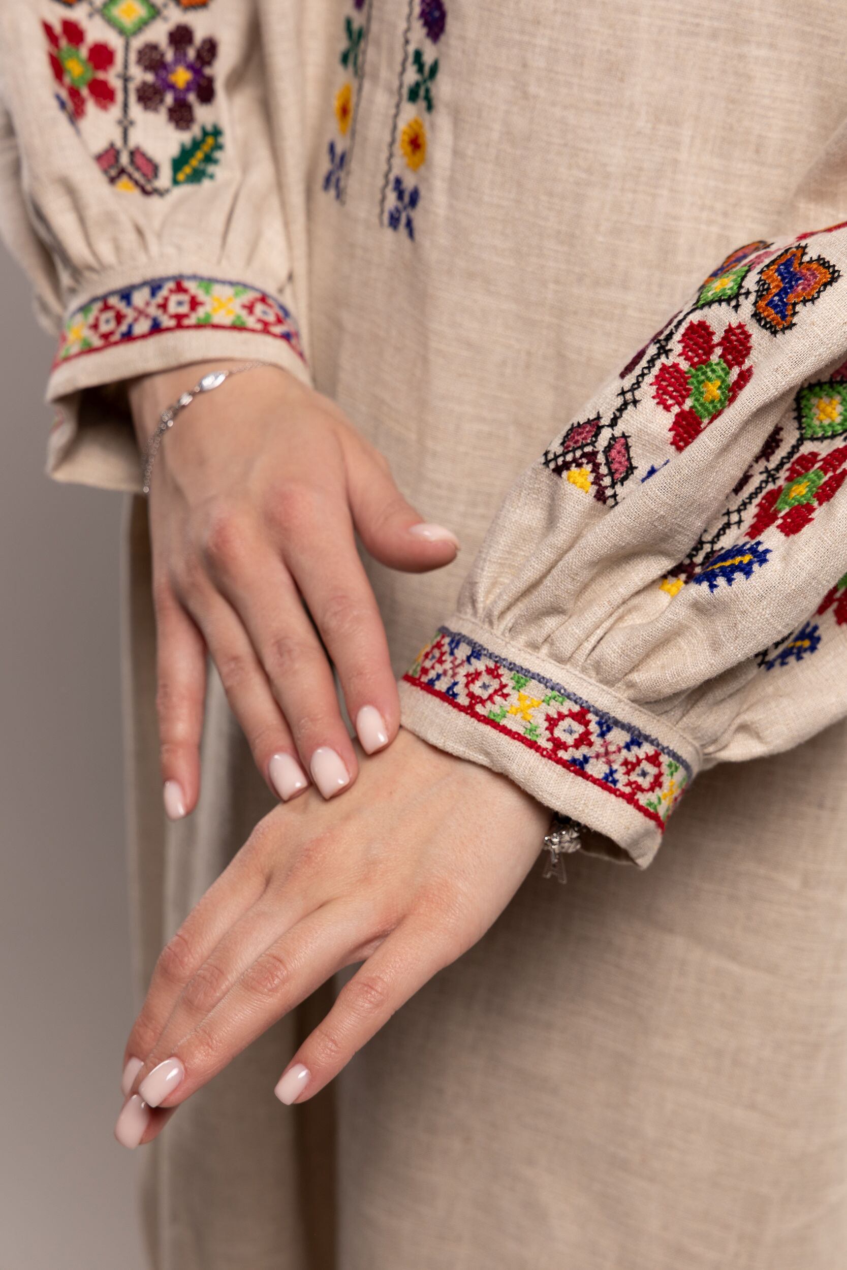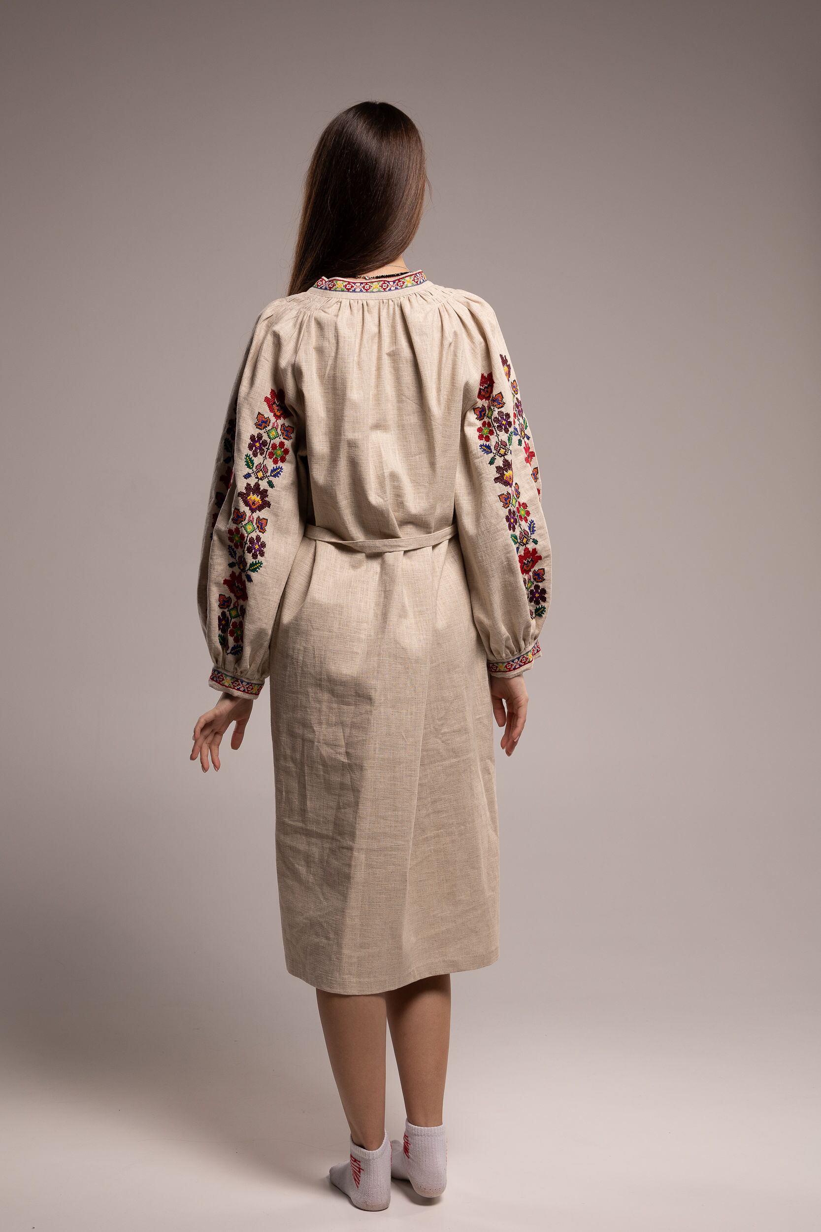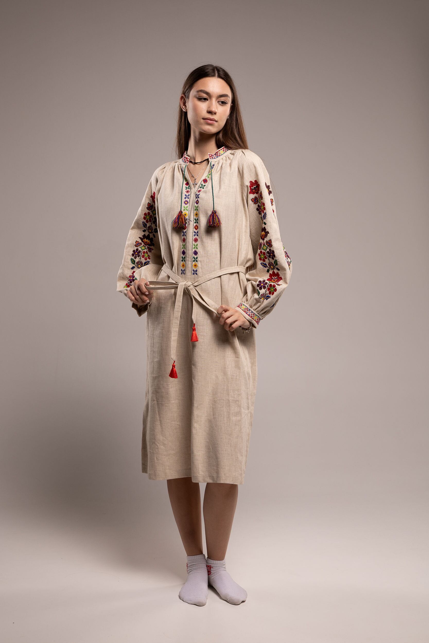 このドレスは、ウクライナの伝統と美しさを象徴するヴィシヴァンカの刺繍を採用しています。過度な派手さを追求せず、日本の日常生活に自然に溶け込むデザインとなっております。しかし、それでいて洗練された高級感とカジュアルな雰囲気を両立させ、見る人を魅了する一着となっています。熟練した刺繍職人が、数ヶ月以上かけ直接手縫いで衣装に縫い付けております。