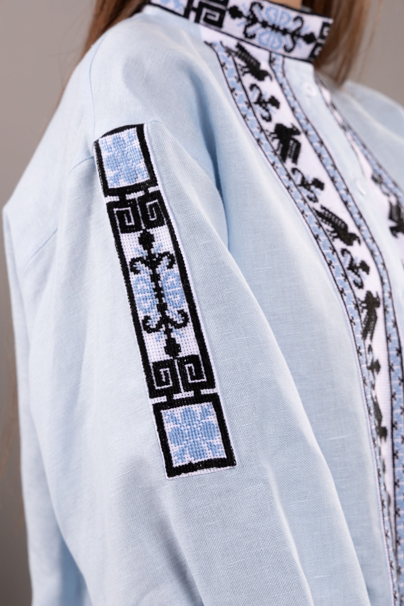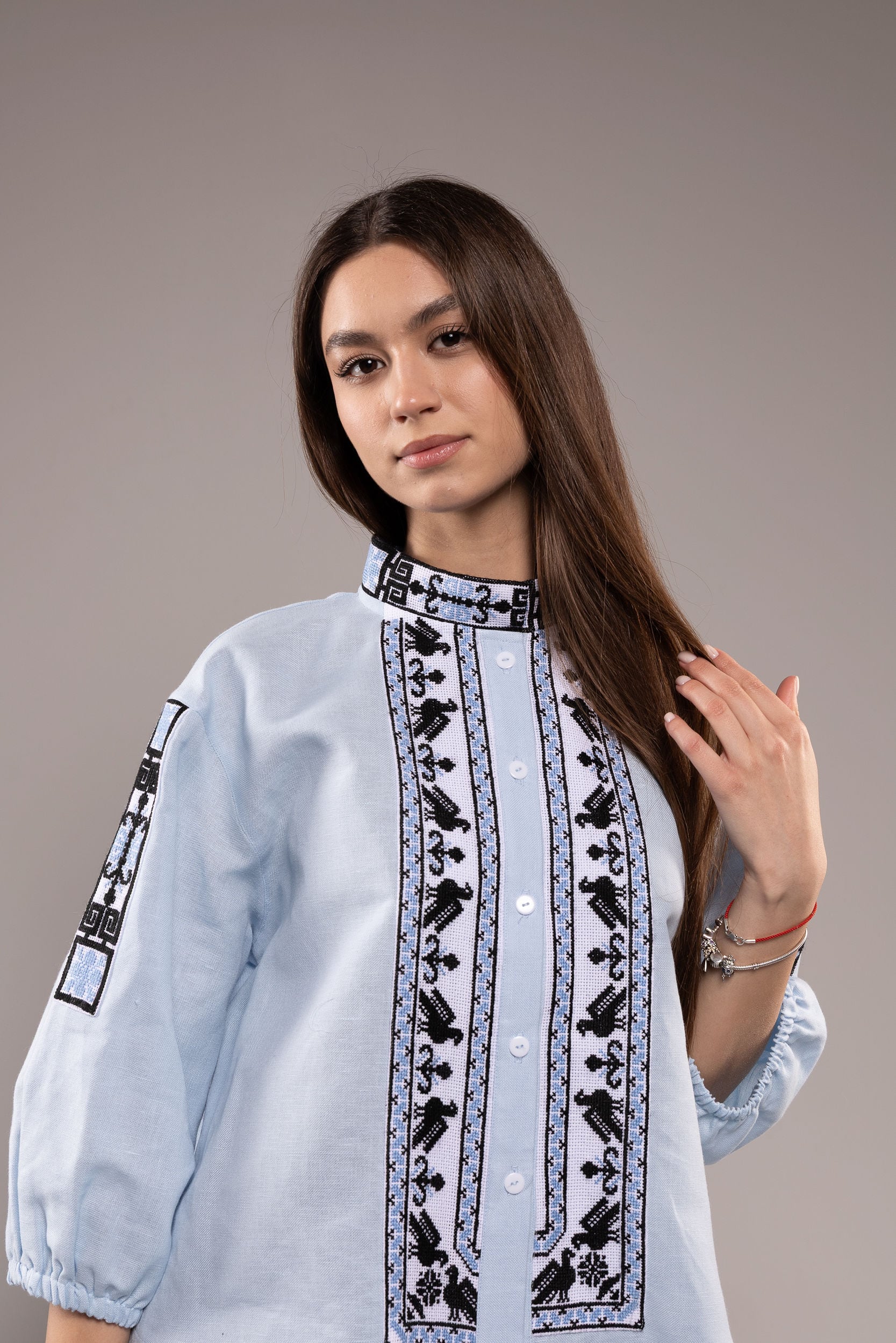 この作品は、ウクライナの伝統と美しさを象徴するヴィシヴァンカの刺繍を採用しています。過度な派手さを追求せず、日本の日常生活に自然に溶け込むデザインとなっております。しかし、それでいて洗練された高級感とカジュアルな雰囲気を両立させ、見る人を魅了する一着となっています。