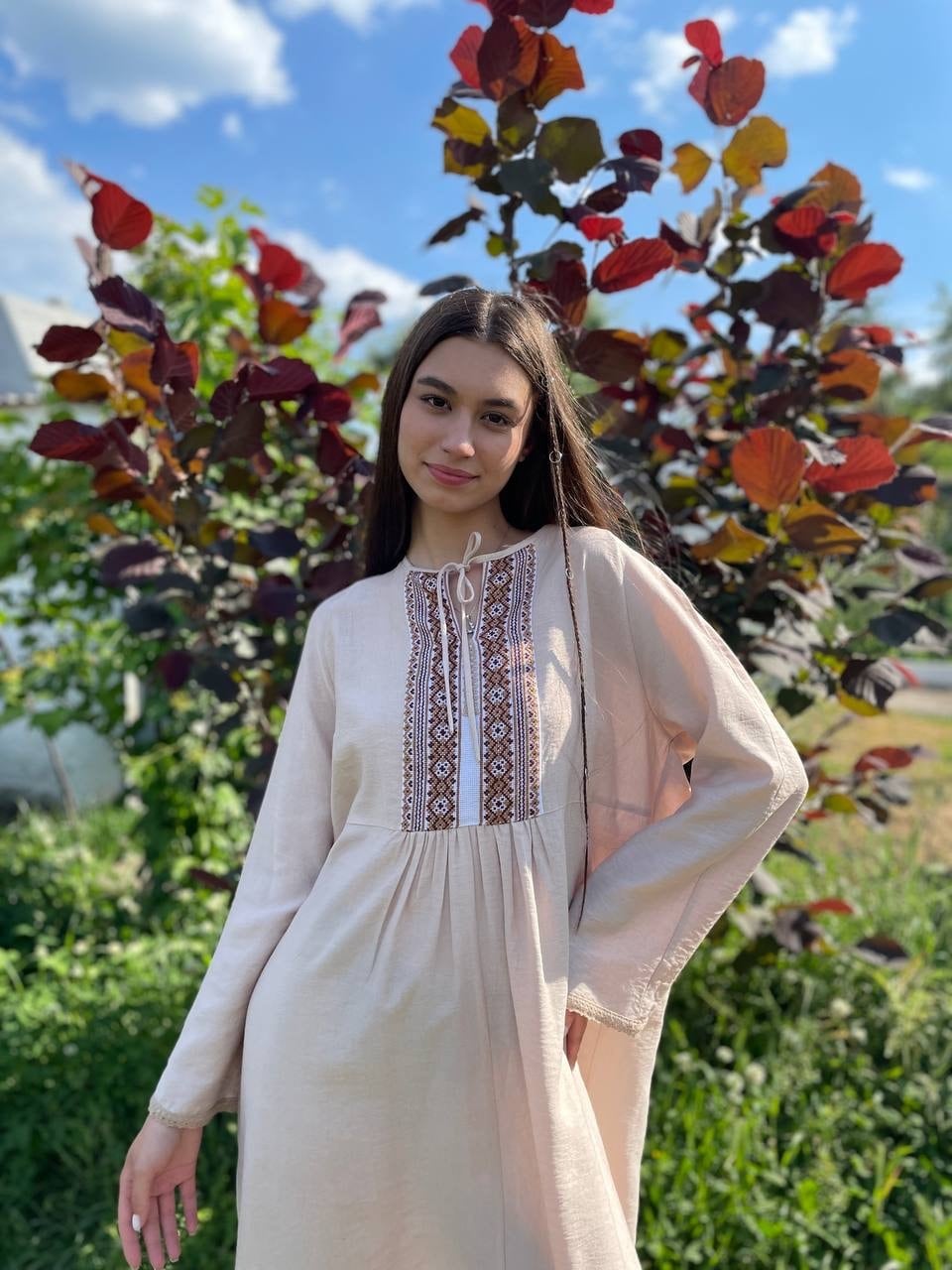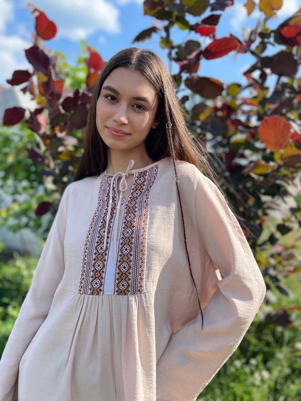 このドレスは、ウクライナの伝統と美しさを象徴するヴィシヴァンカの刺繍を採用しています。過度な派手さを追求せず、日本の日常生活に自然に溶け込むデザインとなっております。しかし、それでいて洗練された高級感とカジュアルな雰囲気を両立させ、見る人を魅了する一着となっています。