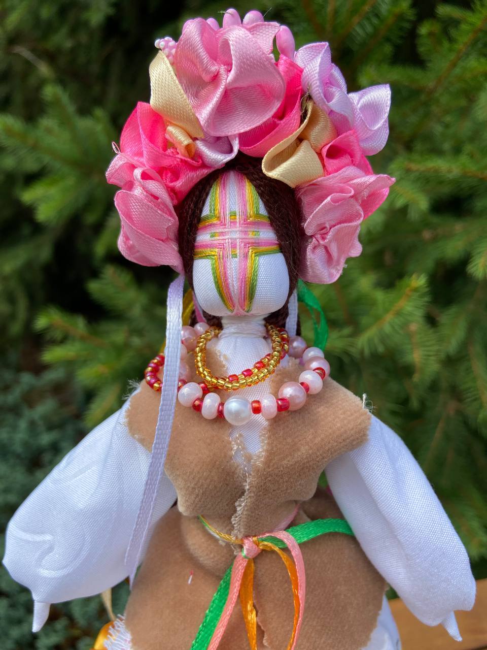 モタンカは「мотати(モターティ)」という動詞から名付けられ、針やハサミを使わずに布地を結んで作られる伝統的な人形です。これは、人形に目がないことにも繋がり、子供の魂が目を通して人形の中に入ることを防ぐための習慣です。