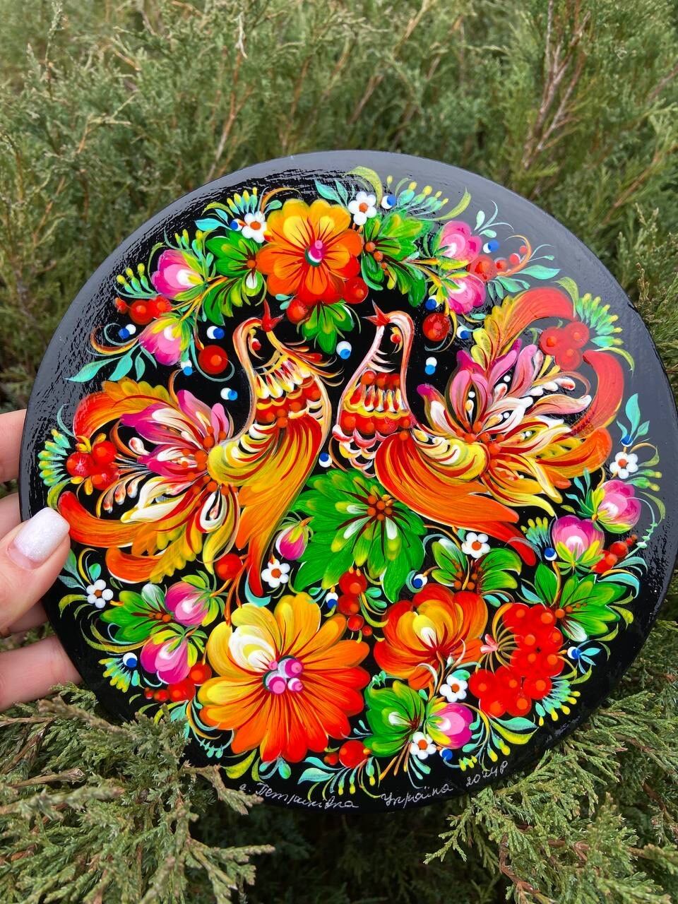 詳細:ペトリキフカ・プレートは、ウクライナの伝統的な芸術、ペトリキフカ塗りの精粋を表現する逸品です。この芸術は、ドニプロ近郊のペトリキフカ村にてユネスコ無形文化遺産登録の際にウクライナ国家名誉職人として任命されたヴァレンティナ・ホロベッツによって描かれています。