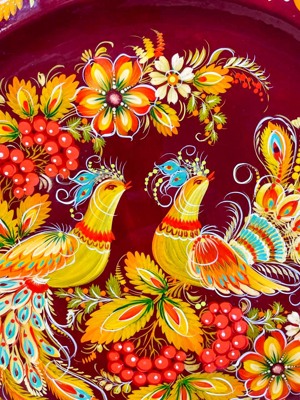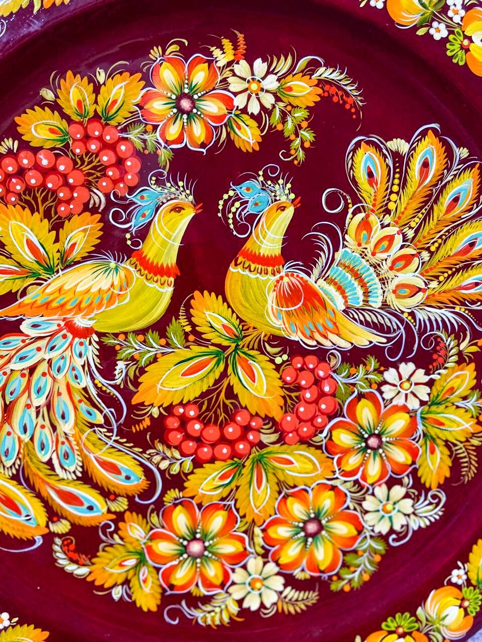 詳細:このペトリキフカ・プレートは、ウクライナの伝統的な芸術、ペトリキフカ塗りの精粋を表現する逸品です。この芸術は、ドニプロ近郊のペトリキフカ村にて代々受け継がれてきたペトリーヴナ家の手によって生み出されています。ホメンコ・ヴァレンティーナ・ペトリーヴナは、ウクライナを代表するユネスコ無形文化遺産に登録される人間国宝、その伝統を受け継ぐ現代の名工です。中でもこの作品は、ホメンコ作品の2025年始まっての最高傑作の一つとなります。