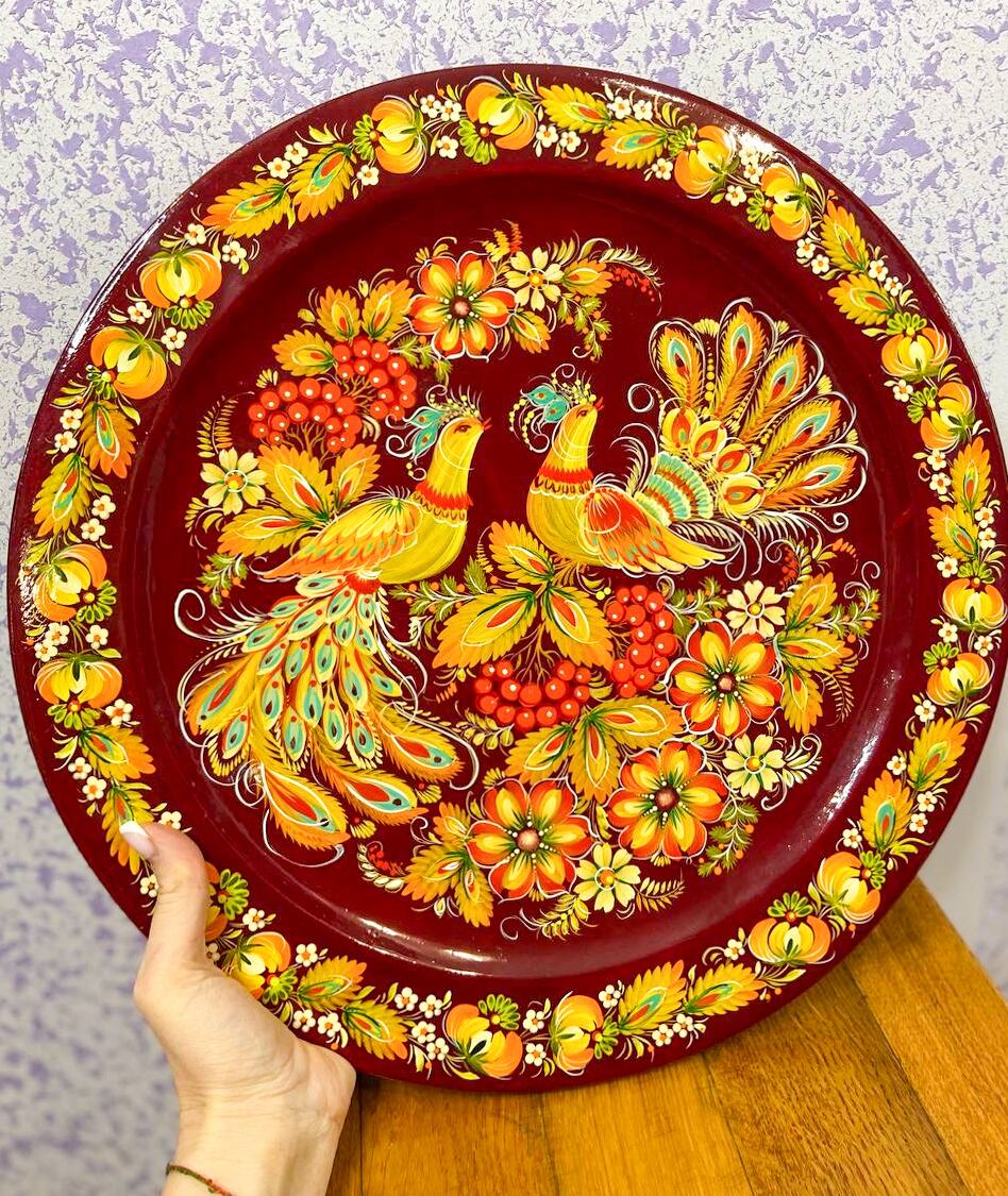 この美しいプレートは、ペトリキフカ村のシナノキゾクの樹木から一から手作業で切り彫られ、細部にわたって丁寧に仕上げられています。シナノキの木材は、ウクライナでは御守りとしての意味を持ち、幸運と安全をもたらすと信じられています。